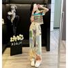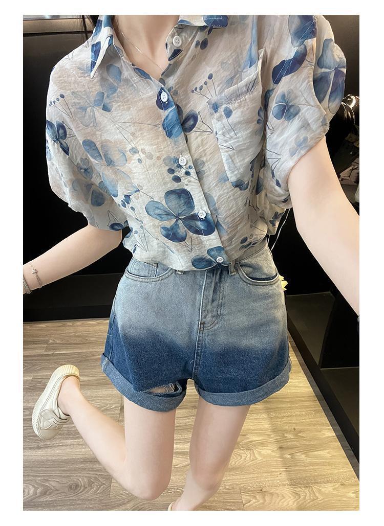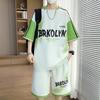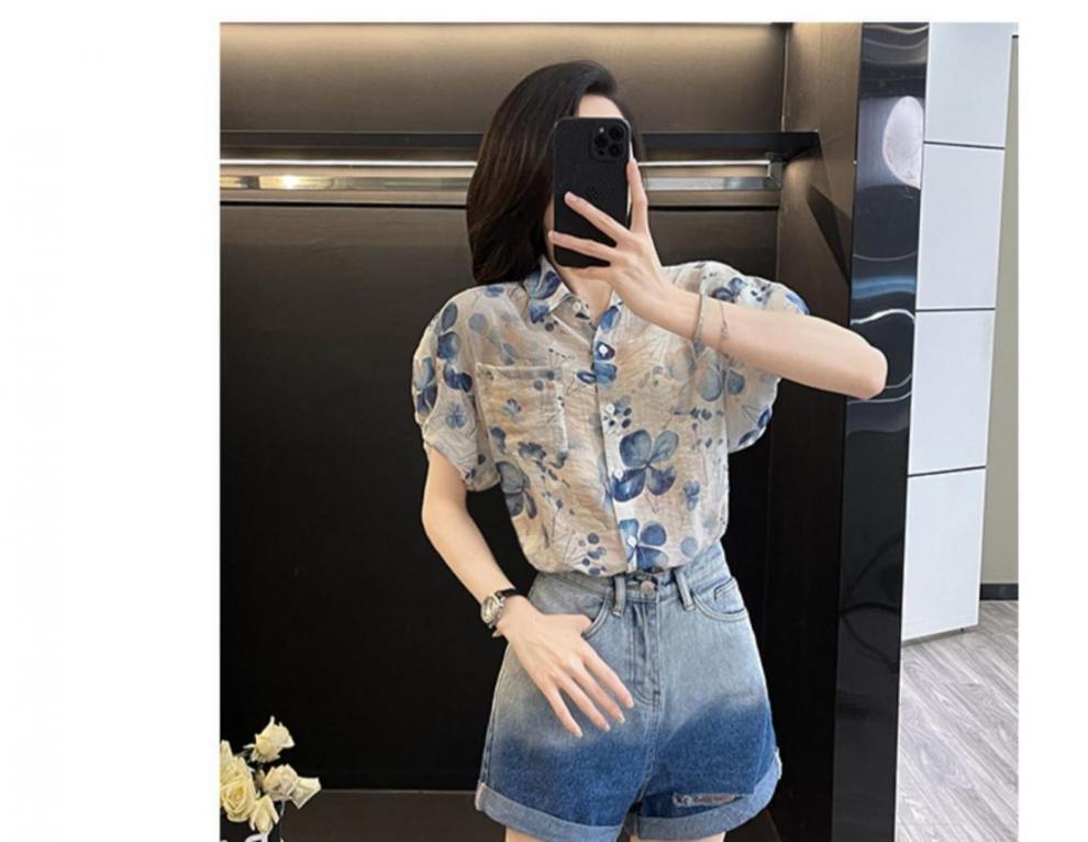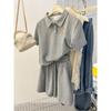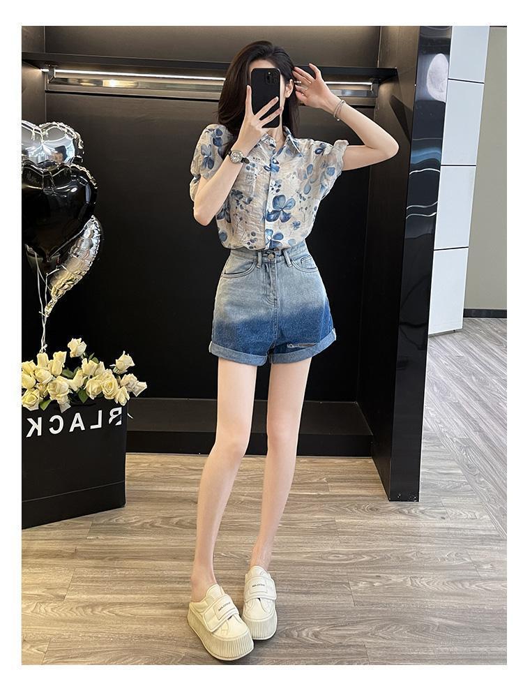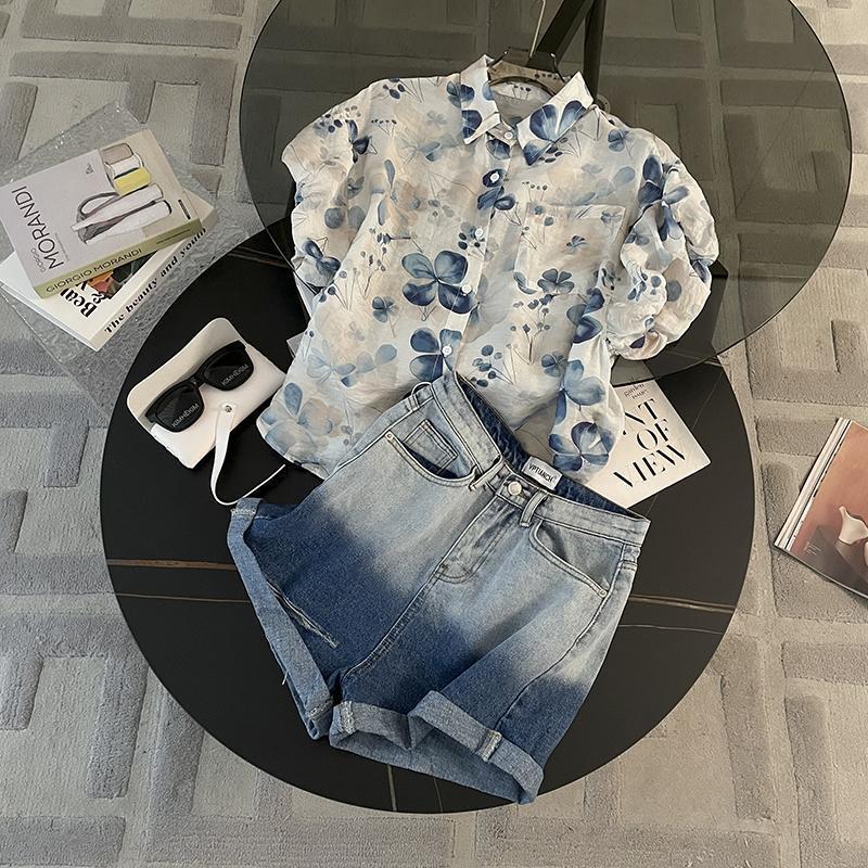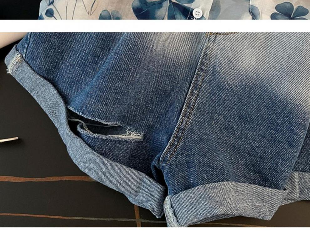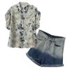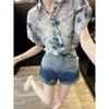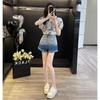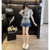 Traje deportivo casual de dopamina para mujer, verano, calle, frito, reductor de edad, moderno, camisa pequeña, shorts de mezclilla, conjunto de dos piezas