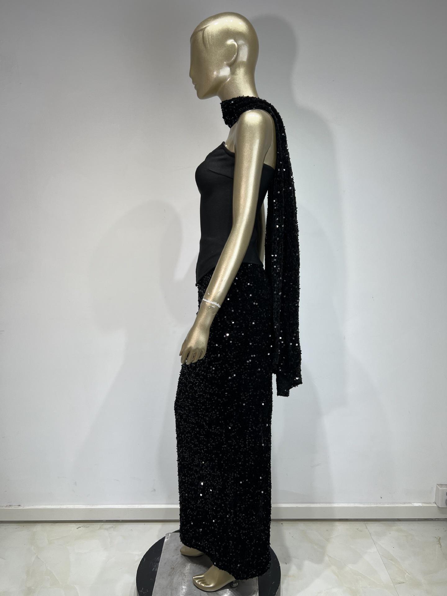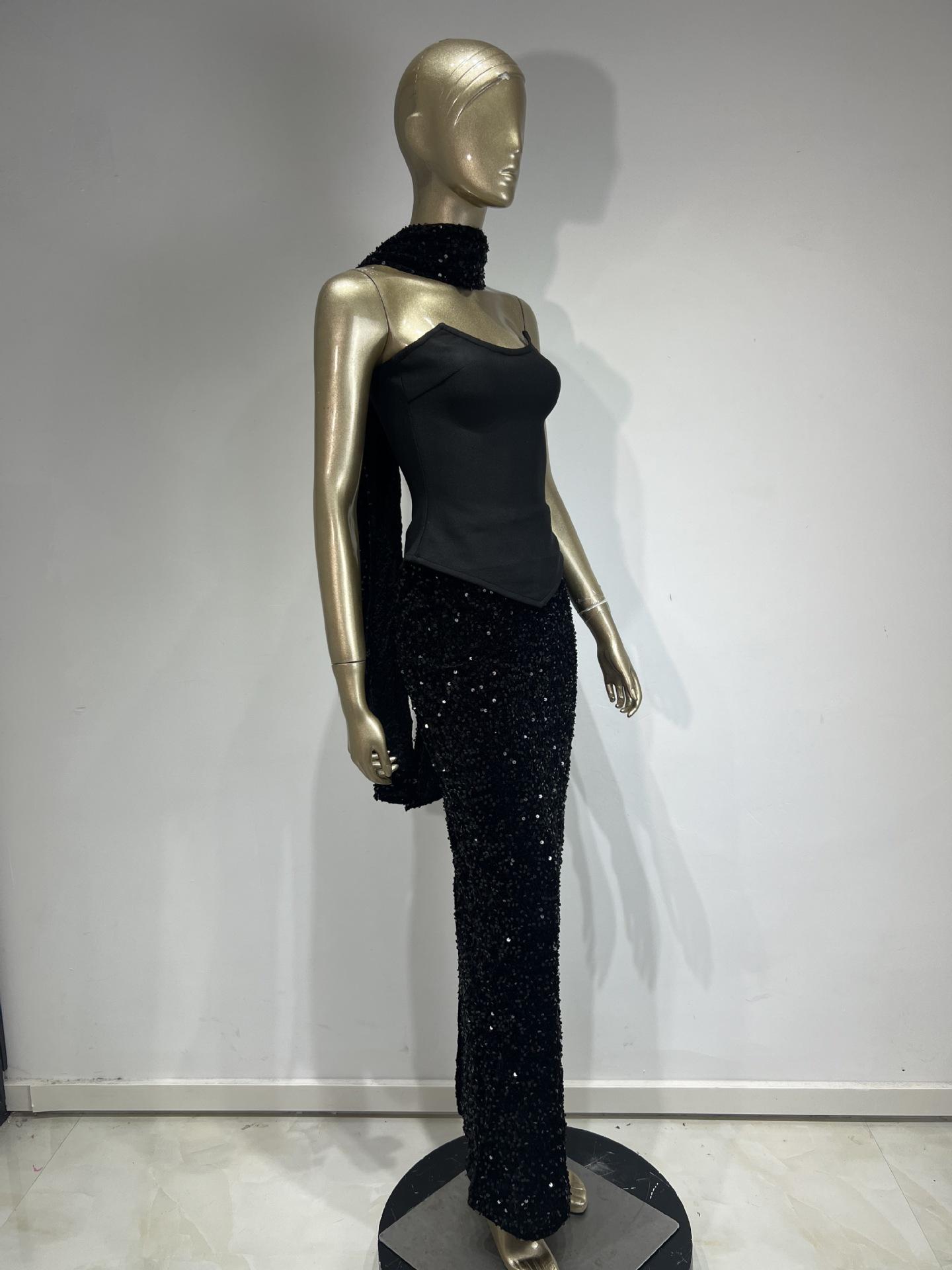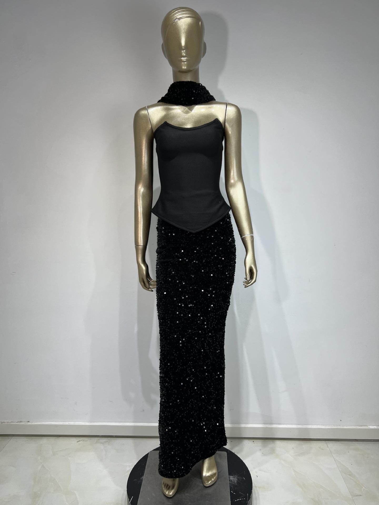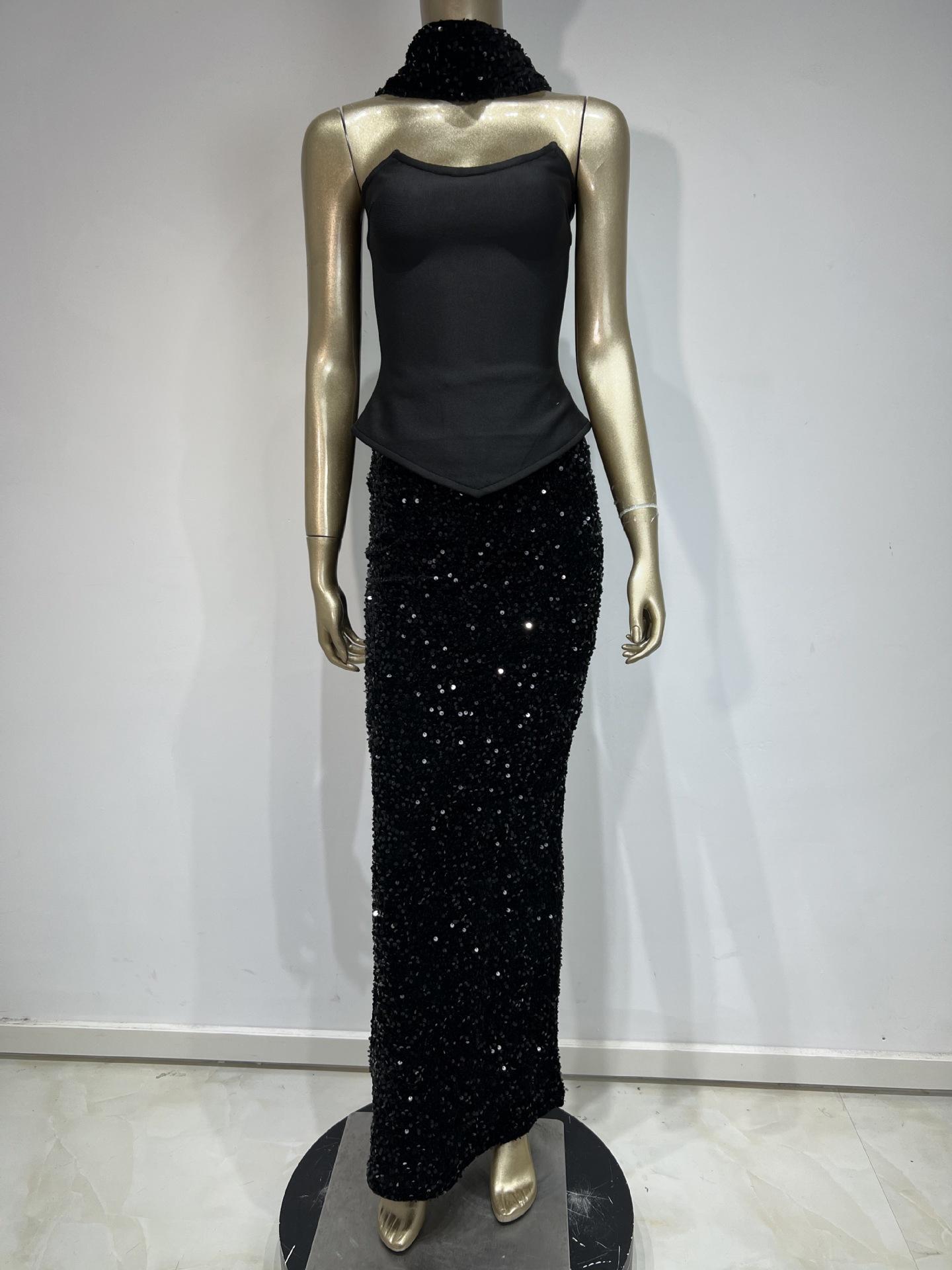 Amazon Aliexpress Popular Vestido de Fiesta Banquete Traje Vendaje Tubo Top Falda Larga Lentejuelada Conjunto de Dos Piezas