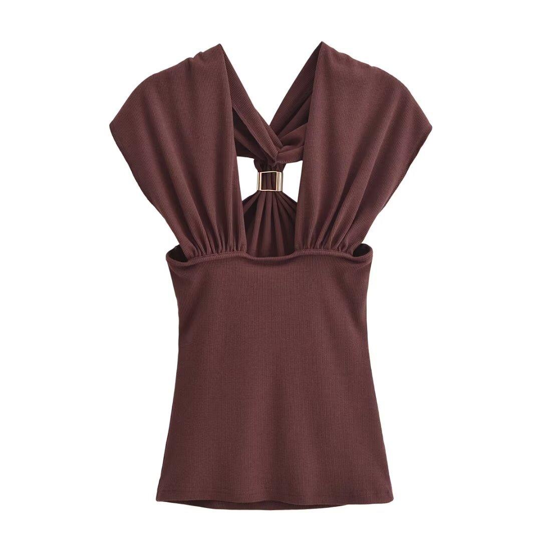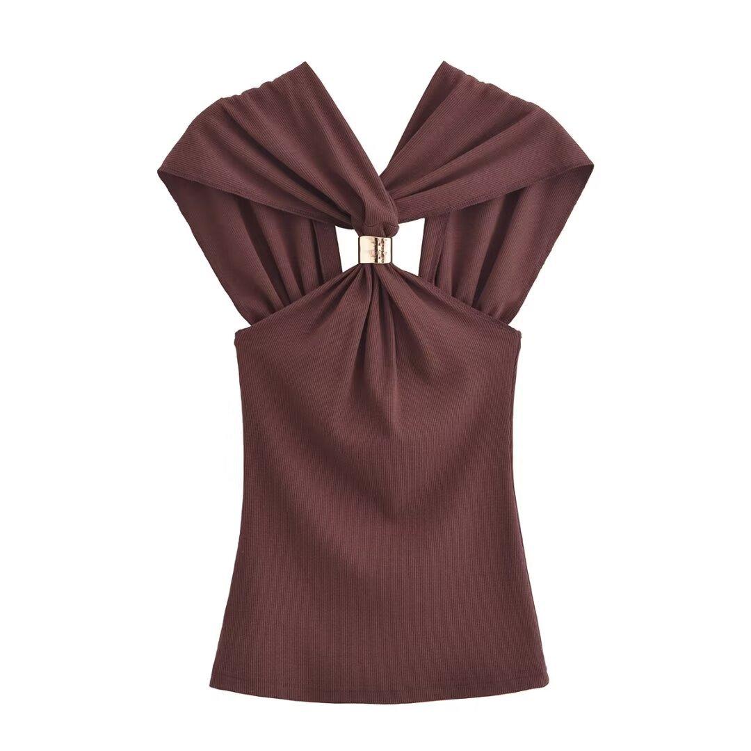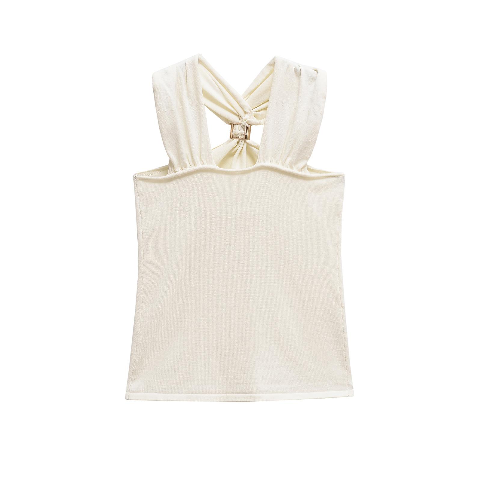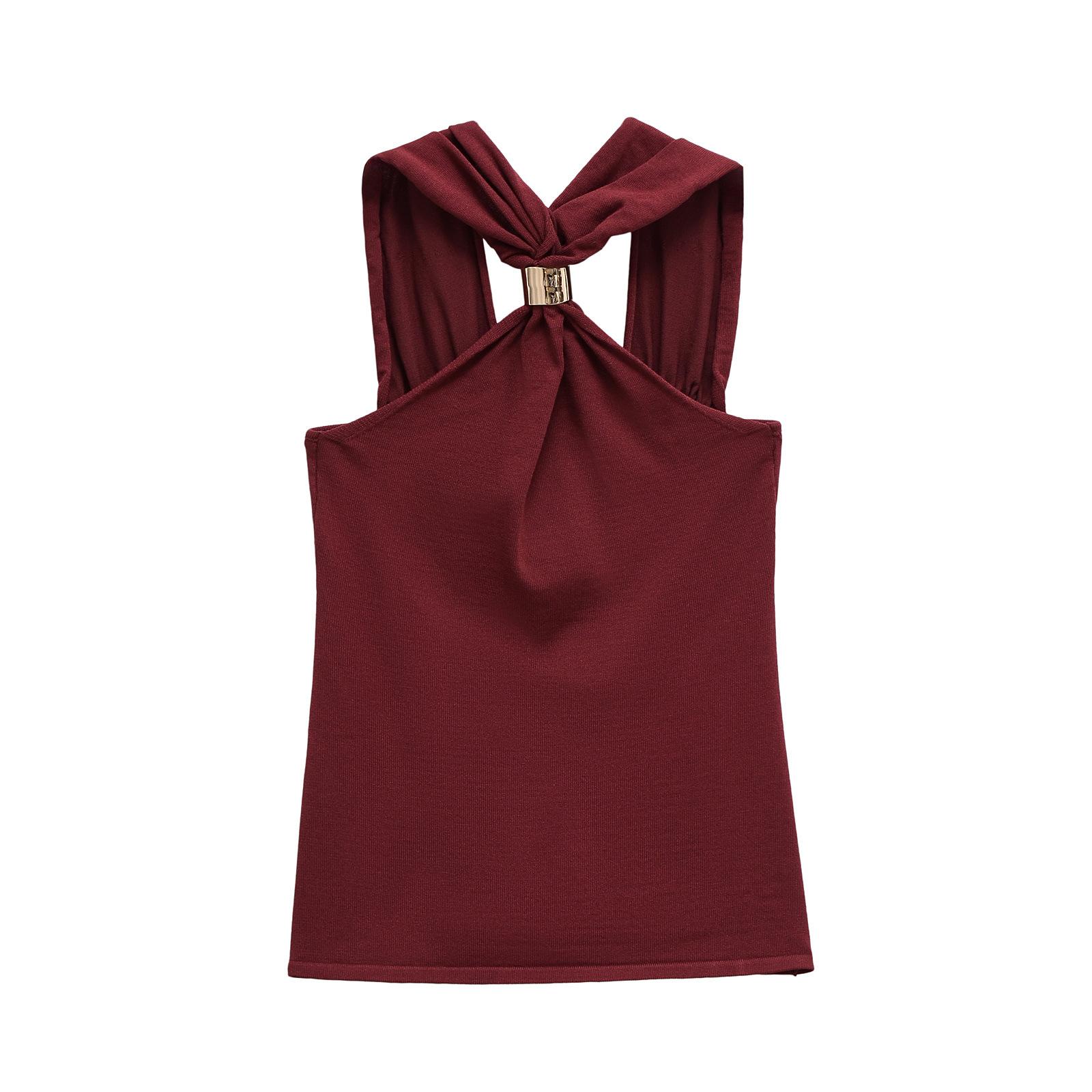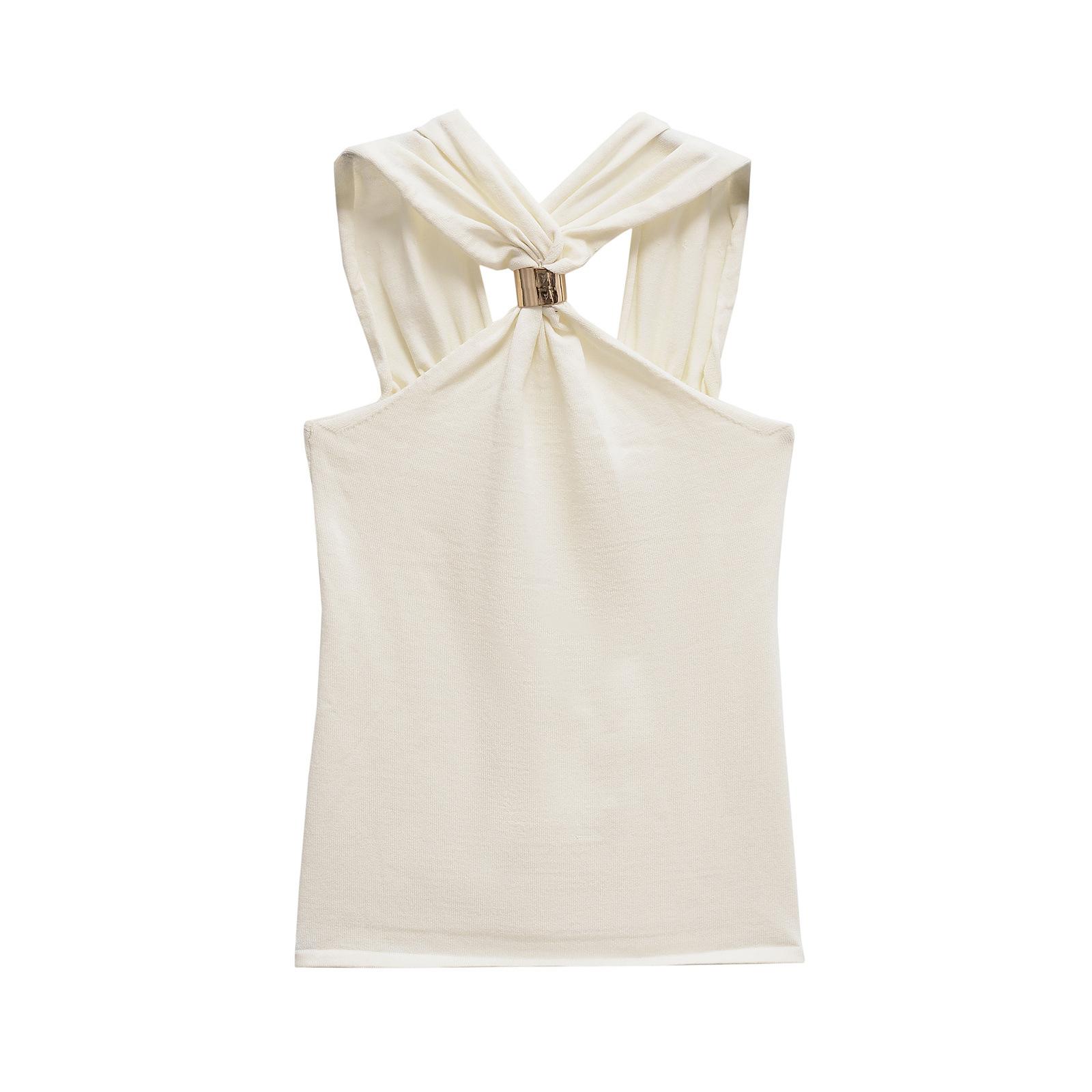 Ropa de mujer europea y americana transfronteriza primavera y verano 2025 nueva blusa de punto con cuello colgante y tirantes anchos con incrustaciones de metal 4938116