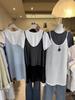 Vestido Coreano de Punto de Malla Media Pierna con Tirantes y Camiseta de Cuello Redondo de Color Puro, Conjunto de Dos Piezas Suave y Dulce para Mujer