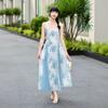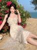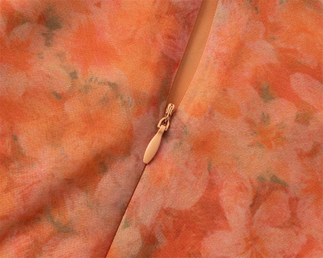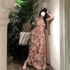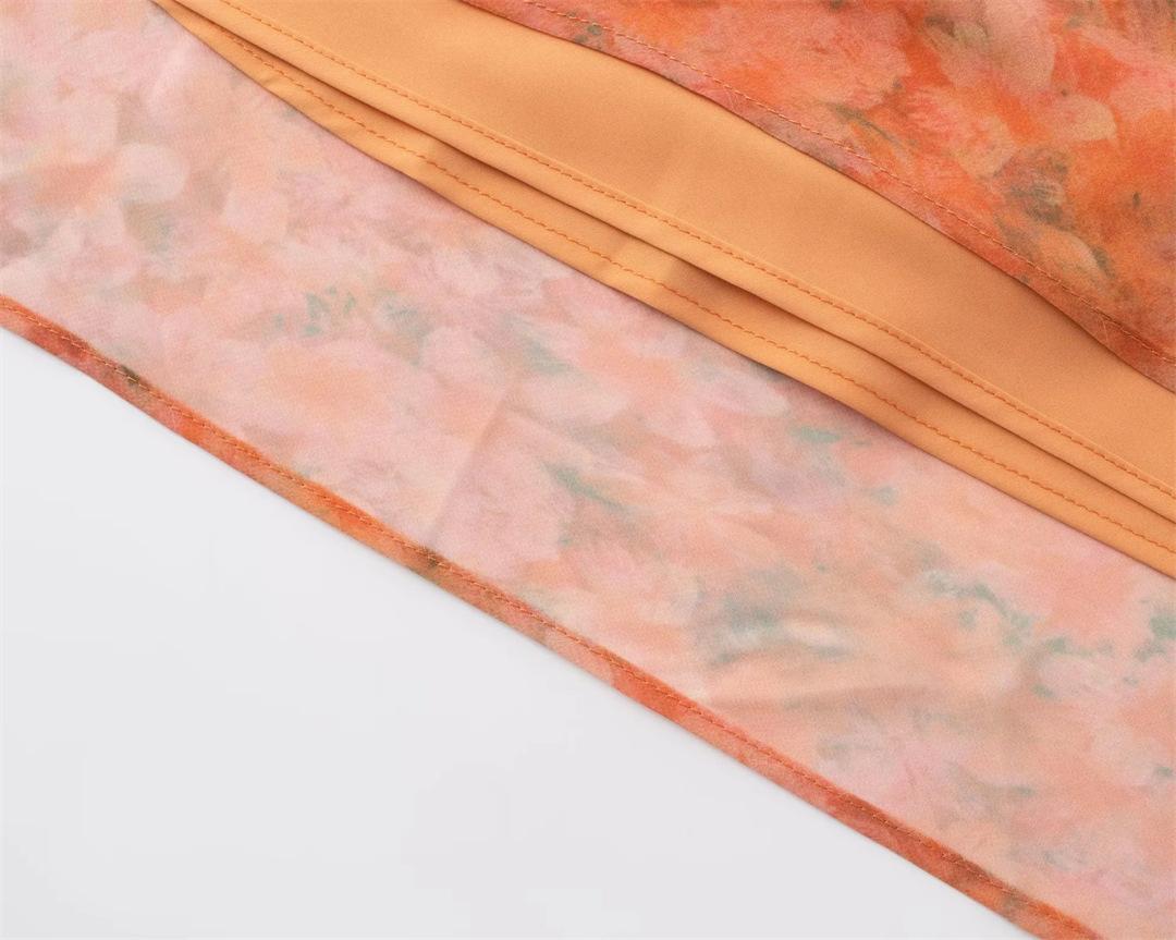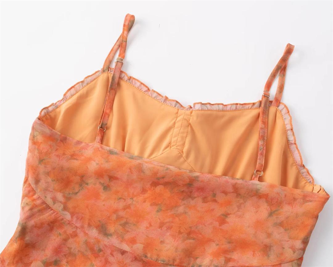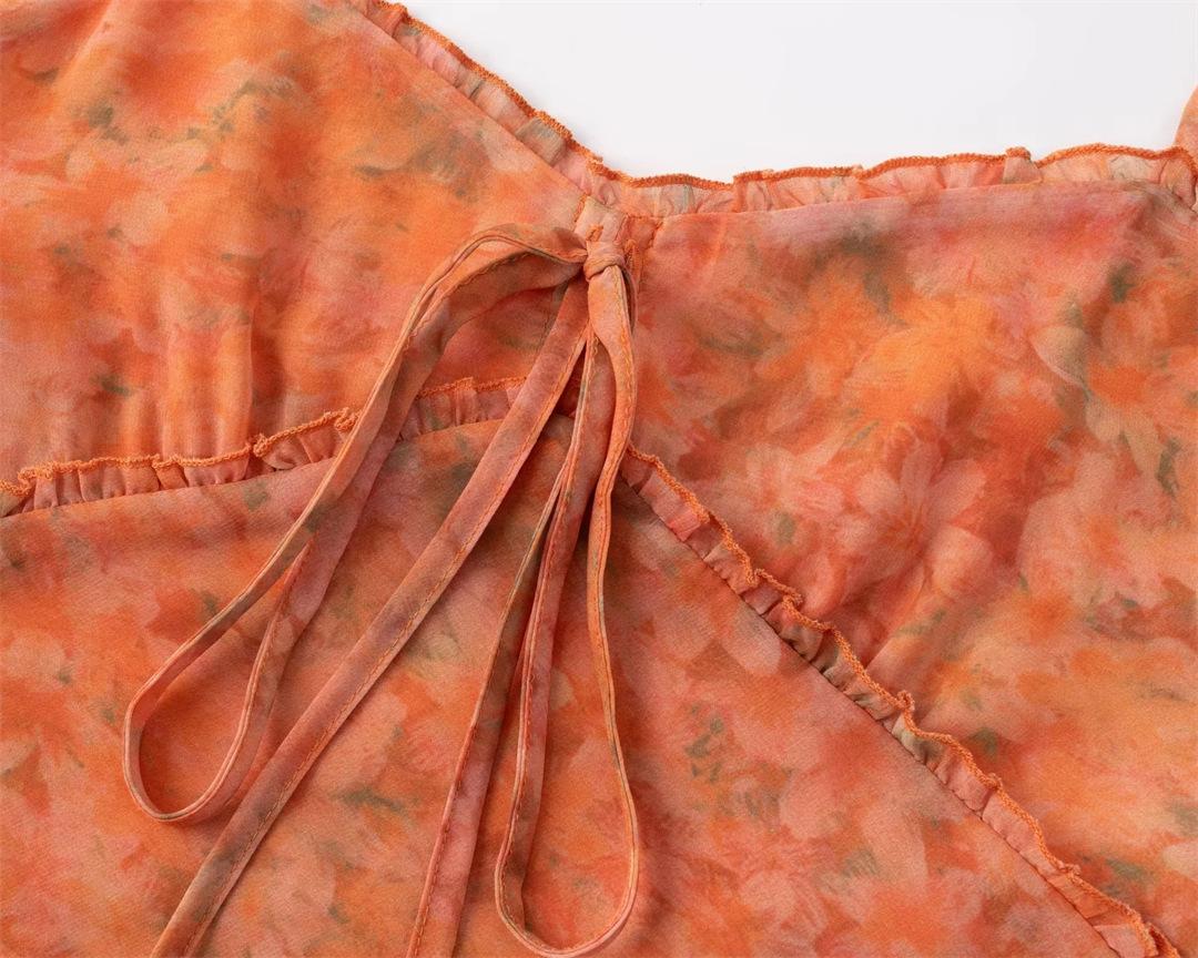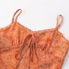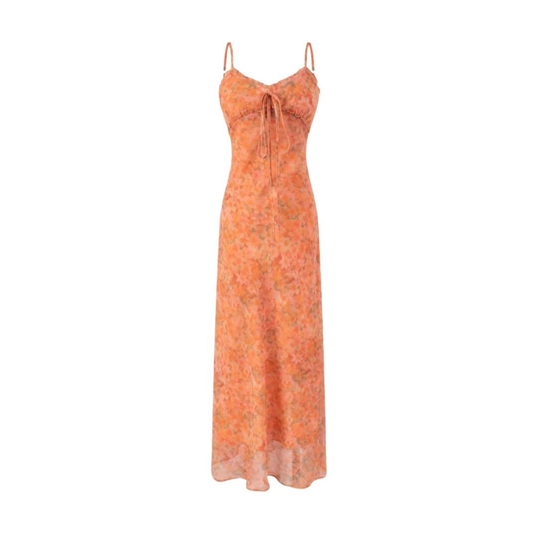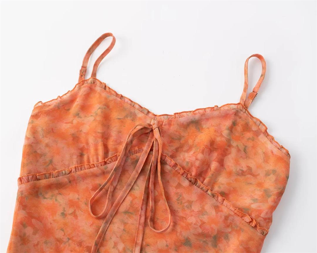 Vestido largo playero con tirantes para mujer, escote en V, lazo en el pecho, encaje, estampado floral naranja atardecer, para verano