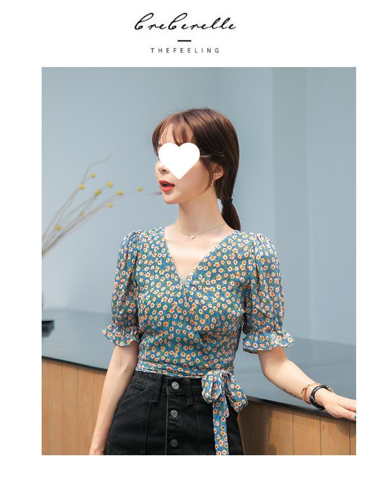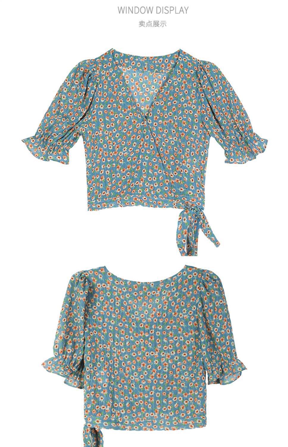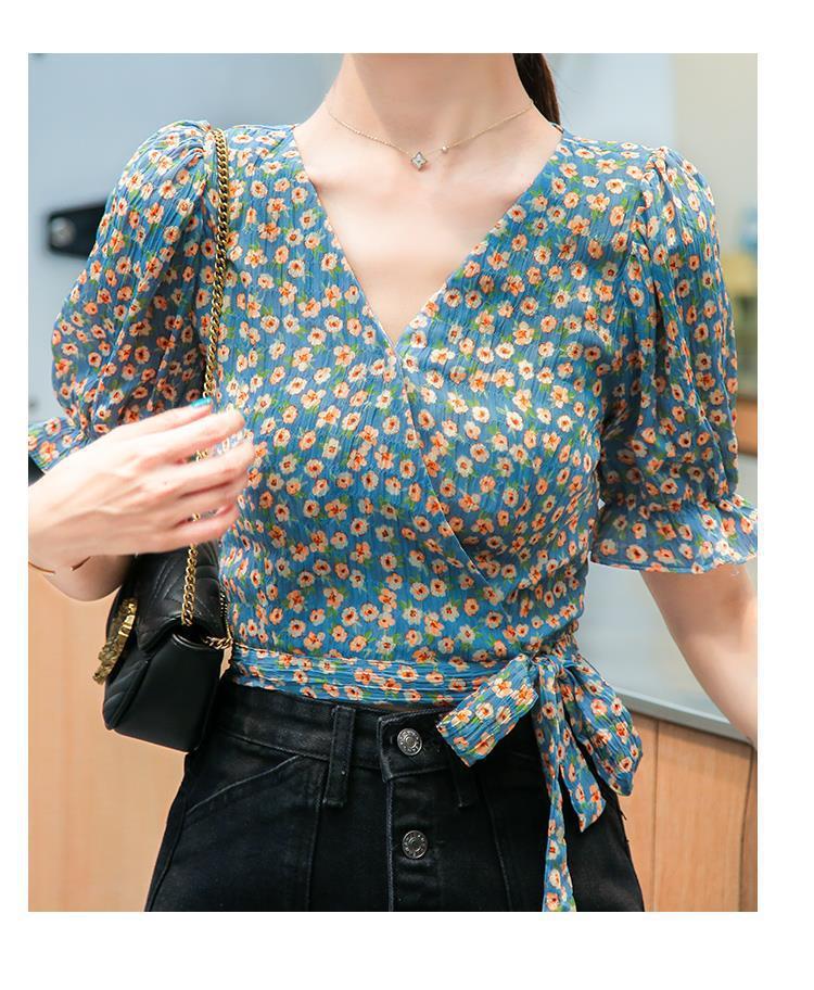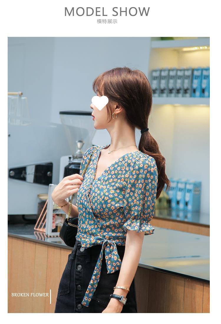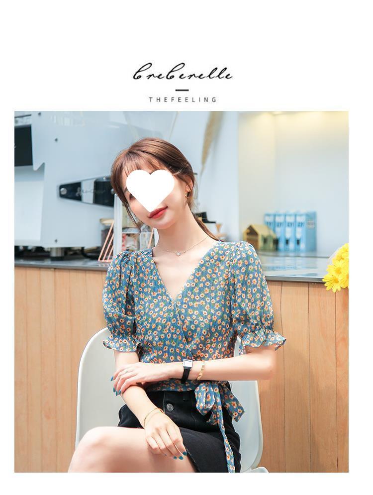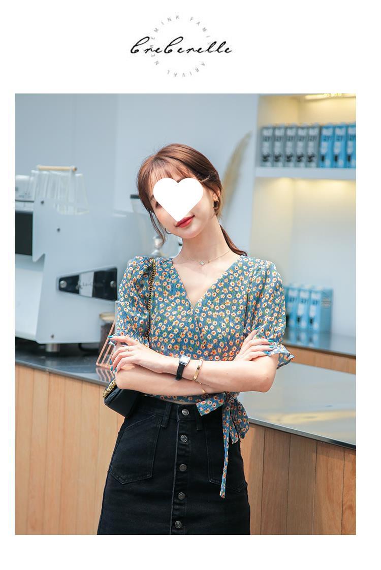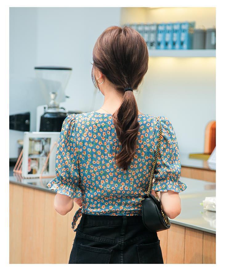 Camisa de Chifón Dulce de Nicho Francés de Verano para Mujer de Manga Corta Estilo Occidental Floral Camisa Corta de Manga Abullonada