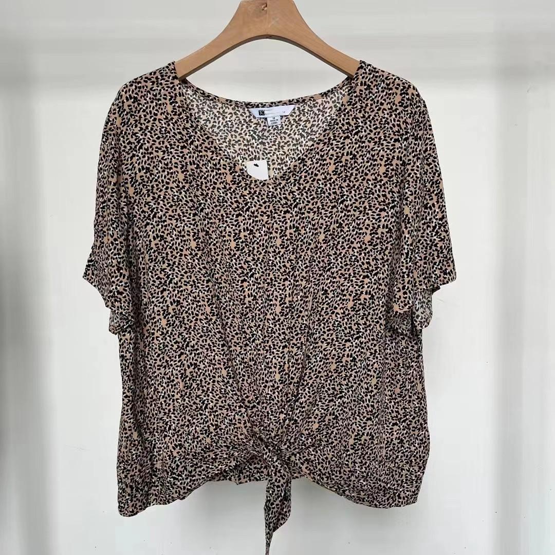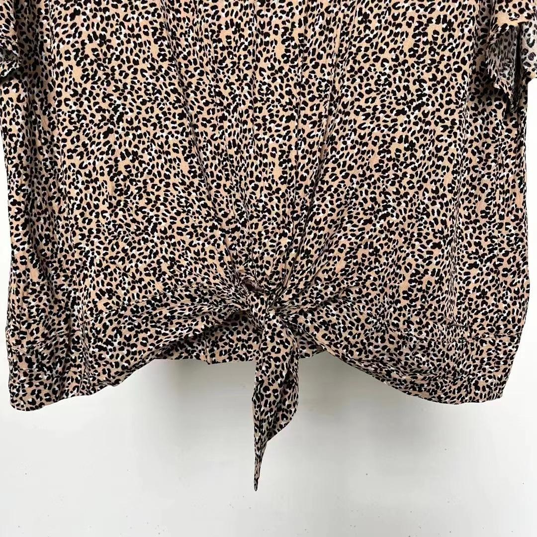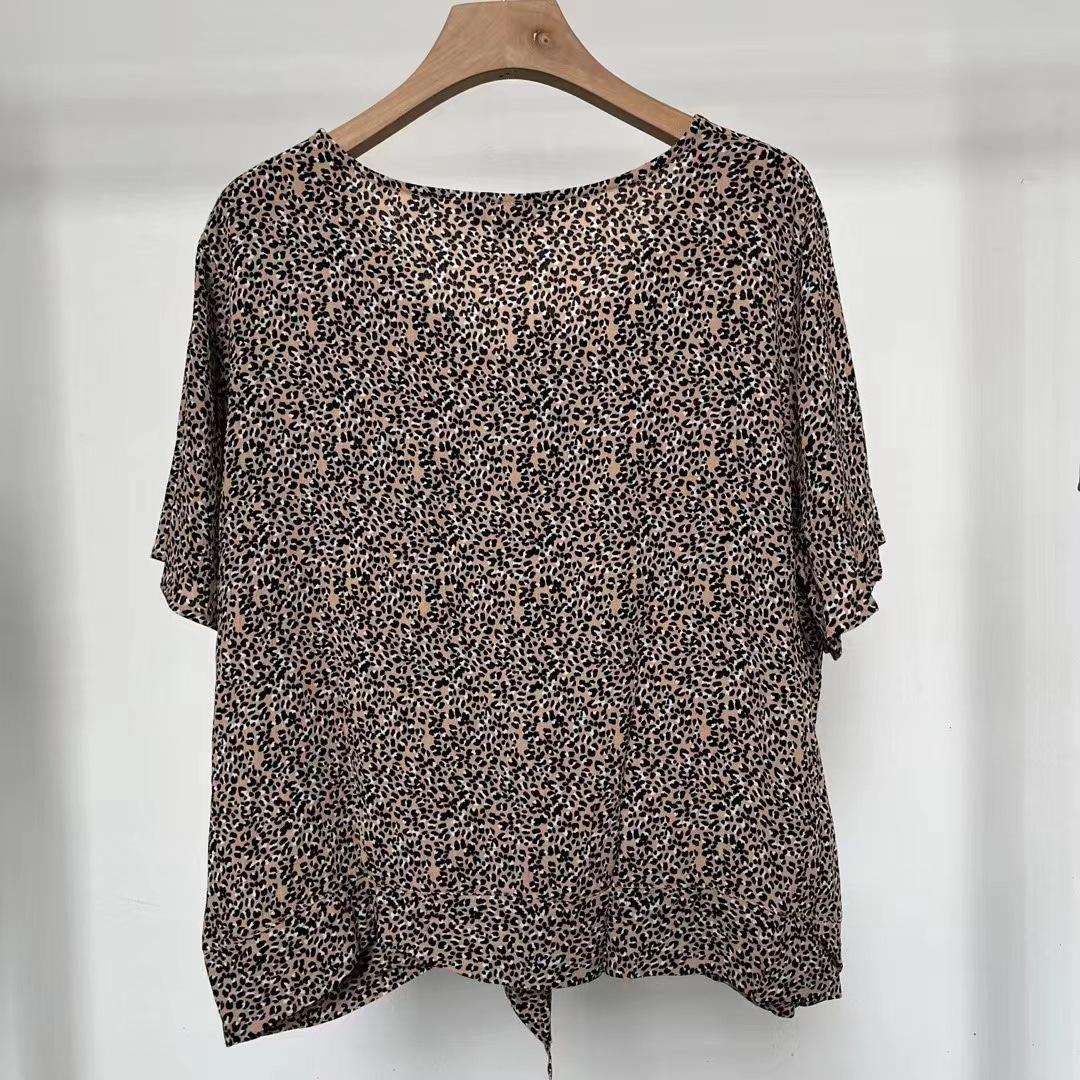 Camiseta de manga corta para mujer, Top de verano anudado de rayón con estampado de leopardo y cuello en V para mujer, Suministro de exportación de ropa para mujer
