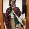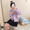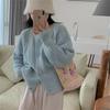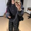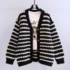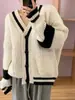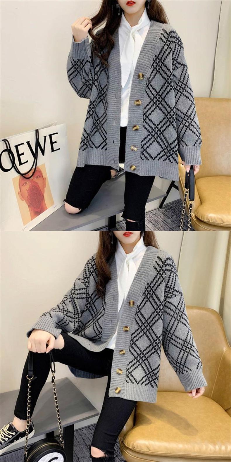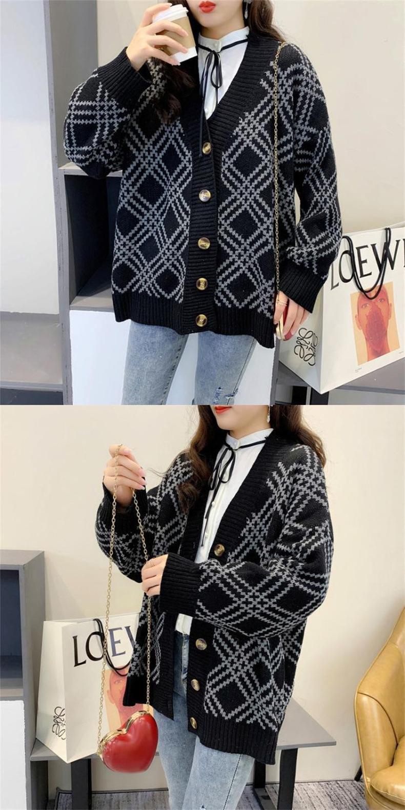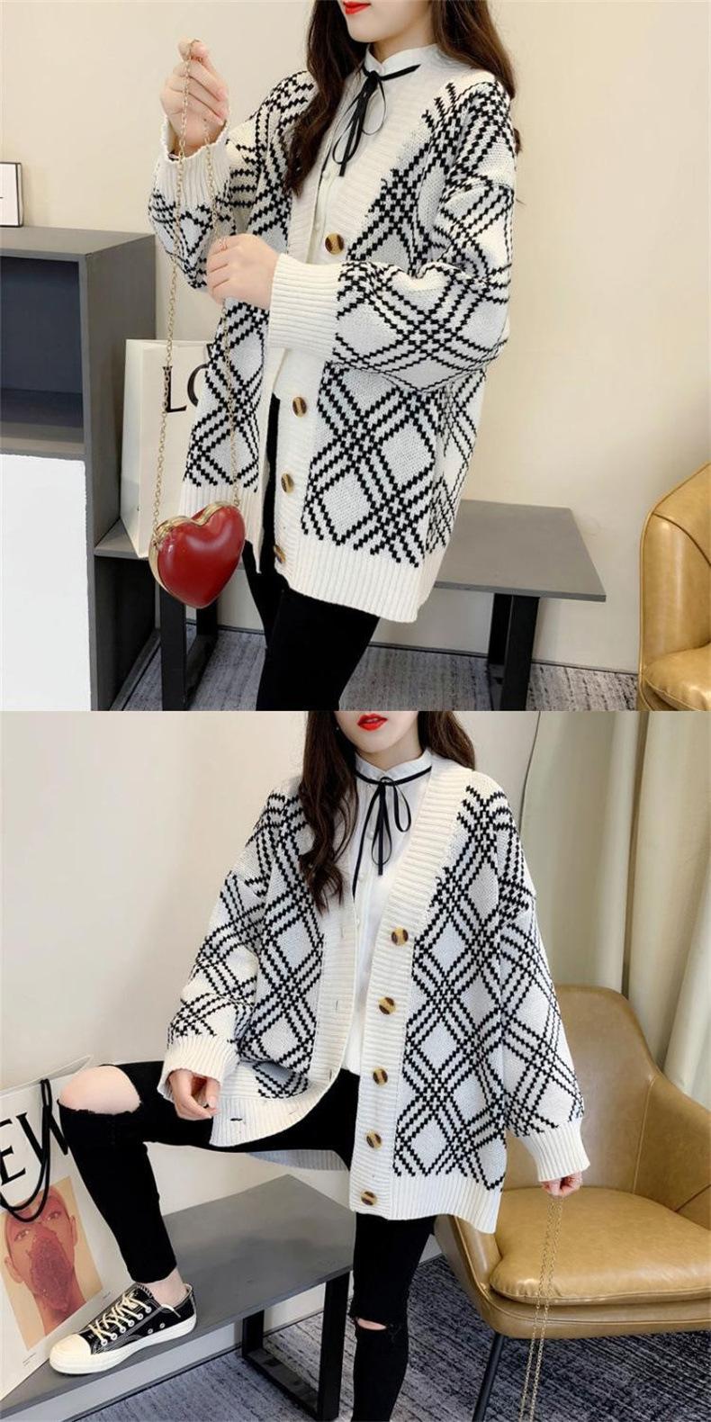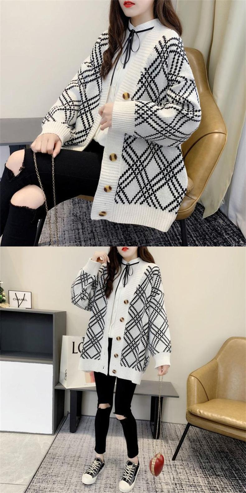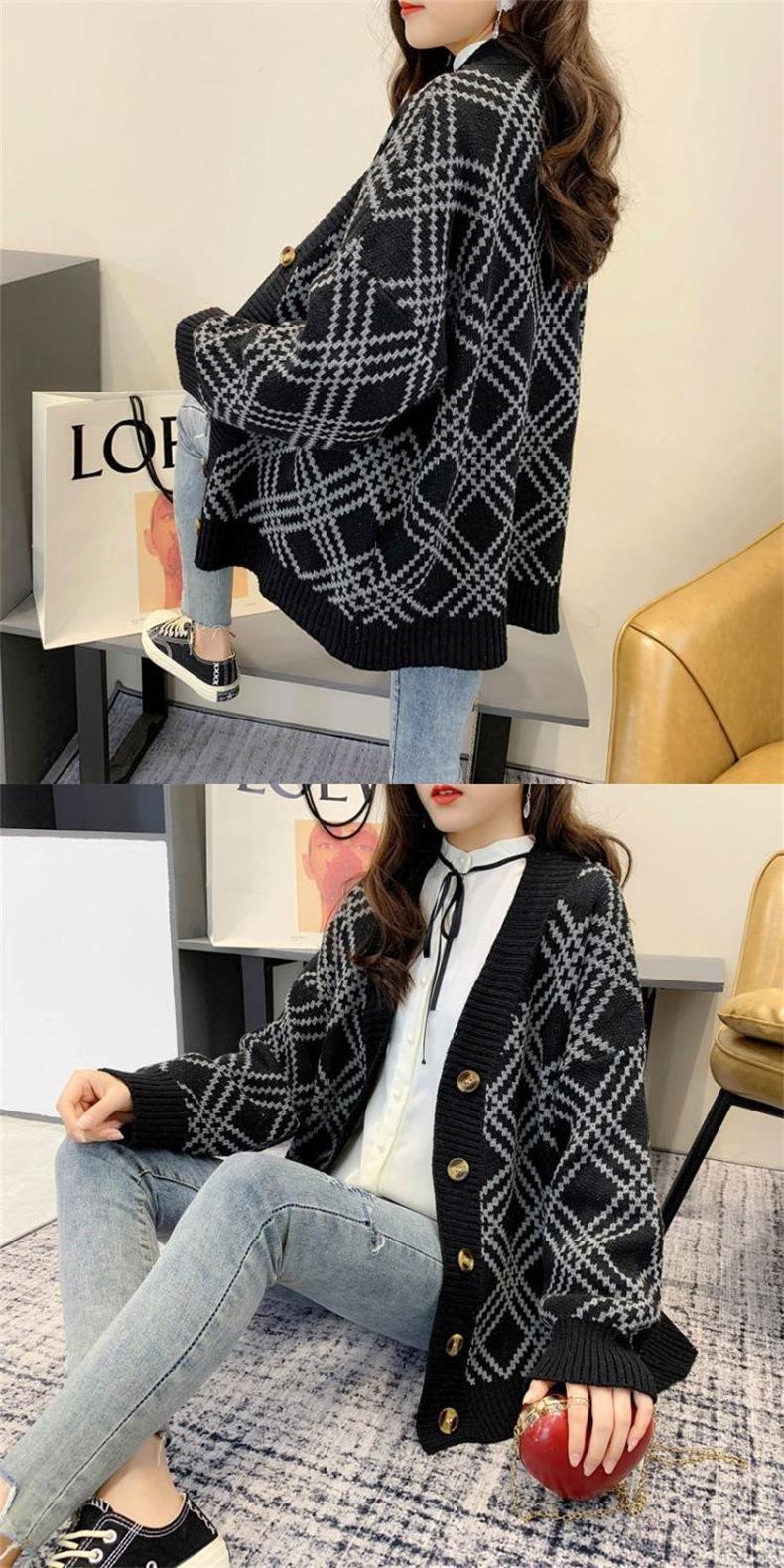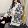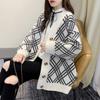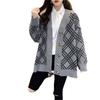 Suéter estilo japonés retro estilo perezoso a cuadros con cuello en V para mujer, cárdigan de punto holgado de longitud media para otoño e invierno