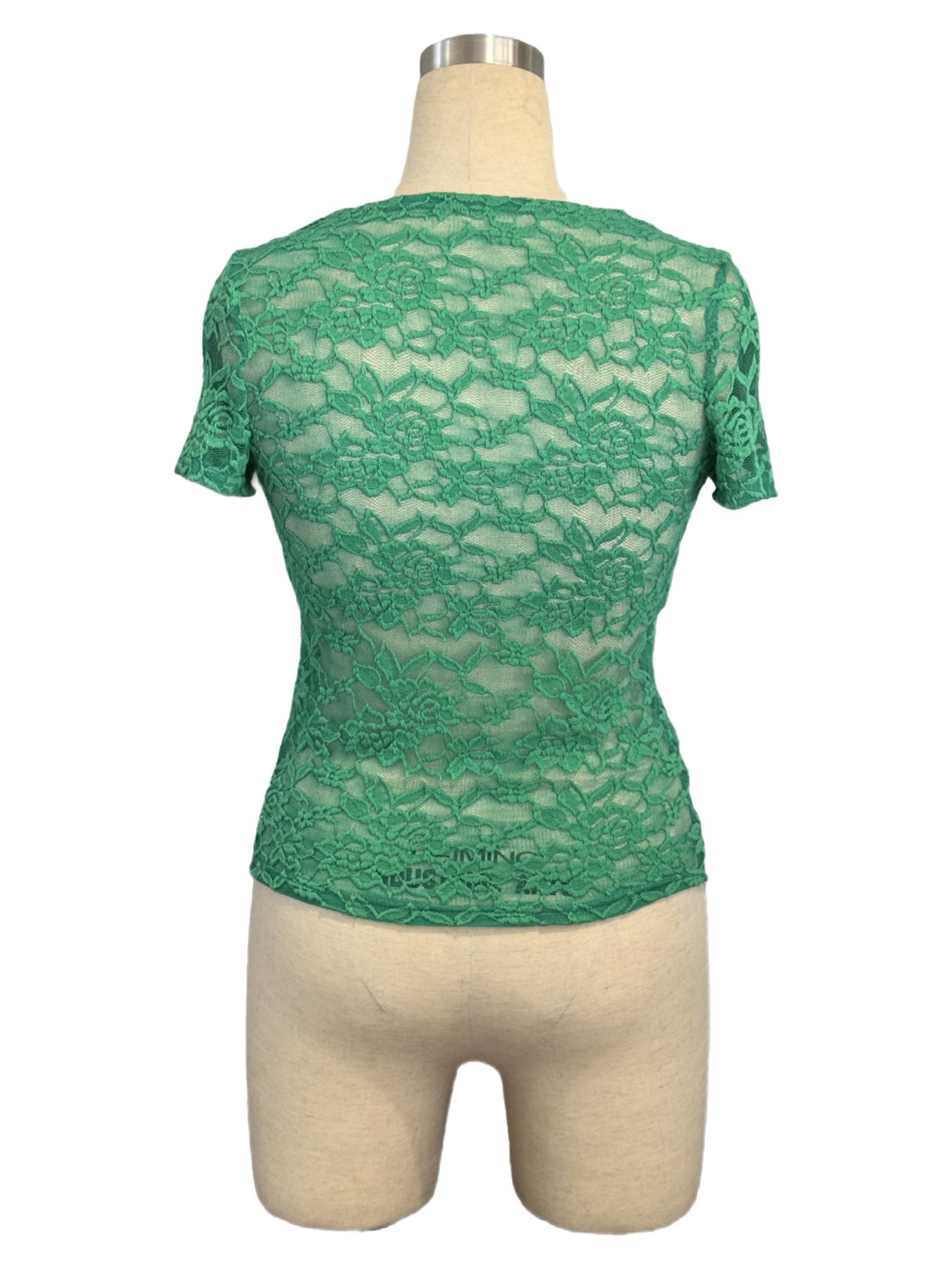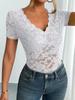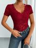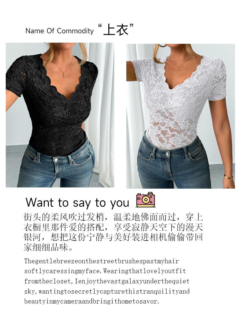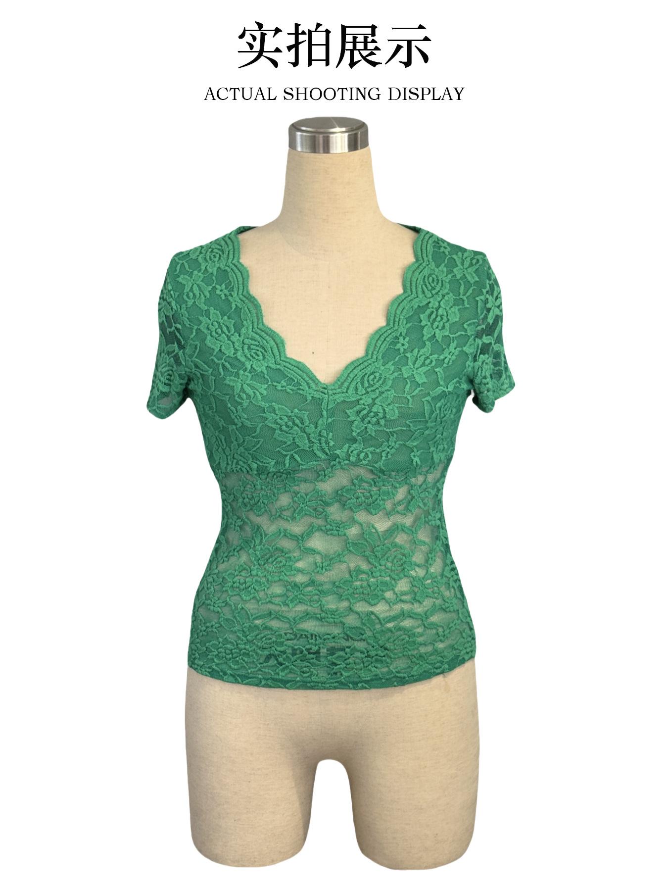 Europeo y Americano Transfronterizo Amazon 2025 Primavera y Verano Nuevo Camiseta Básica de Encaje Sexy de Color Sólido para Mujer con Cuello en V y Manga Corta