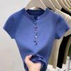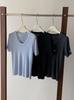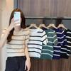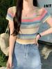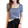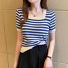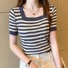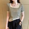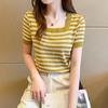 Camiseta de manga corta de hilo entallado para mujer, suéter de punto a rayas de seda fina con cuello cuadrado, novedad de verano de 2025