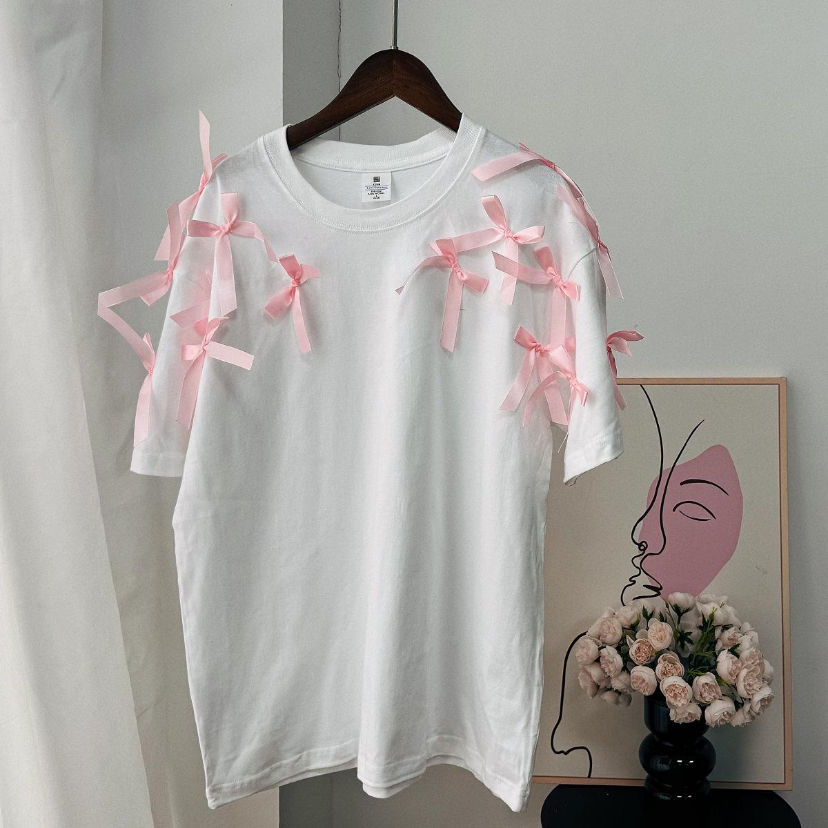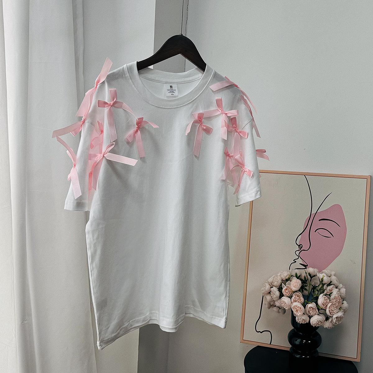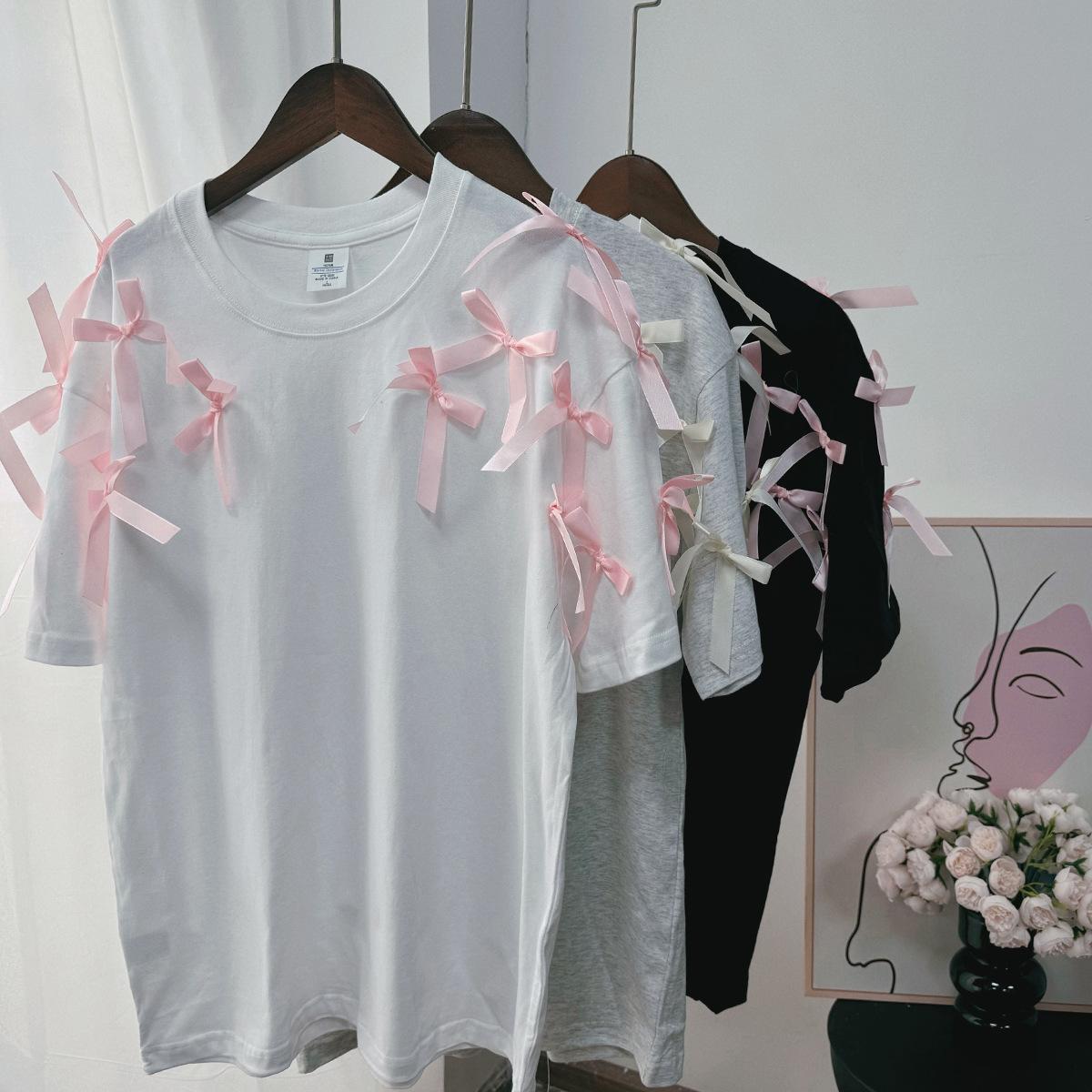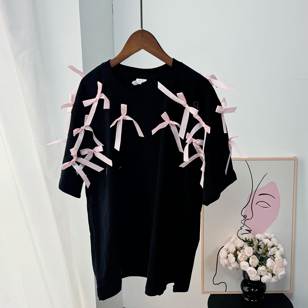 En stock, camiseta holgada de manga corta con lazo de cinta para niña, estilo europeo y americano, top informal de algodón holgado.