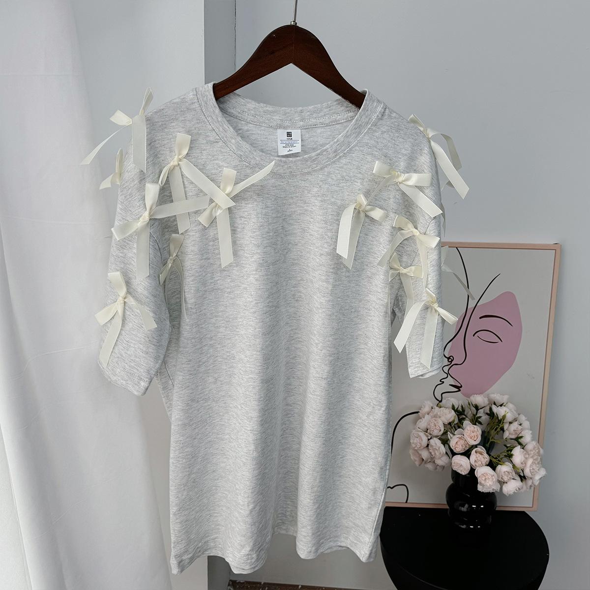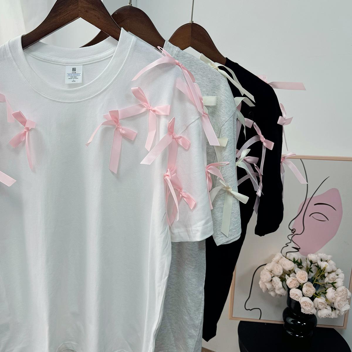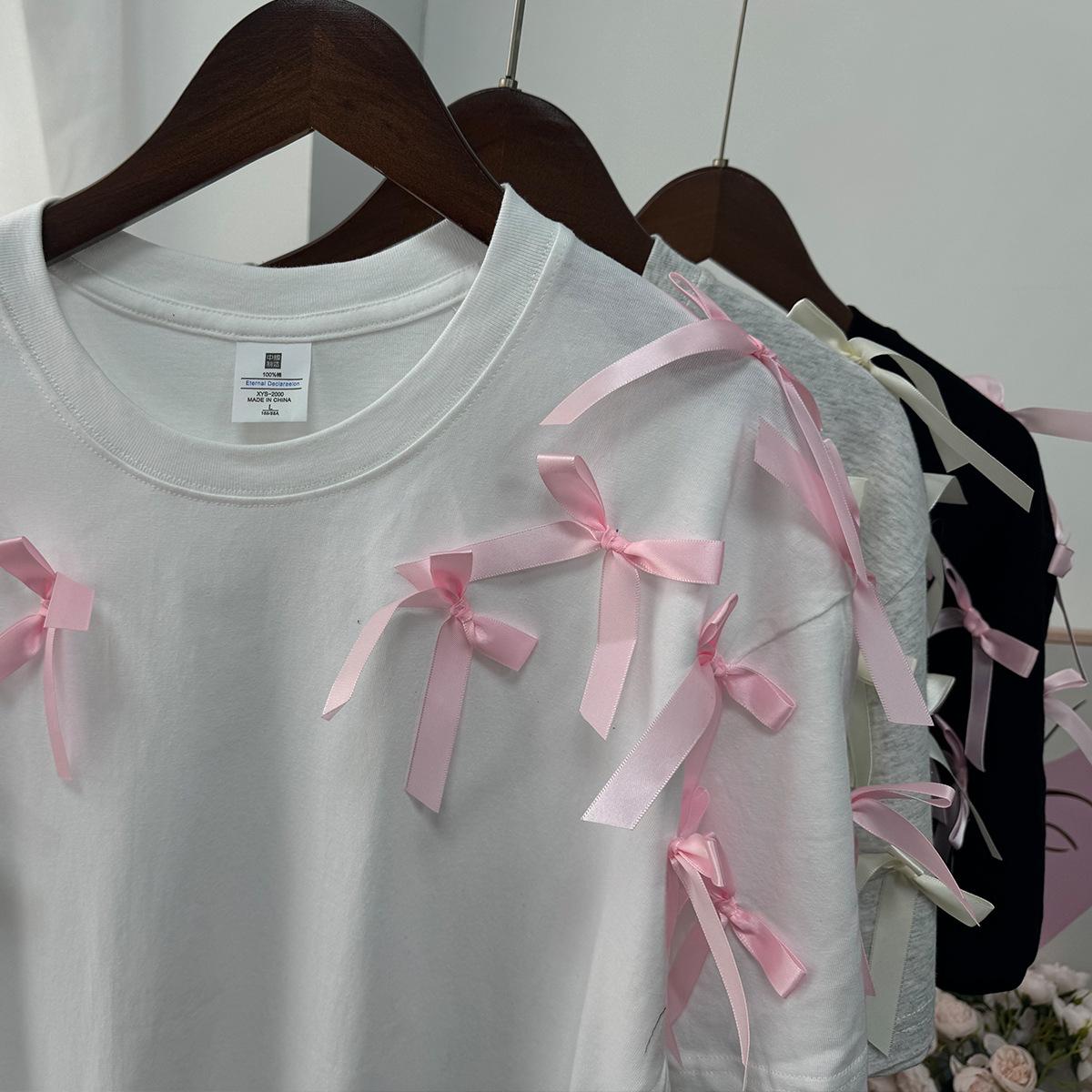 En stock, camiseta holgada de manga corta con lazo de cinta para niña, estilo europeo y americano, top informal de algodón holgado.