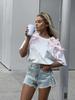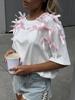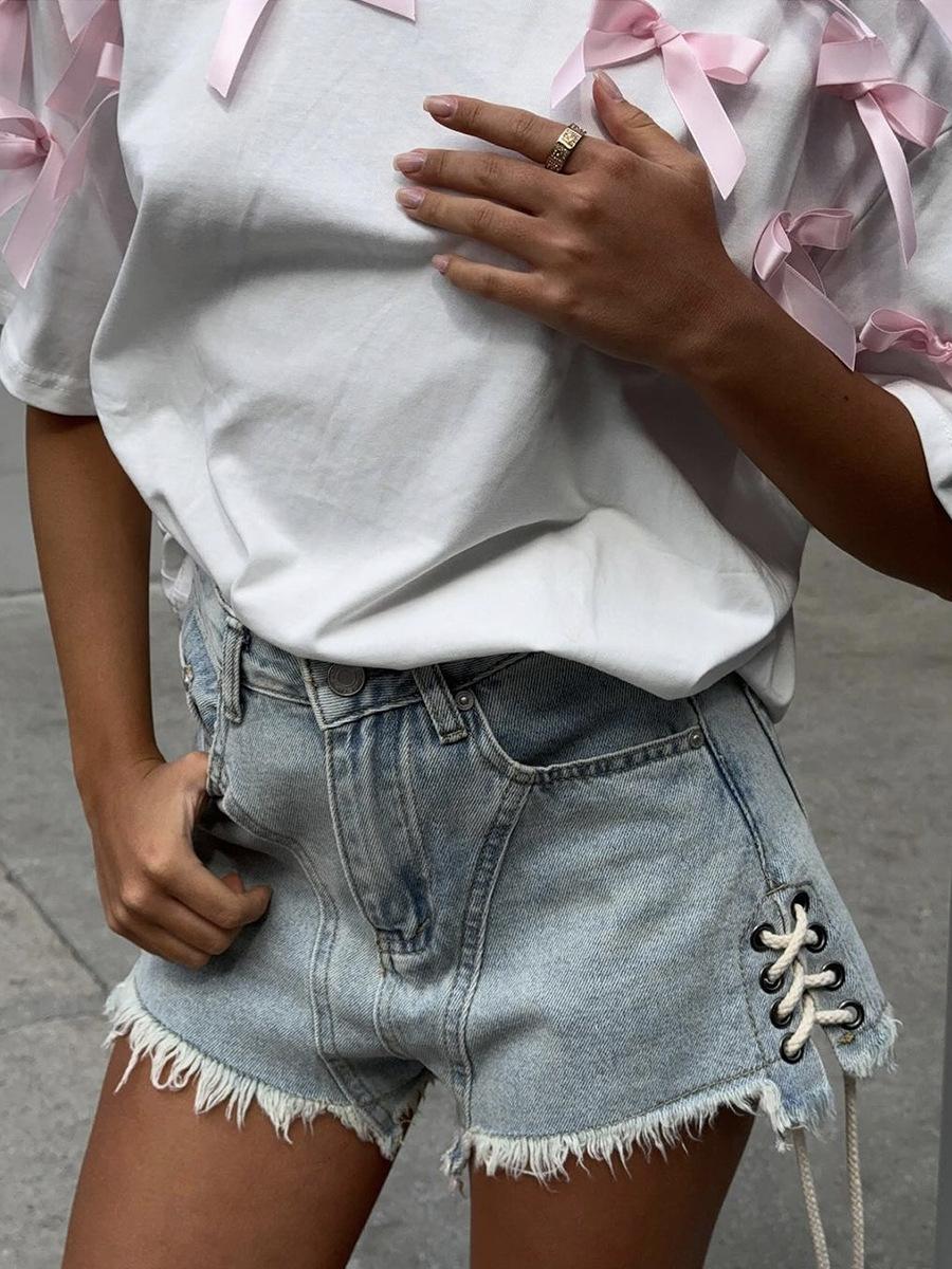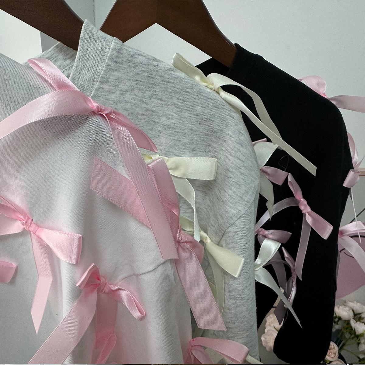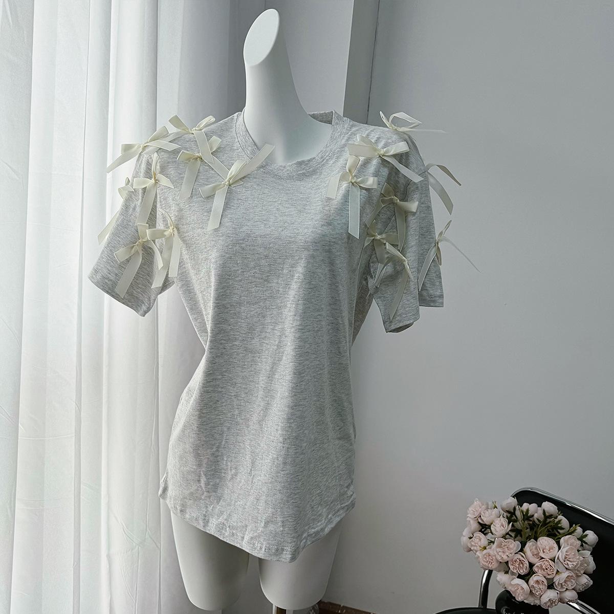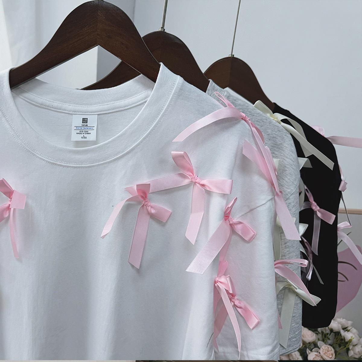 En stock, camiseta holgada de manga corta con lazo de cinta para niña, estilo europeo y americano, top informal de algodón holgado.