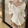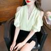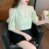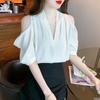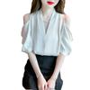 Camisa de Chifón Blanca con Cuello en V, Hombros Descubiertos y Manga Corta para Mujer, Verano Nuevo Estilo Sexy Camisa Top