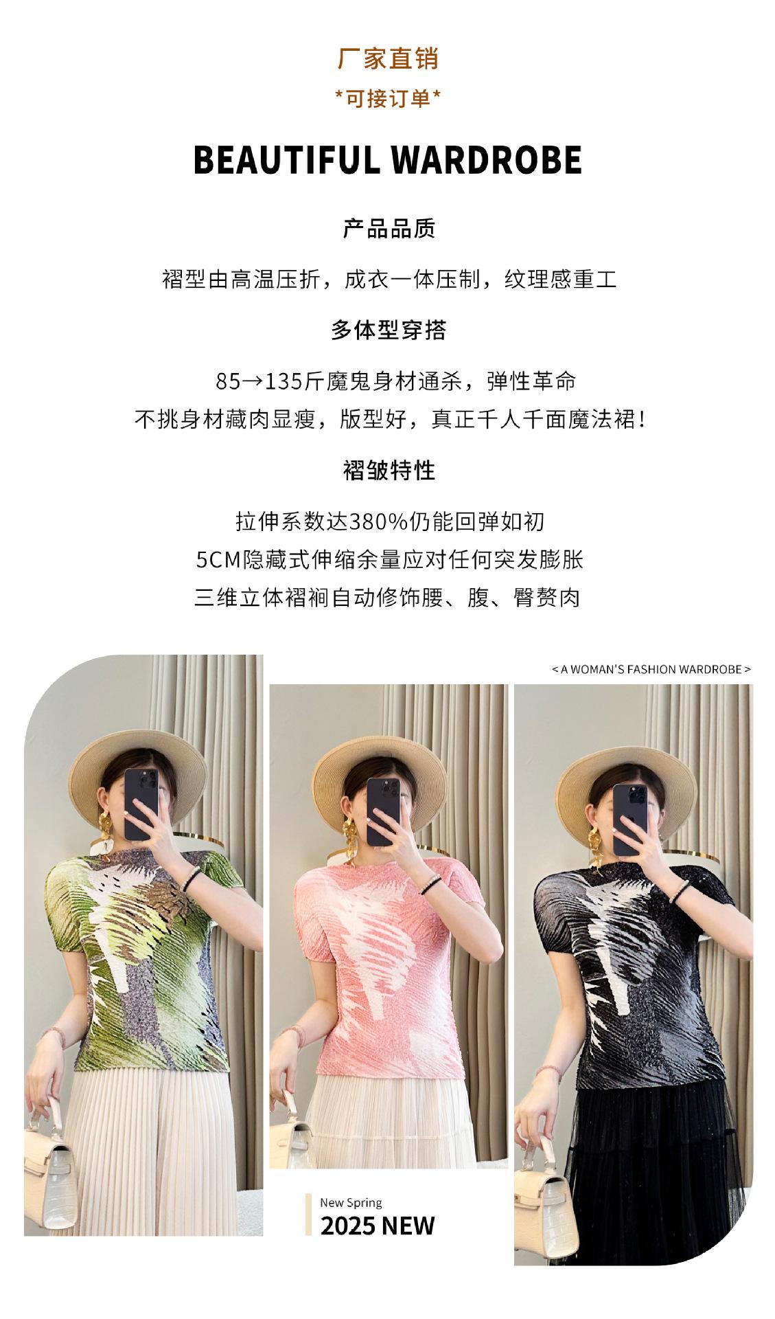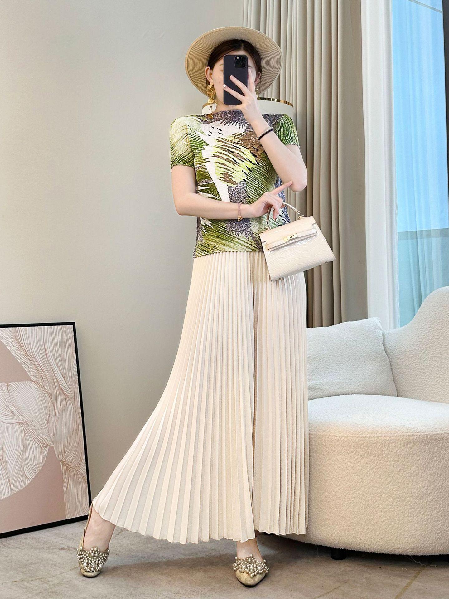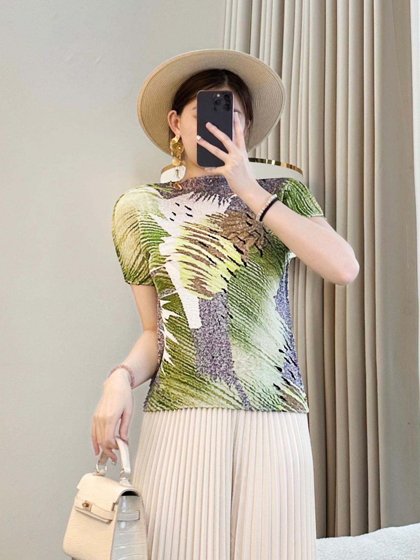 Camiseta de cuello redondo Miyake verde de alta gama para mujer, primavera y verano, nueva, elegante, plisada, holgada, combinable con todo, corte ajustado, manga corta