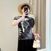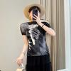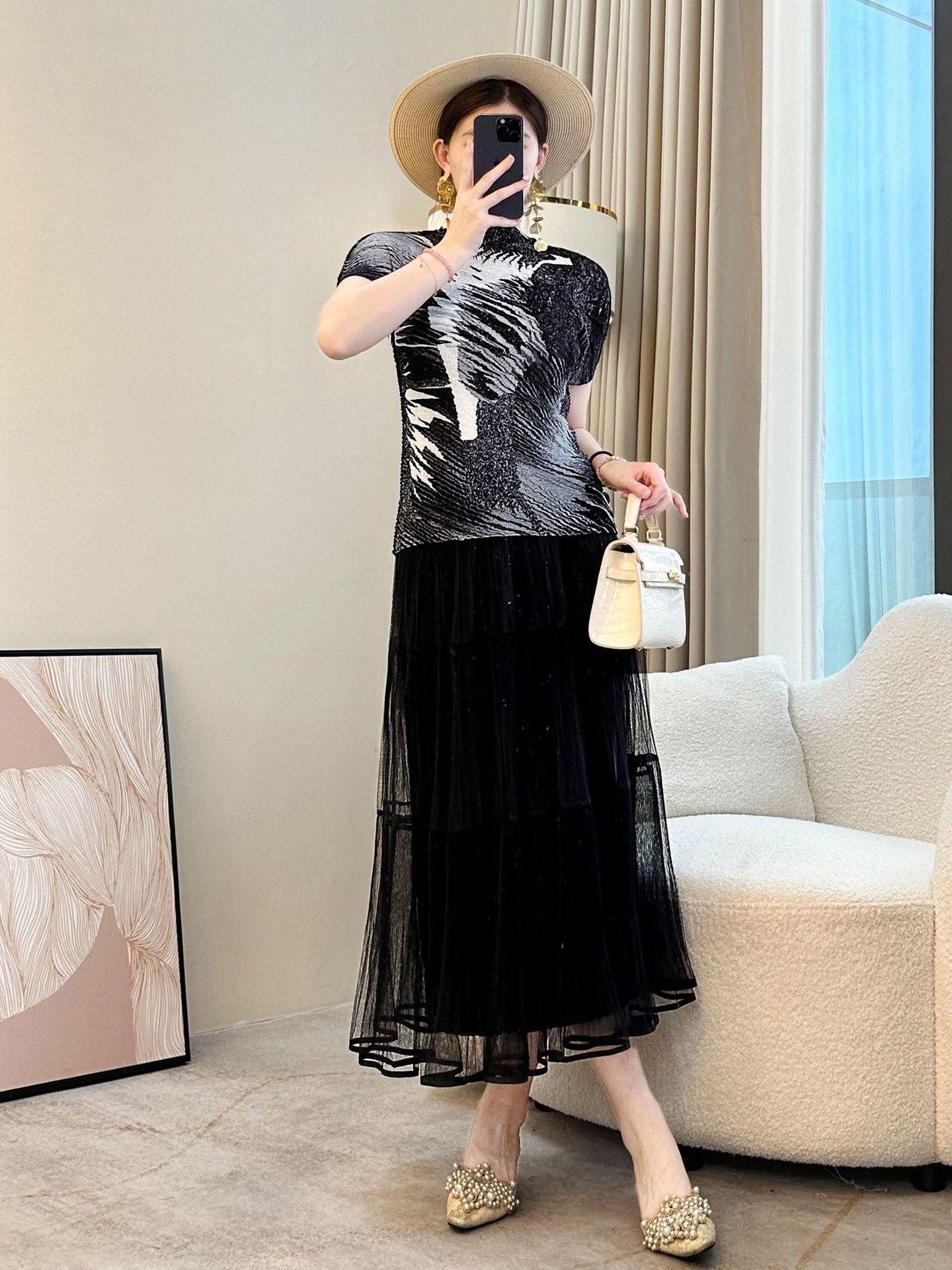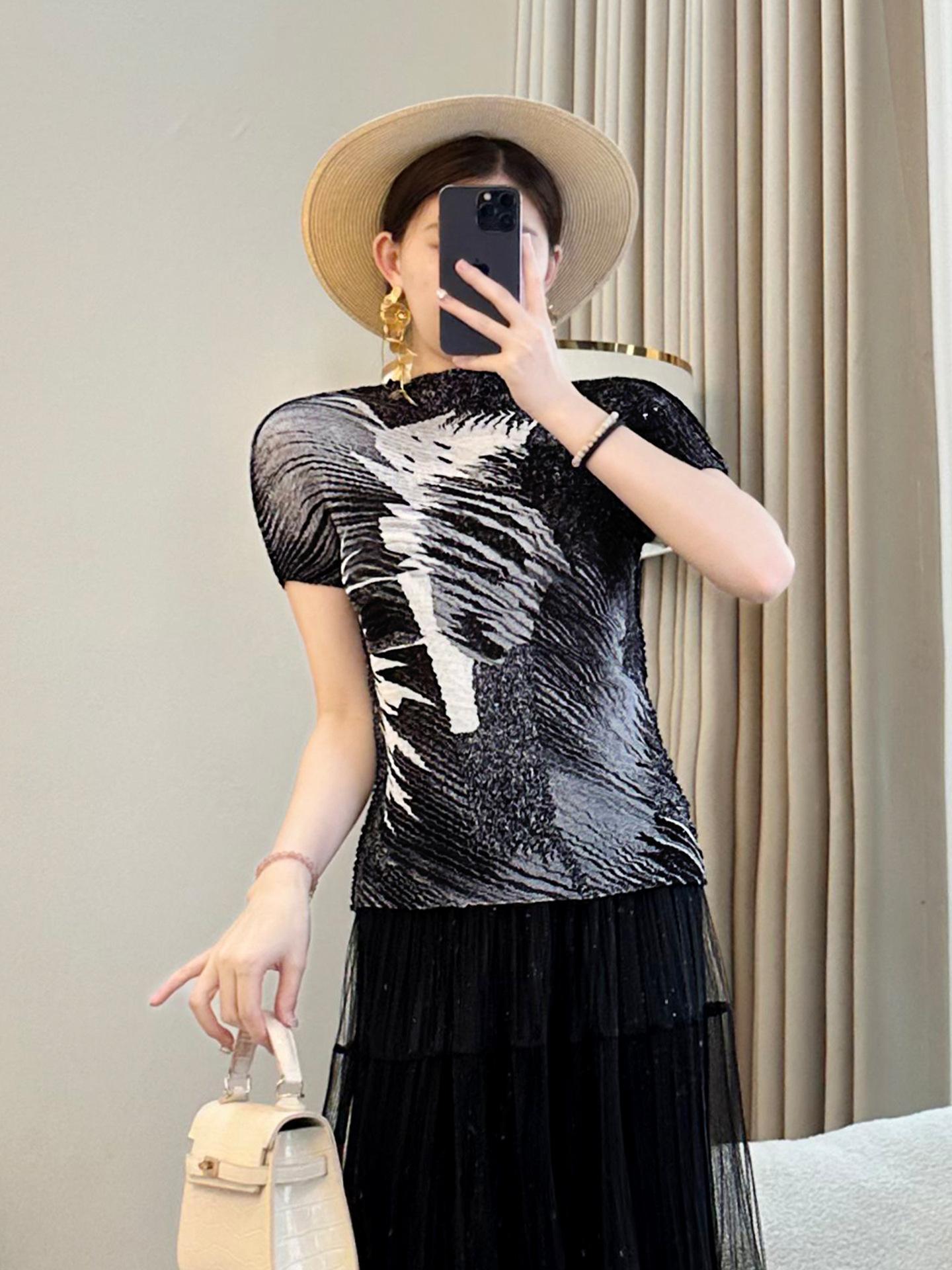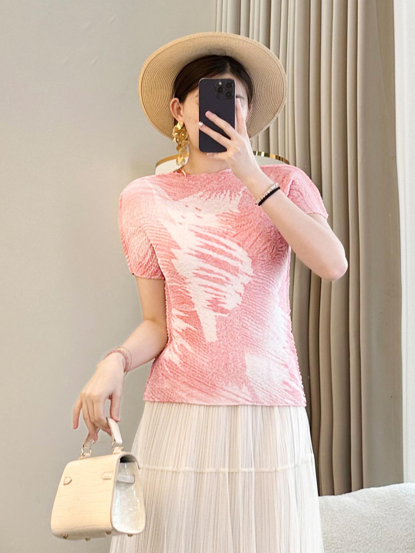 Camiseta de cuello redondo Miyake verde de alta gama para mujer, primavera y verano, nueva, elegante, plisada, holgada, combinable con todo, corte ajustado, manga corta