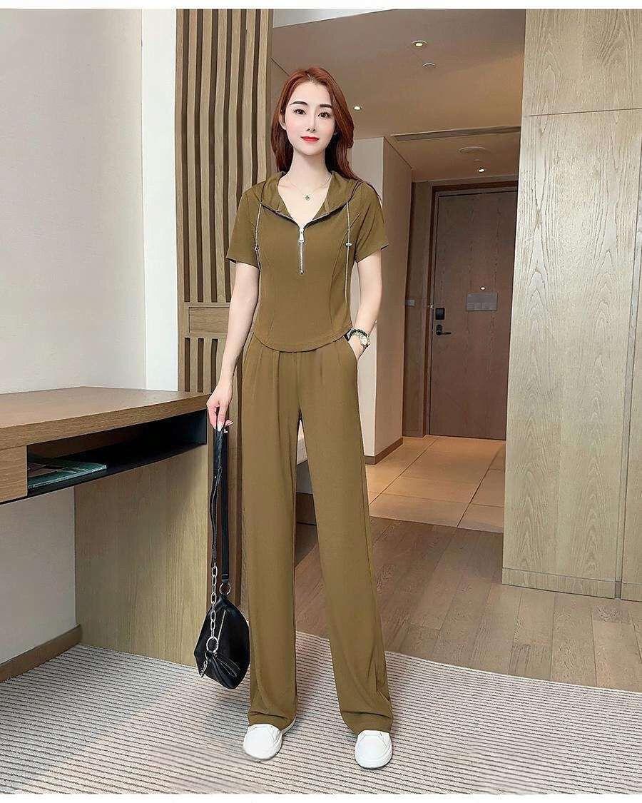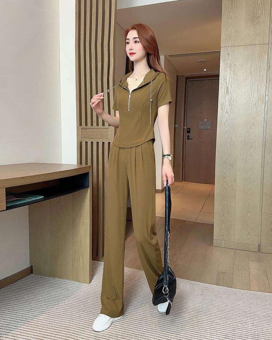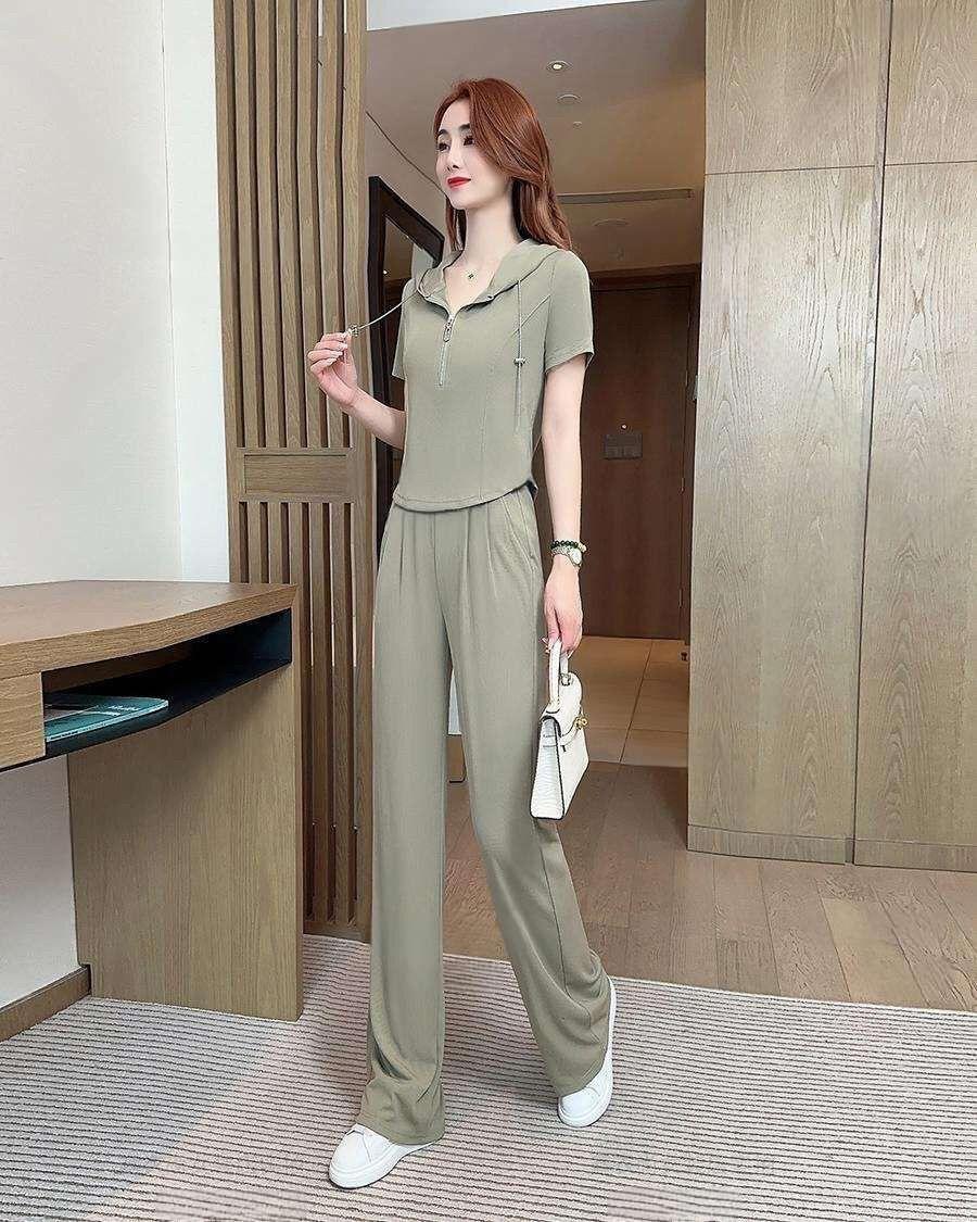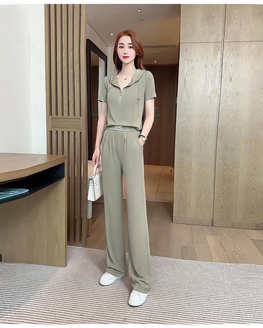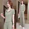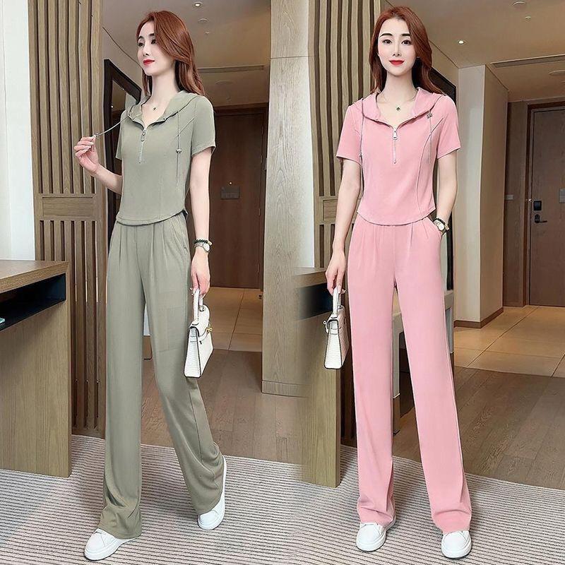 Conjunto deportivo informal de dos piezas para mujer, de verano, fino, elegante, de seda helada, con pierna ancha, 2024