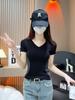 Playera Retro Americana de Hombro Derecho con Cuello en V y Manga Corta para Mujer Verano 2025 Nuevo Color Contrastante Aspecto Adelgazante Sexy Top de Deseo Puro