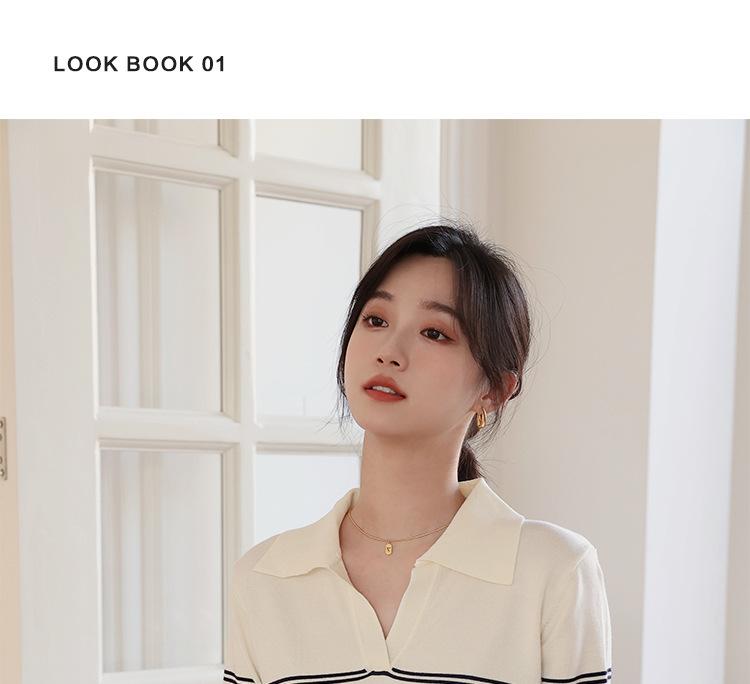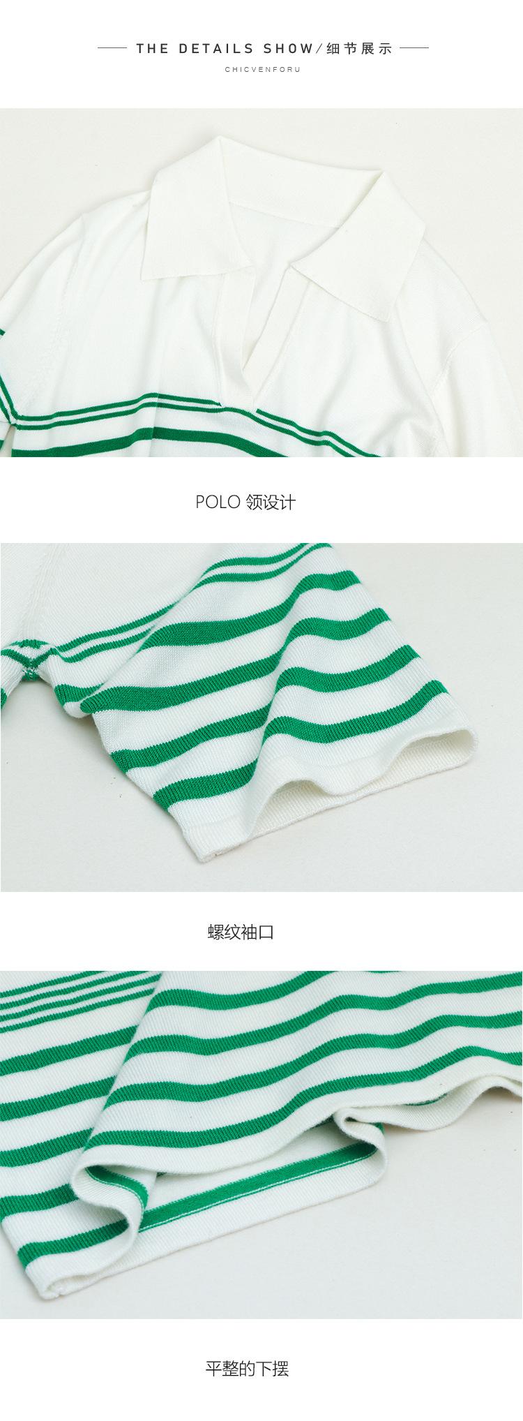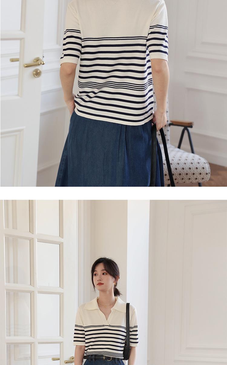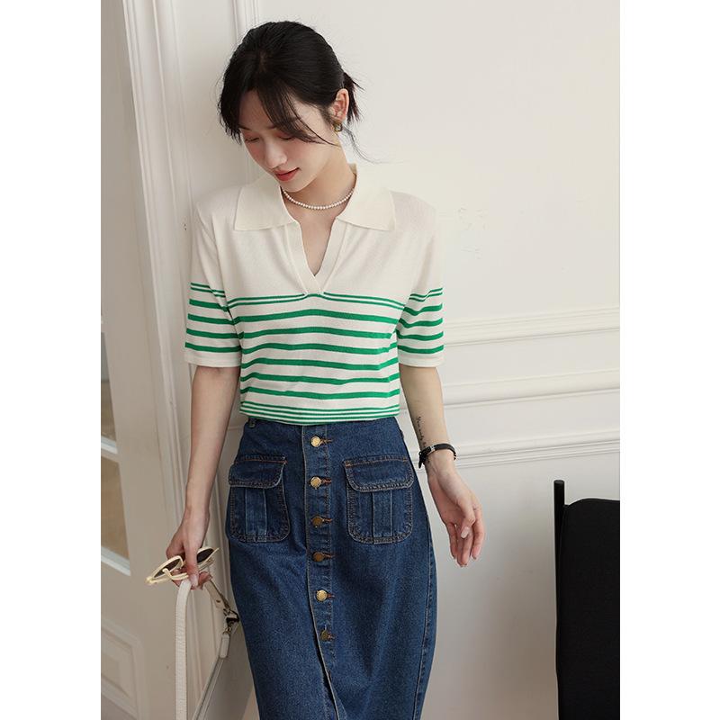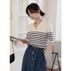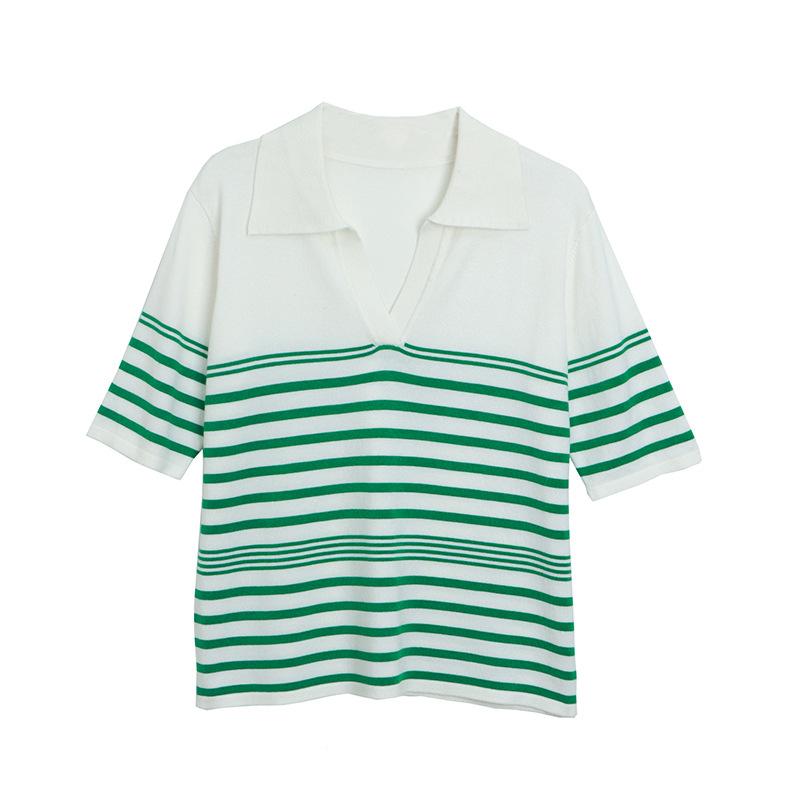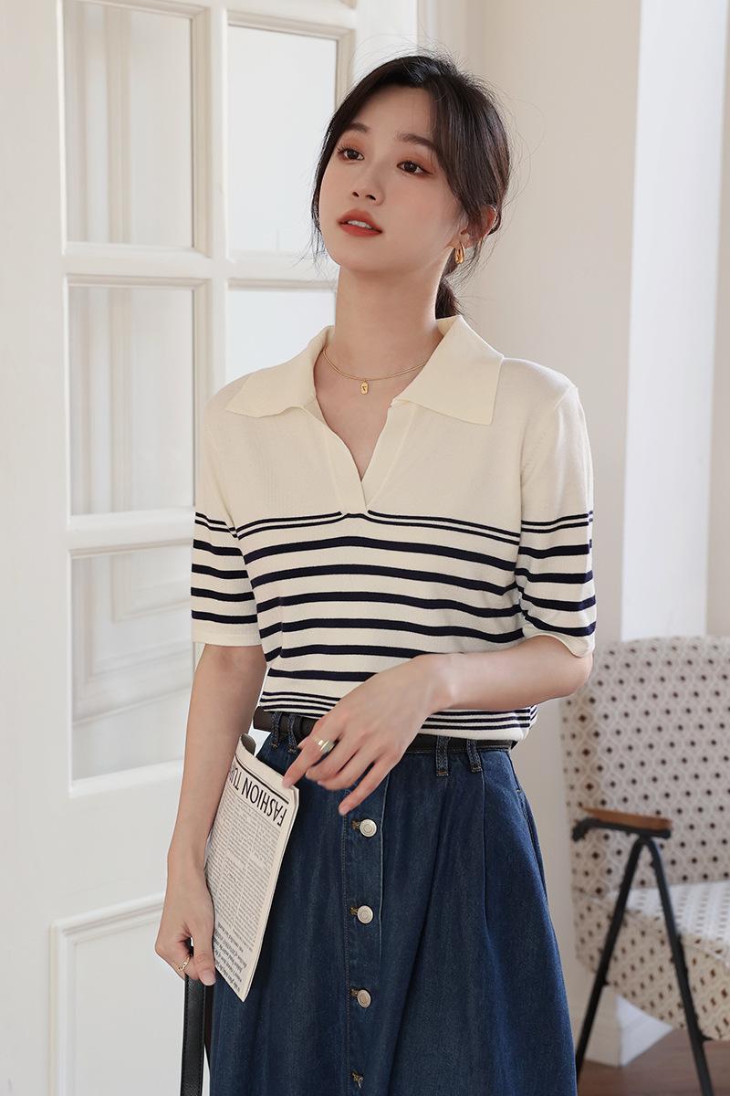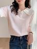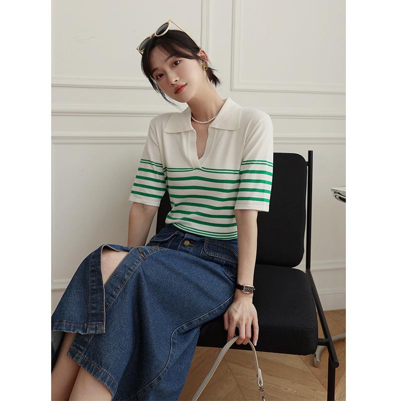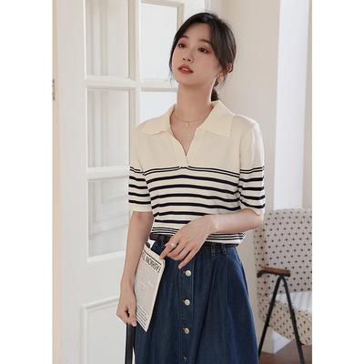 2024 Nueva Camiseta de Punto de Manga Corta de Alta Gama a Rayas con Cuello Polo para Mujer Diseño de Verano Nicho Top Holgado