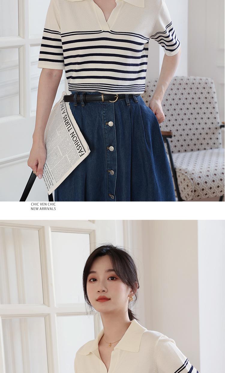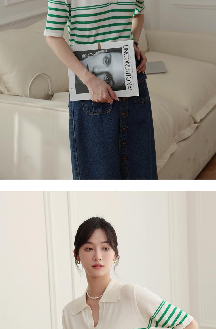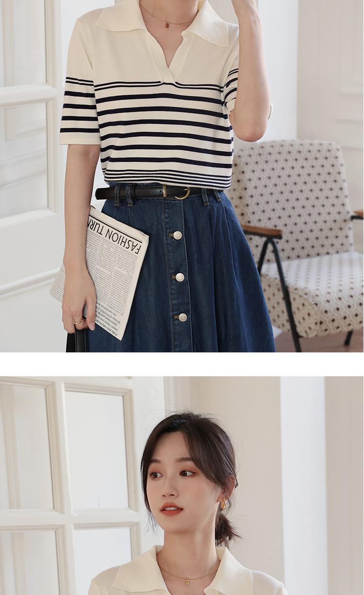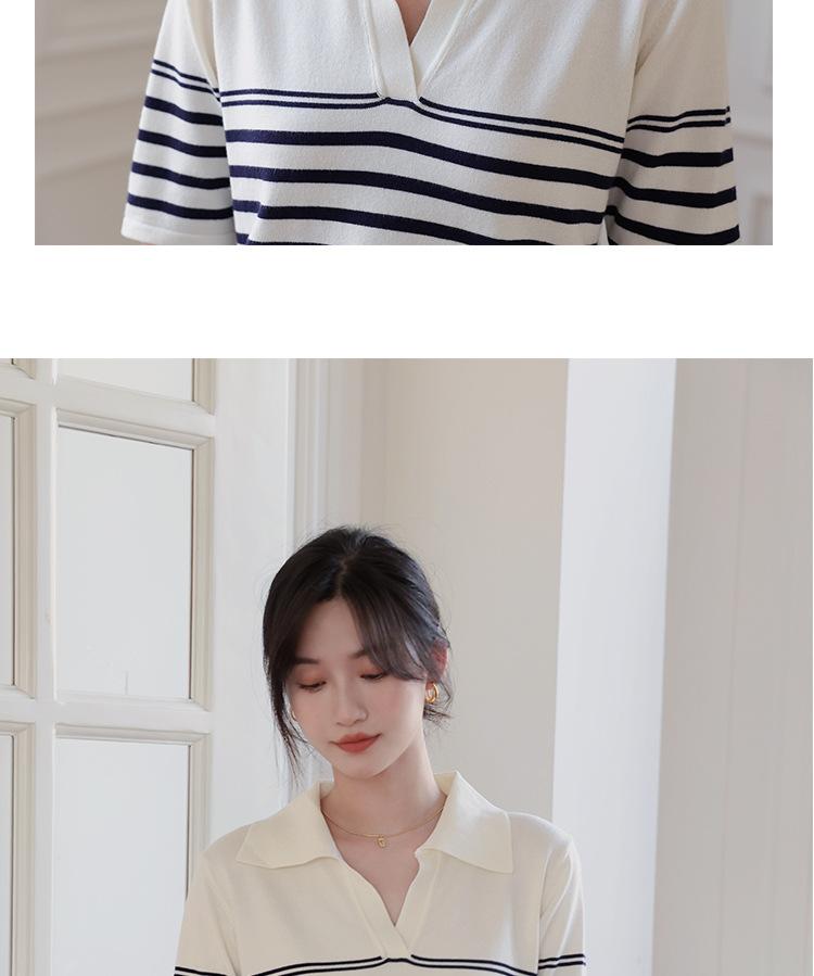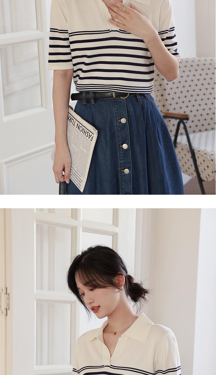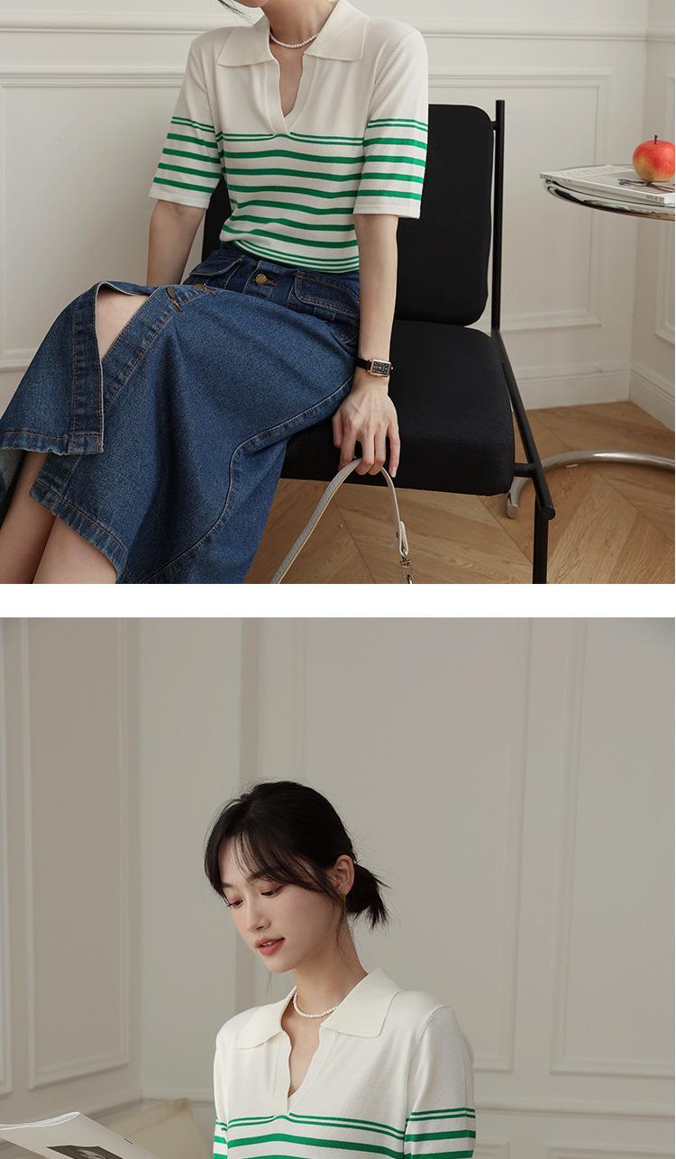 2024 Nueva Camiseta de Punto de Manga Corta de Alta Gama a Rayas con Cuello Polo para Mujer Diseño de Verano Nicho Top Holgado