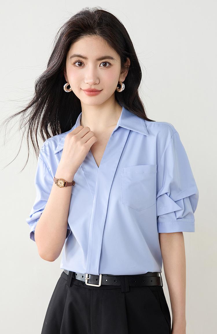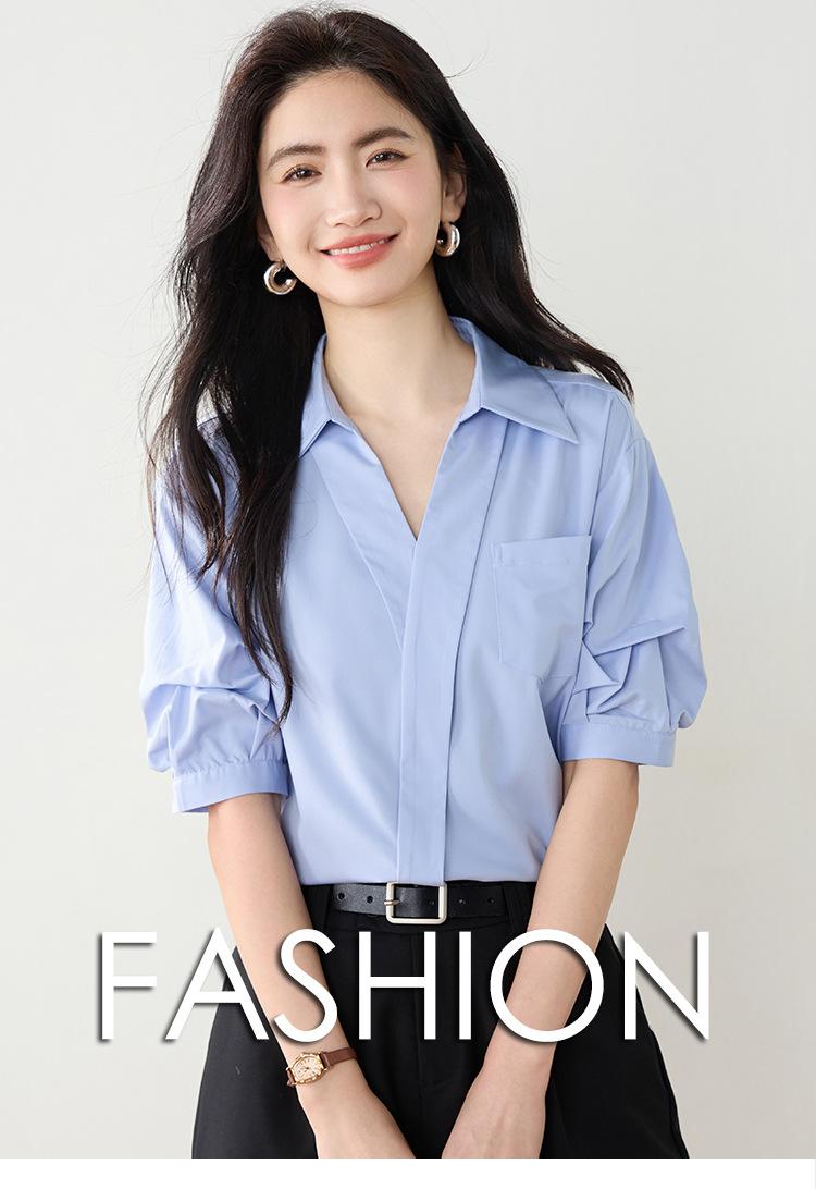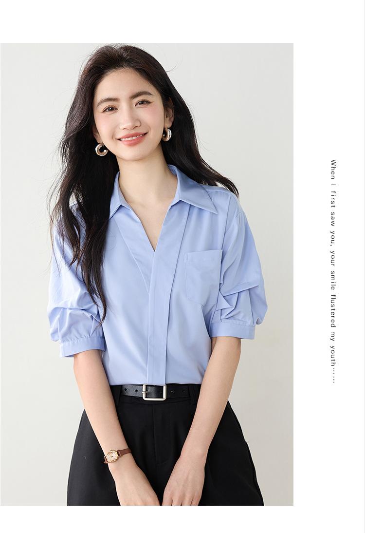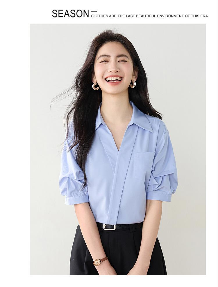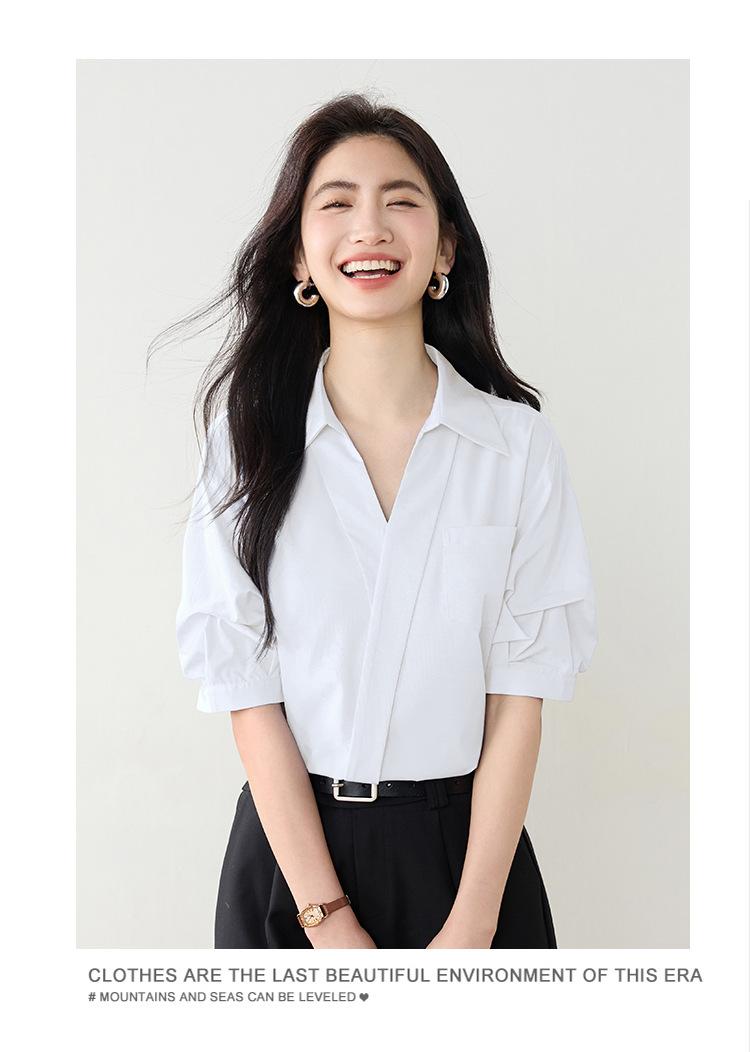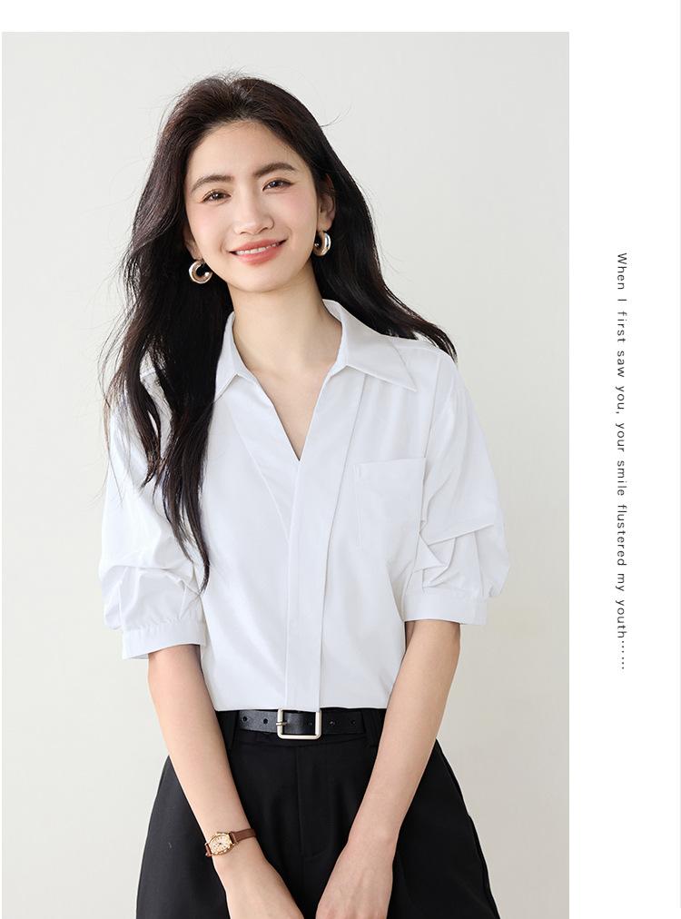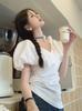 Camisa de cuello en V para mujer, manga corta, verano 2025, nuevo diseño de nicho francés, elegante jersey antiedad con mangas abullonadas