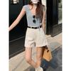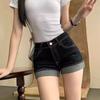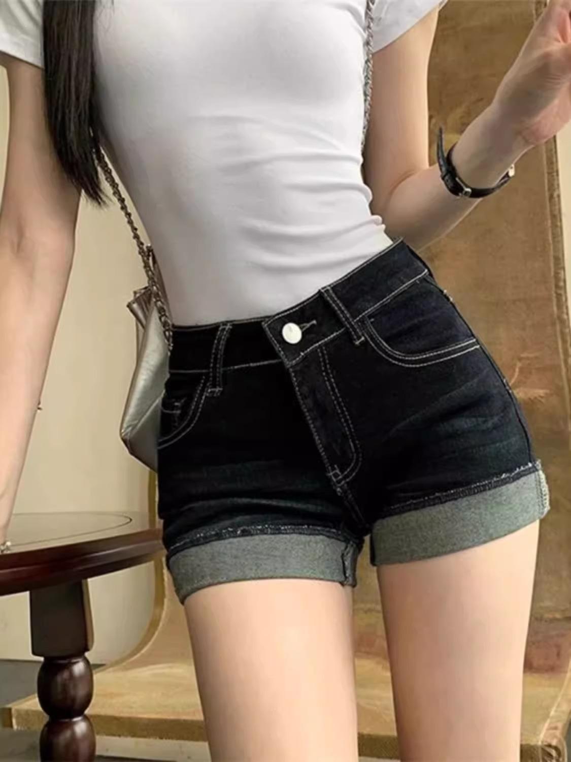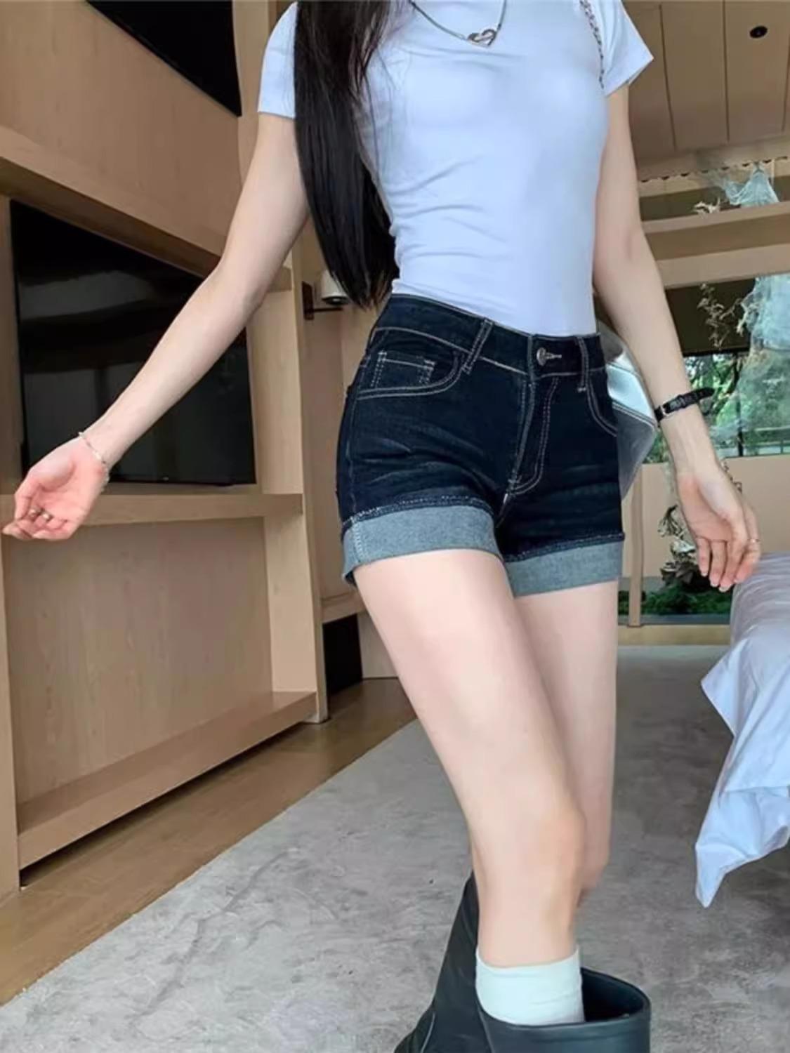 Shorts de Mezclilla de Cintura Baja con Rizo de Chica Caliente Estilo Americano para Mujer Verano 2025 Nuevo Stretch Ajustado Adelgazantes Pantalones de Chica Caliente