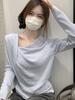 Camiseta de Punto de Manga Larga con Hombro Inclinado Irregular Estilo Francés, Otoño, Cuello Caído, Corte Entallado, Camiseta Básica Entallada