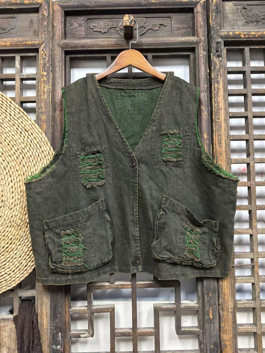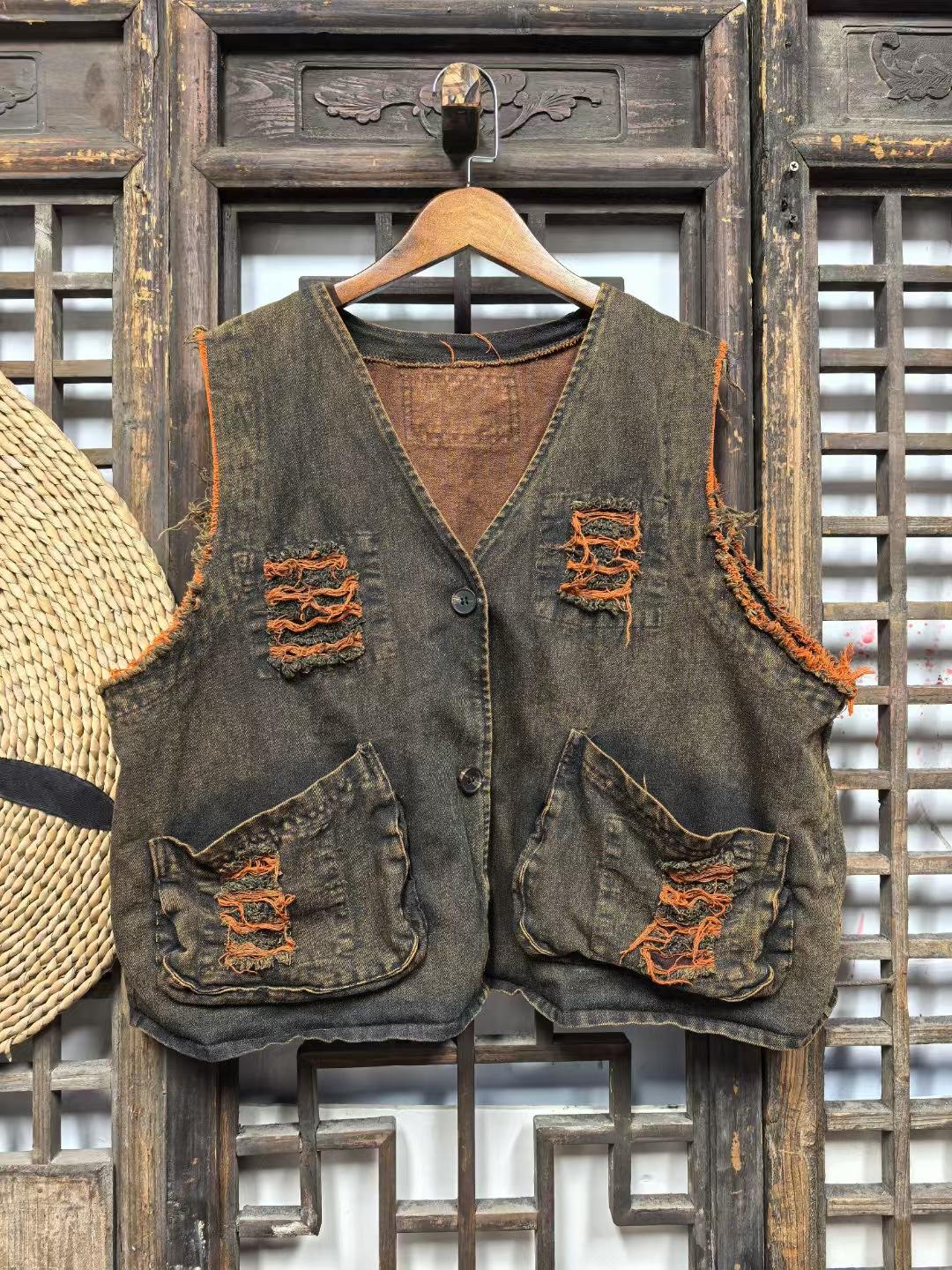 Chaleco vaquero vintage desgastado para mujer 2025 primavera nuevo suelto versátil bolsillo grande moda cárdigan chaleco
