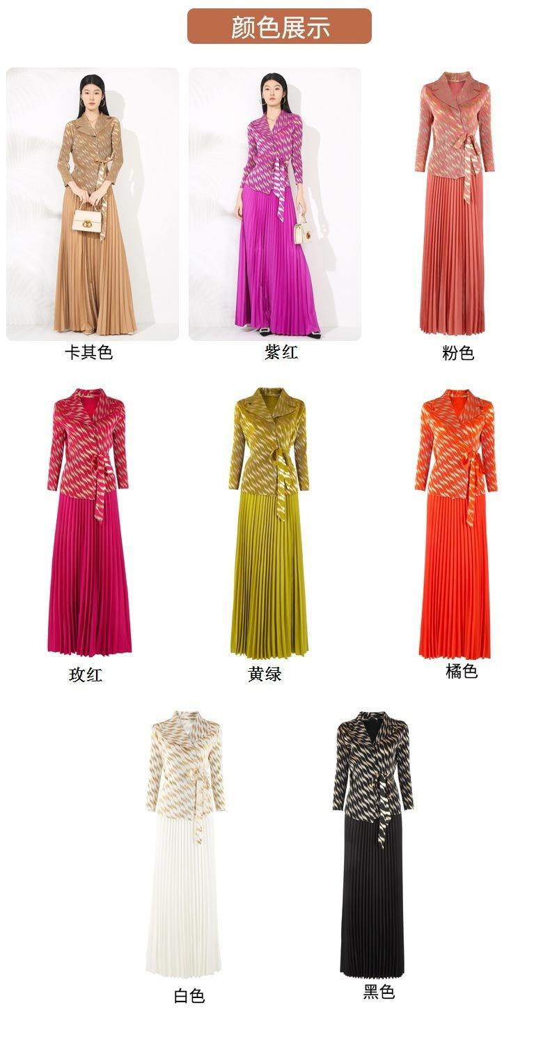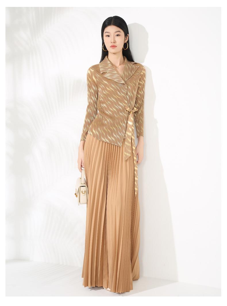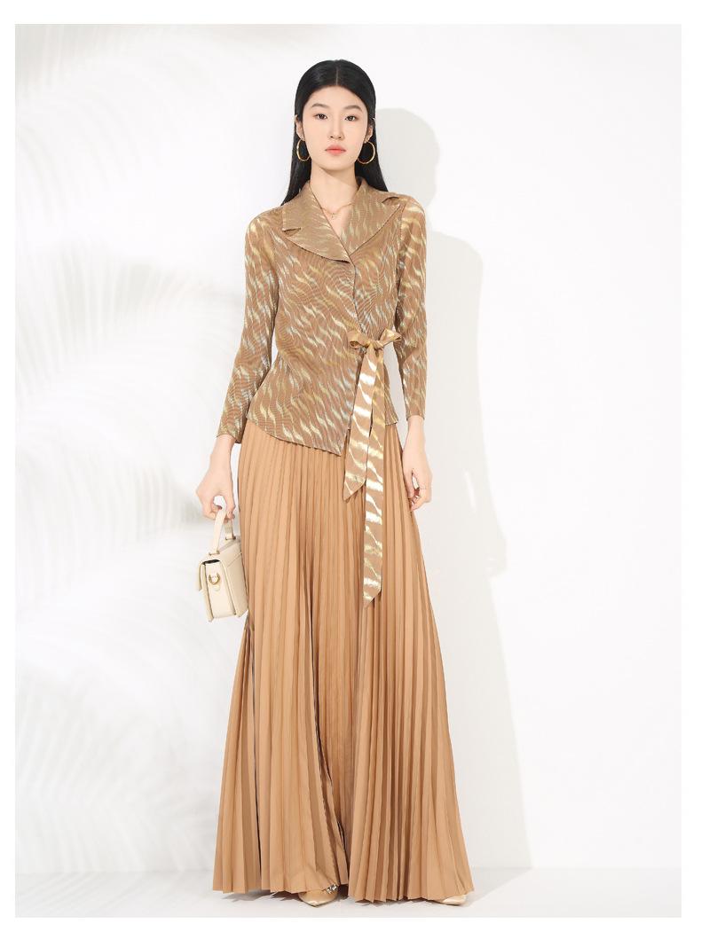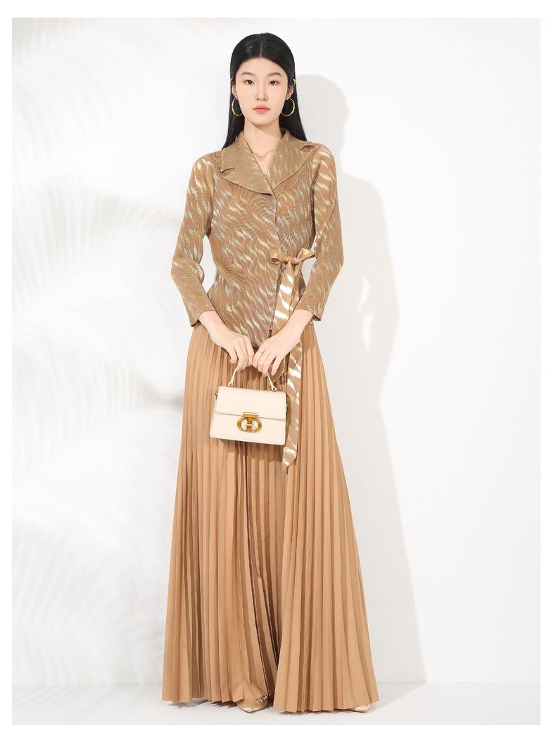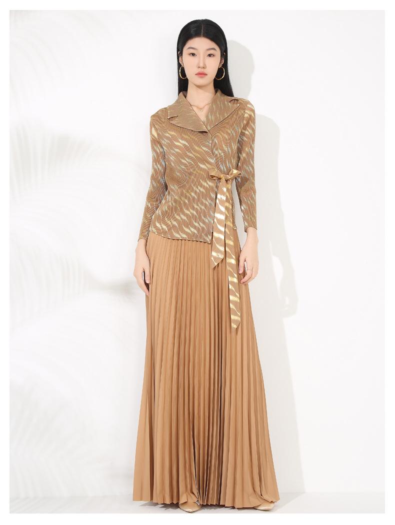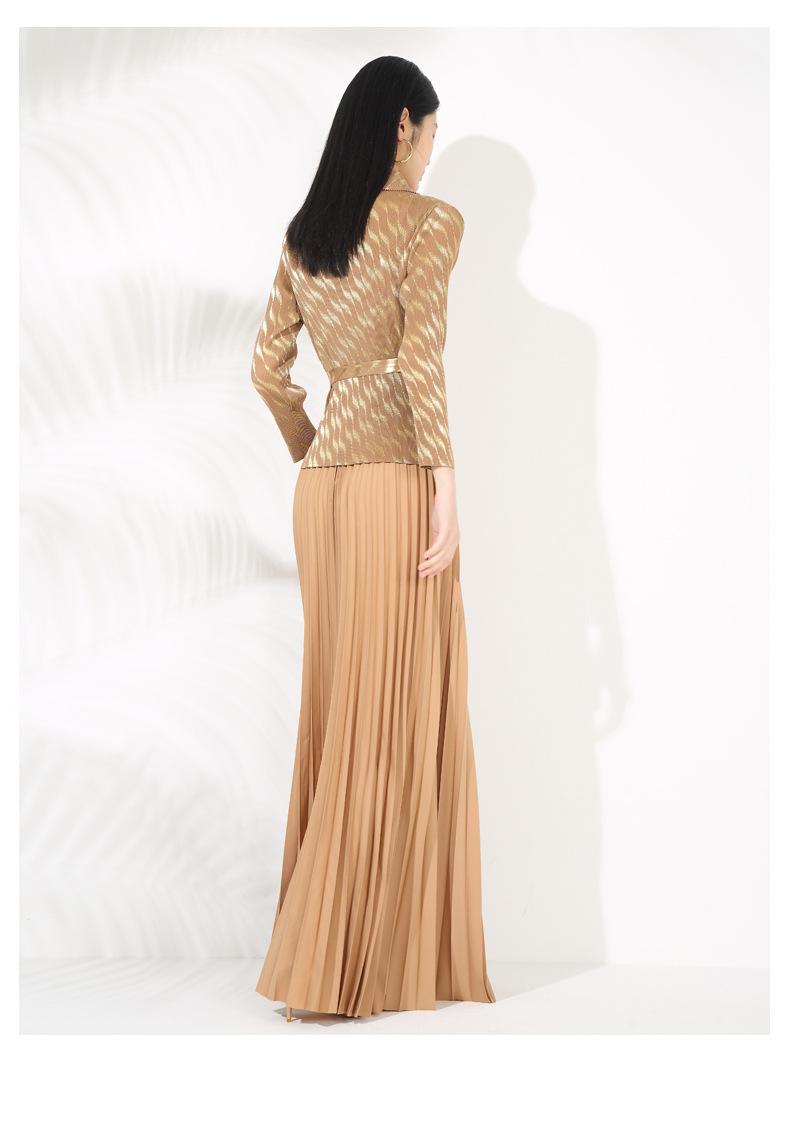 Traje plisado de temperamento de alta gama para mujer, moda, traje con cuello dorado, abrigo de manga larga, falda larga de talle alto, conjunto de dos piezas
