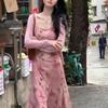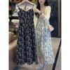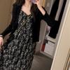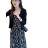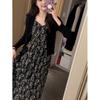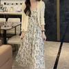 Conjunto de dos piezas de vestido con tirantes florales de estilo coreano para mujer, con cárdigan de punto y parte superior.