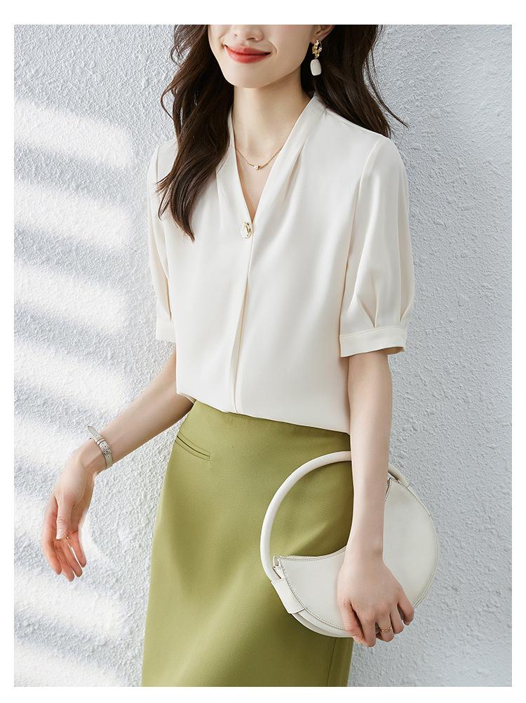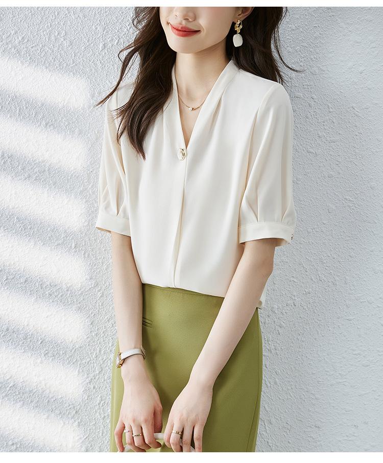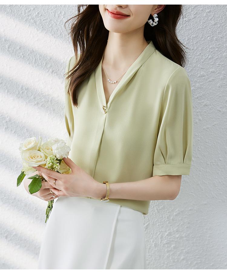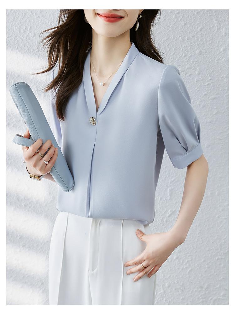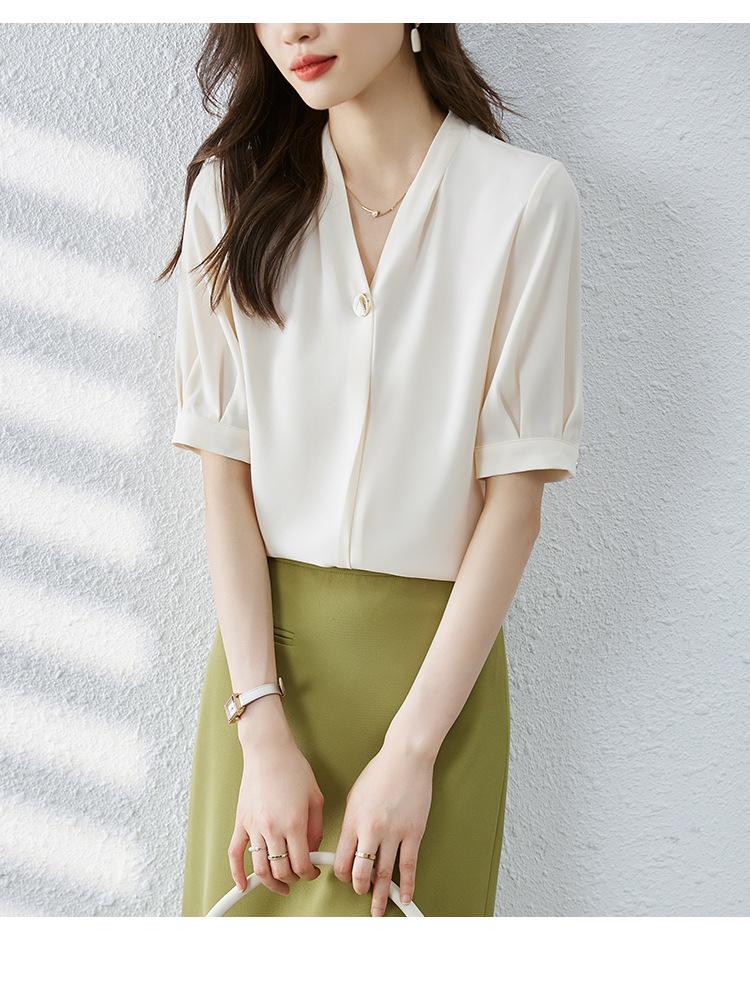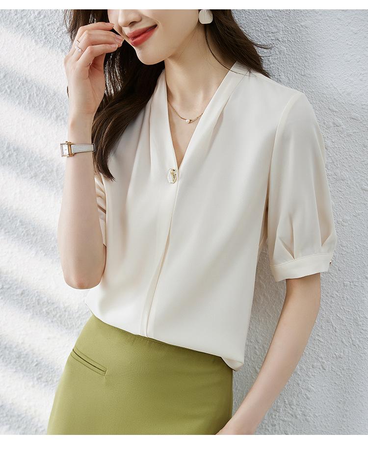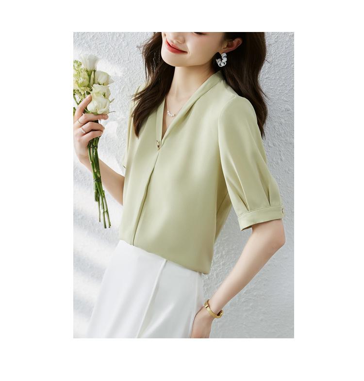 Camisa de Satén con Cuello en V Estilo Francés para Mujer Verano Nueva Elegante Ropa de Trabajo Ropa de Trabajo Profesional Camisa de Manga Corta a la Moda