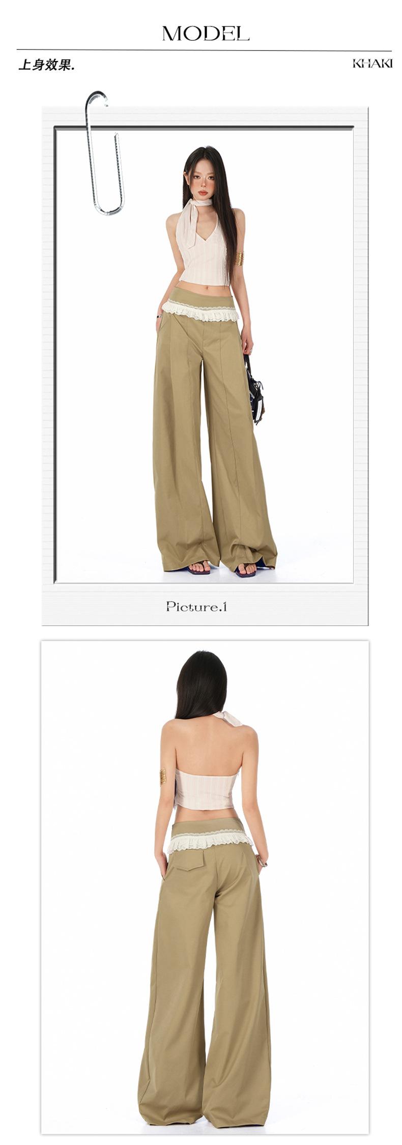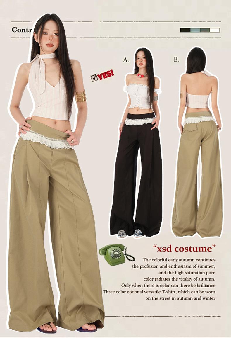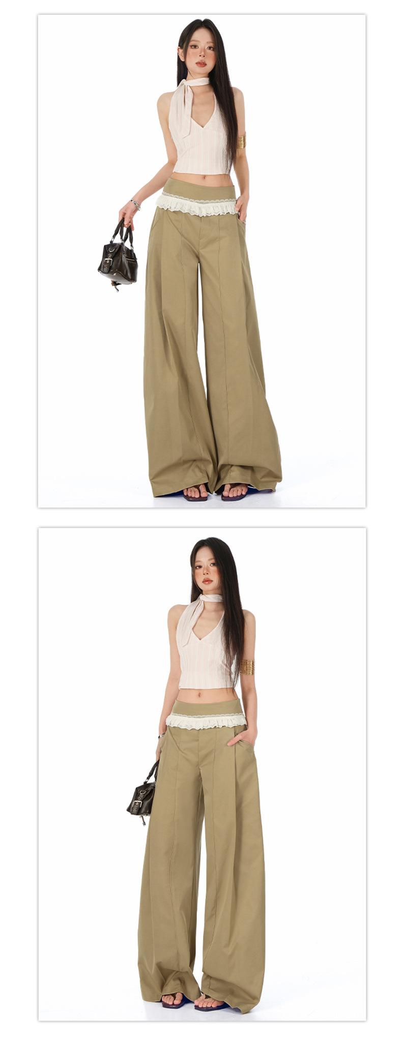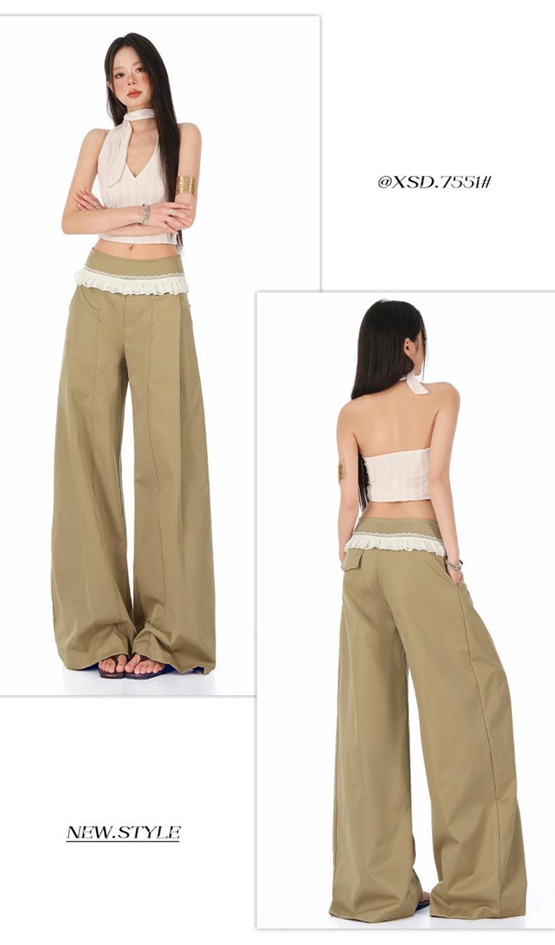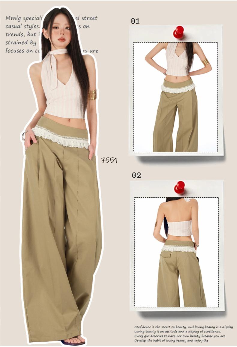 Ropa de Mujer de Seda Naranja# Pantalones Casuales con Costuras de Encaje Retro Americano para Mujer Verano 2025 Pantalones Holgados Plisados de Pierna Ancha