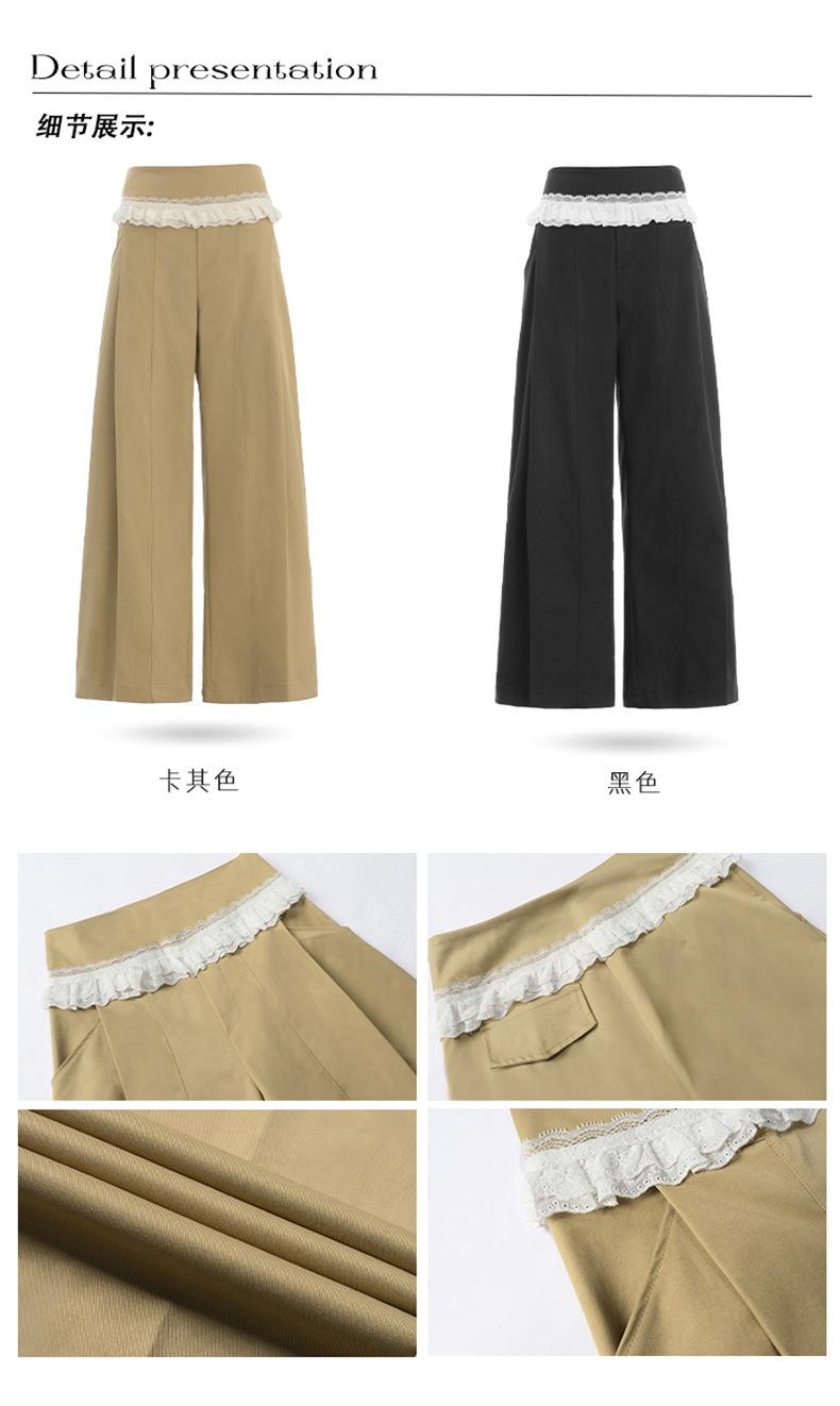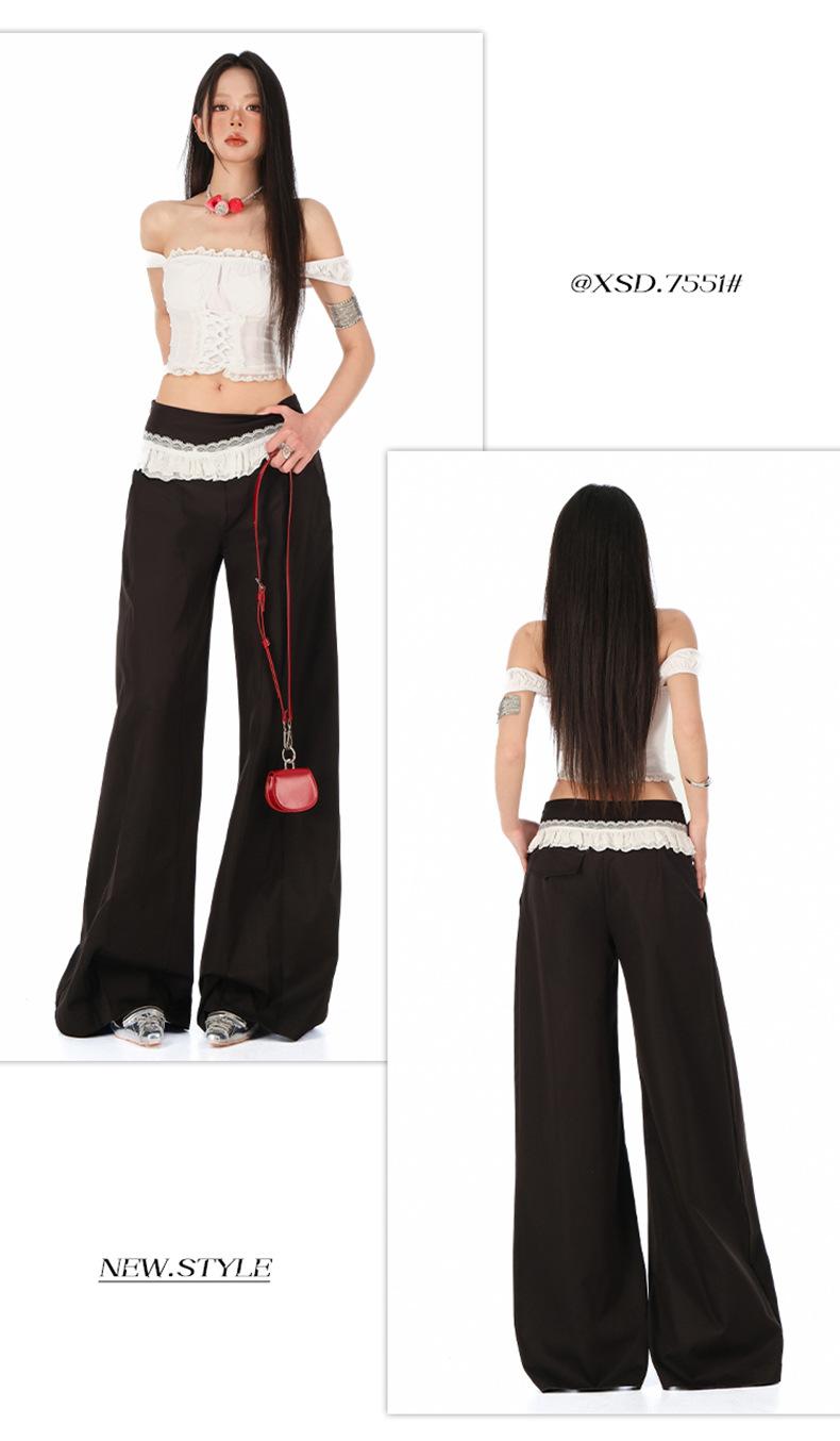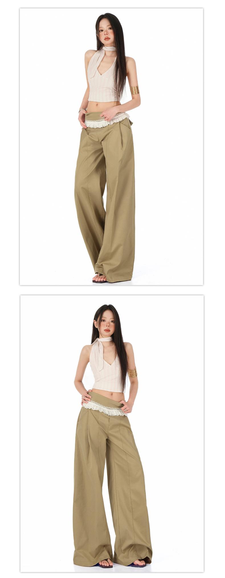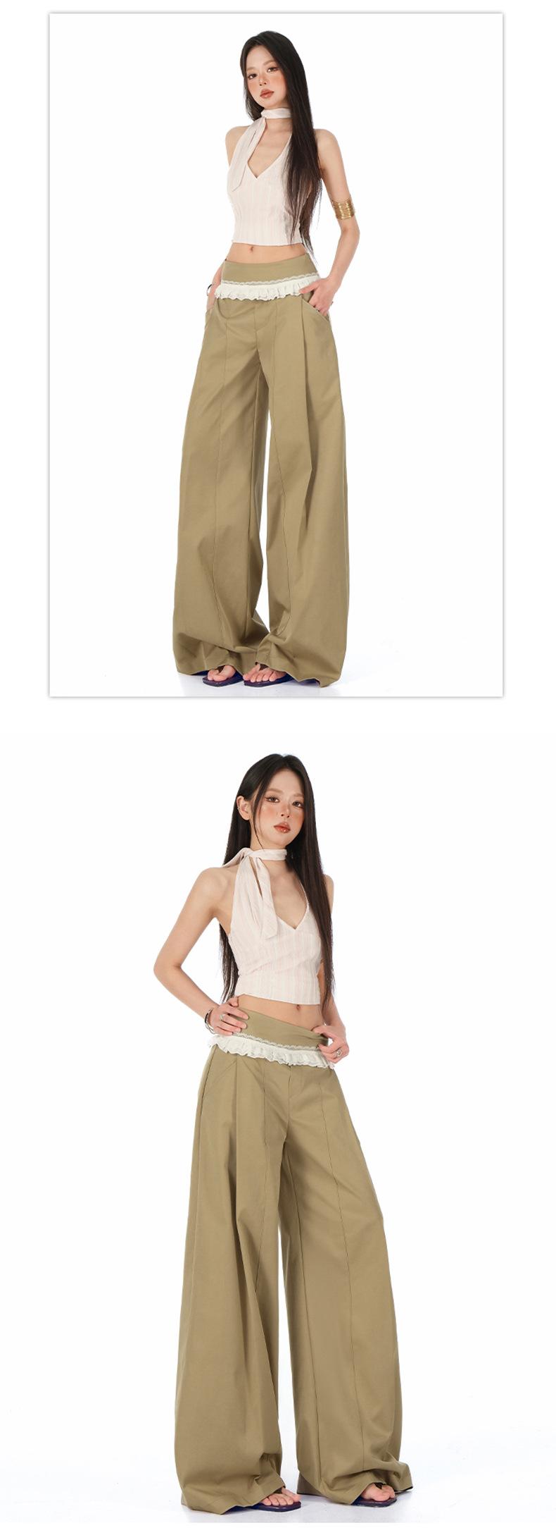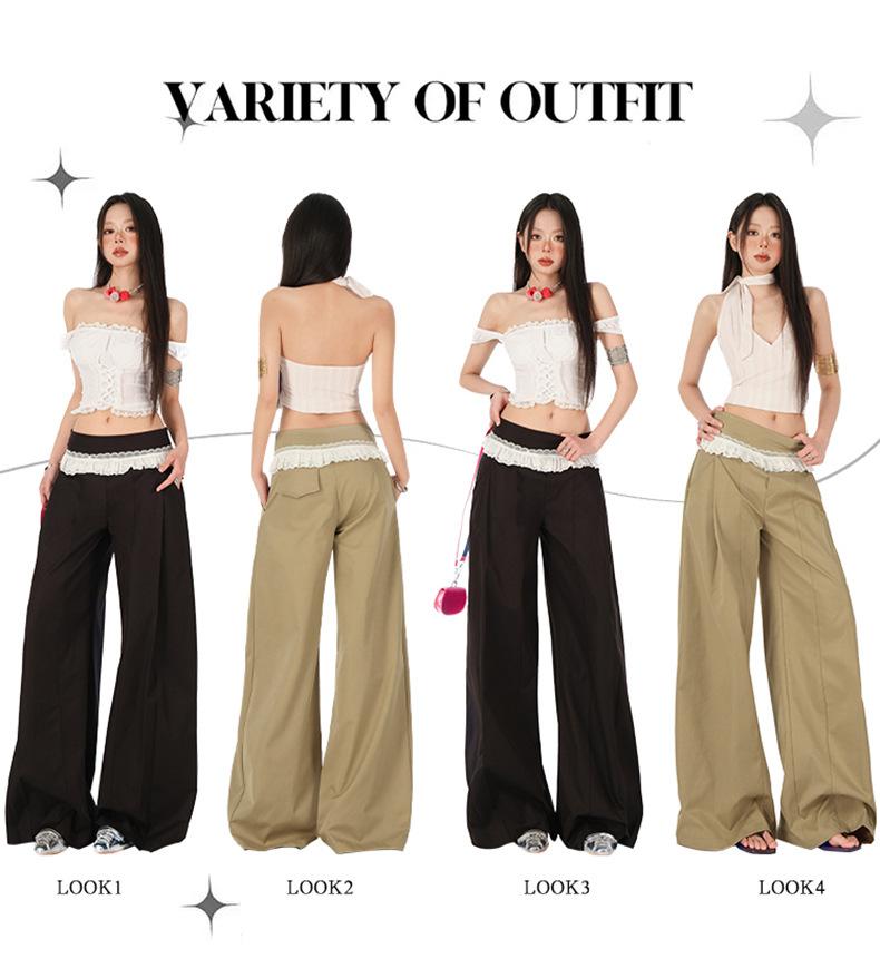 Ropa de Mujer de Seda Naranja# Pantalones Casuales con Costuras de Encaje Retro Americano para Mujer Verano 2025 Pantalones Holgados Plisados de Pierna Ancha