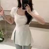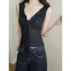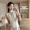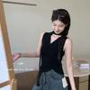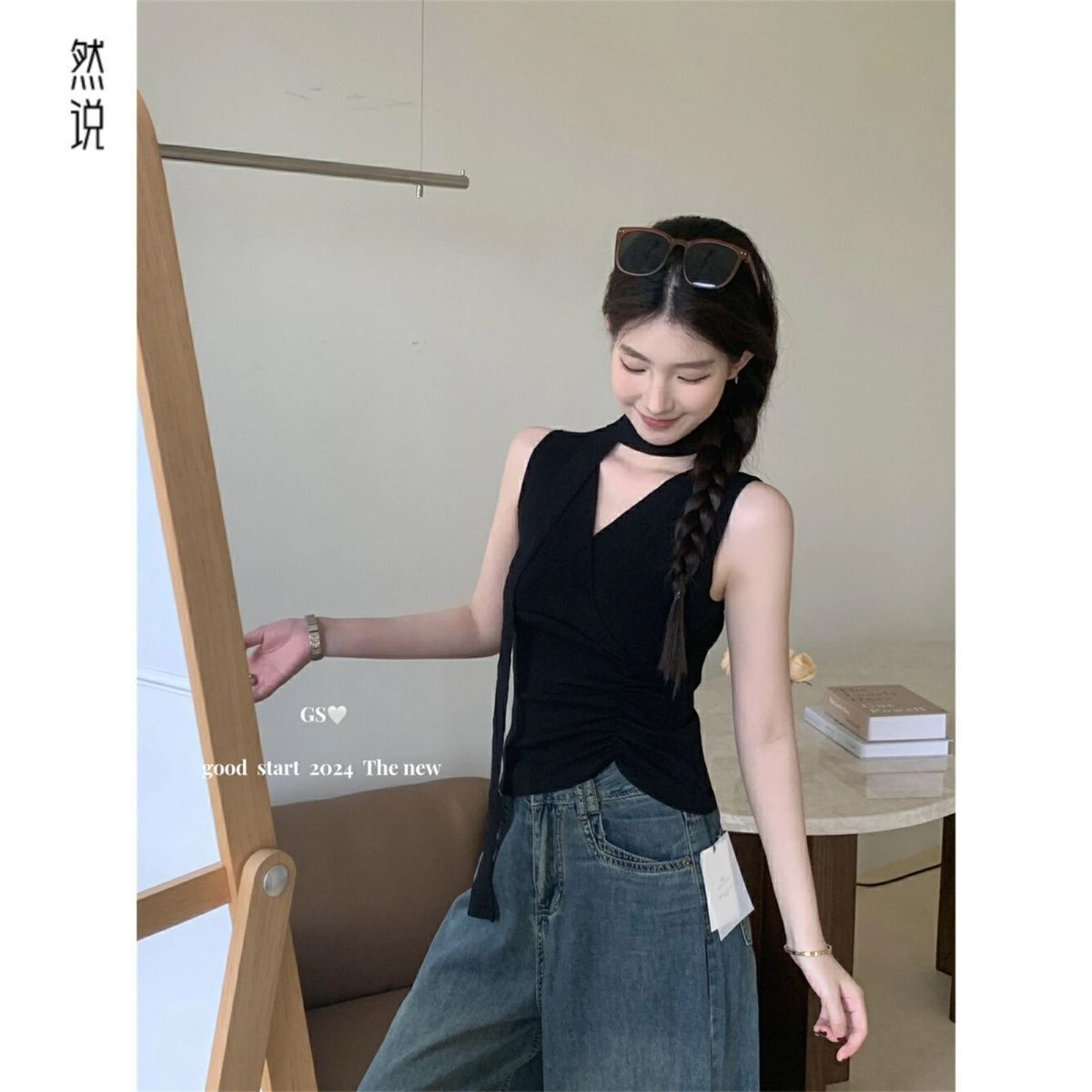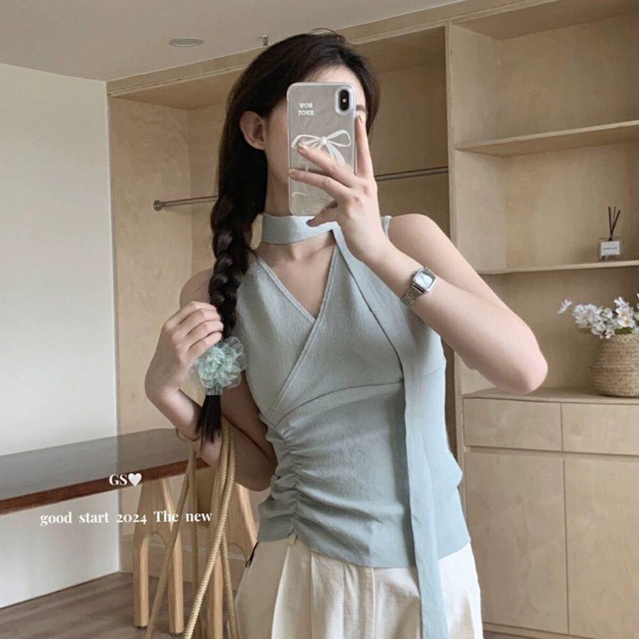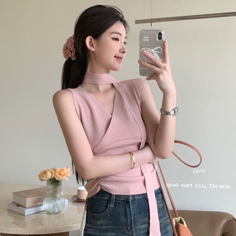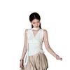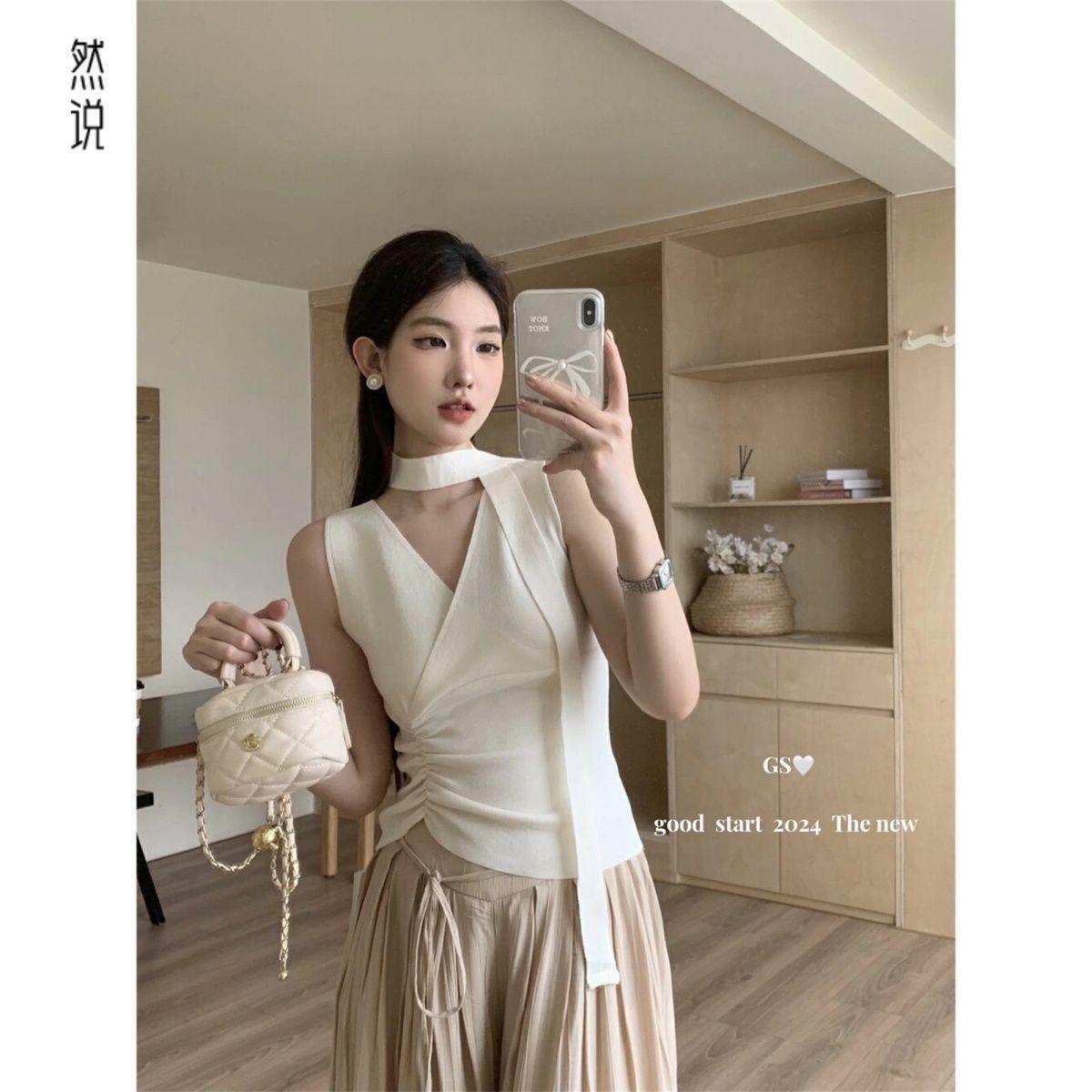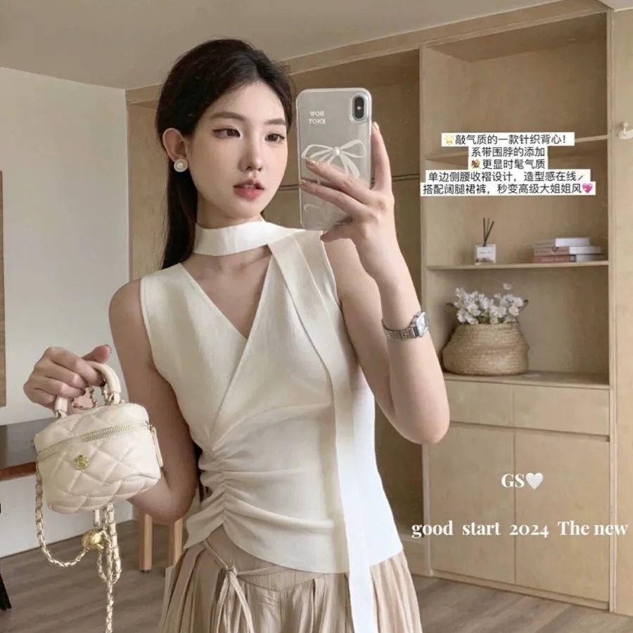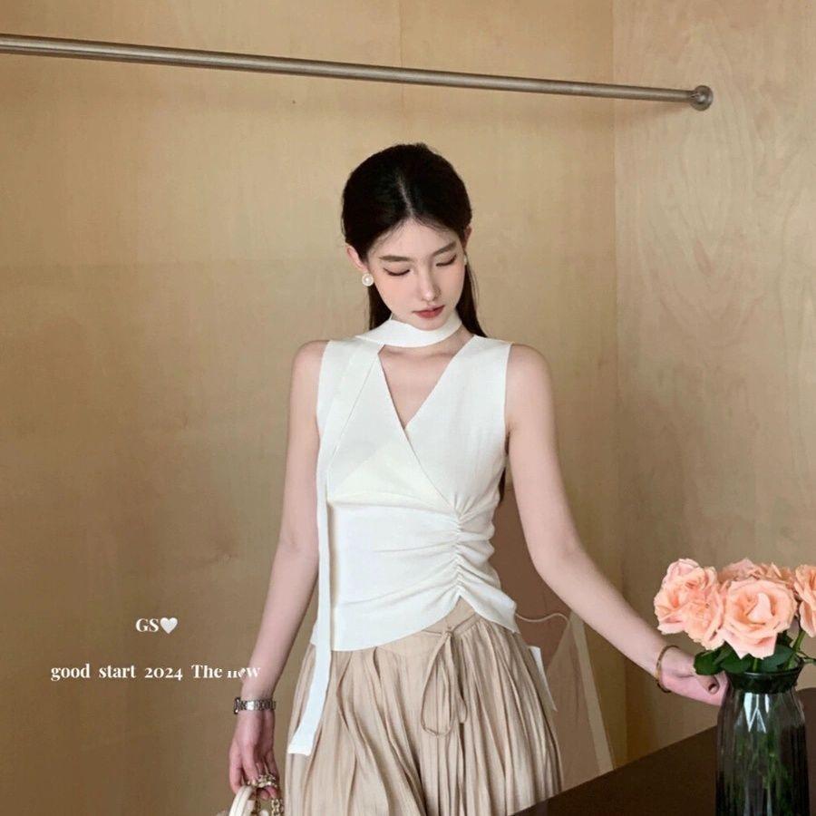 Chaleco sin mangas con cuello en V de estilo suave color Morandi coreano Nuevo Top elegante de nicho plisado con cinta sexy