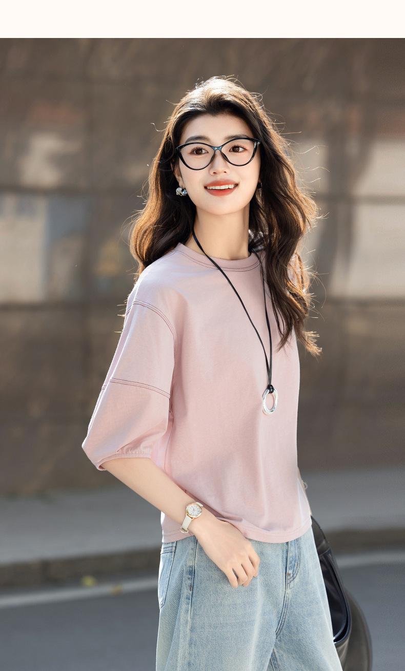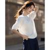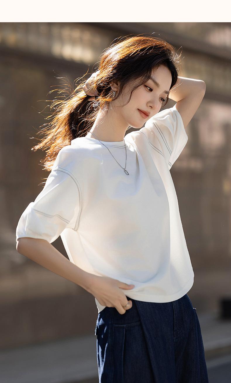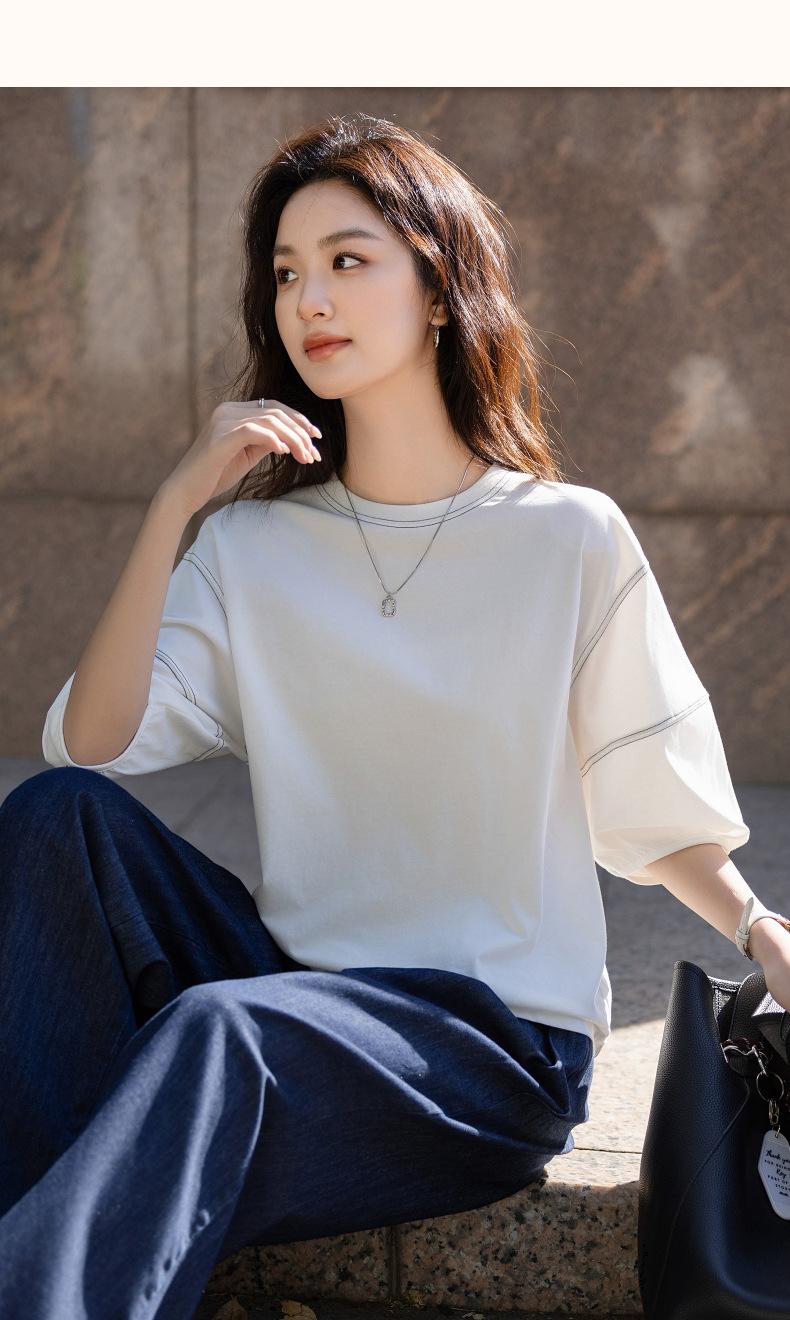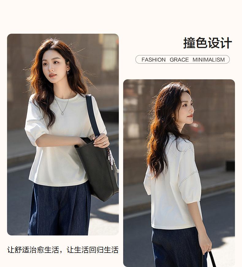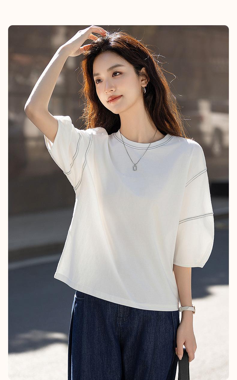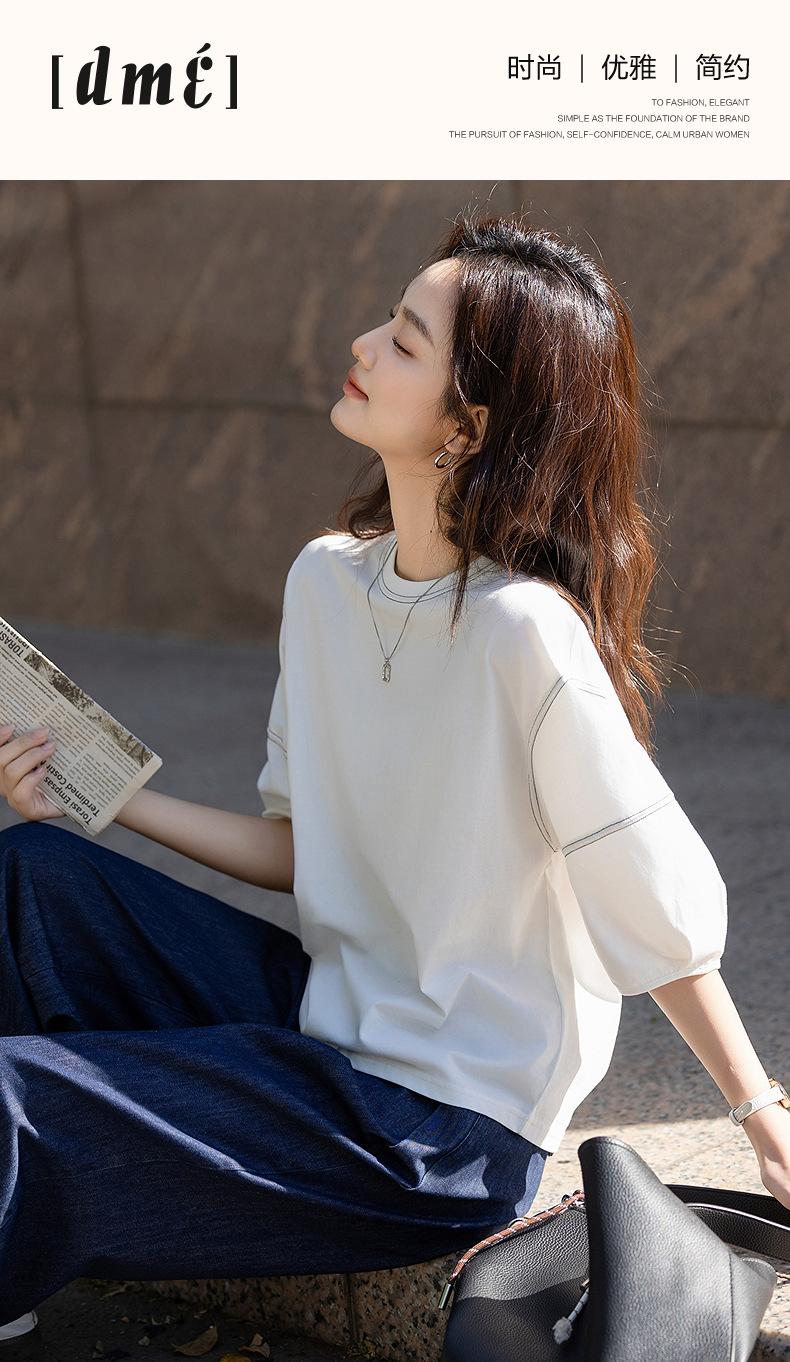 Demana Blusa de Manga Tres Cuartos para Mujer 2025 Primavera y Verano Nueva Cuello Redondo Línea de Contraste Decorativa Casual Manga Linterna
