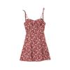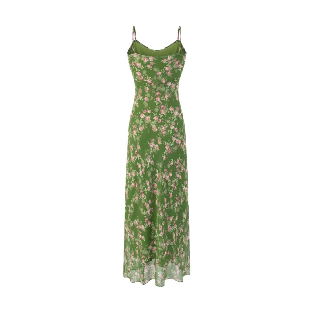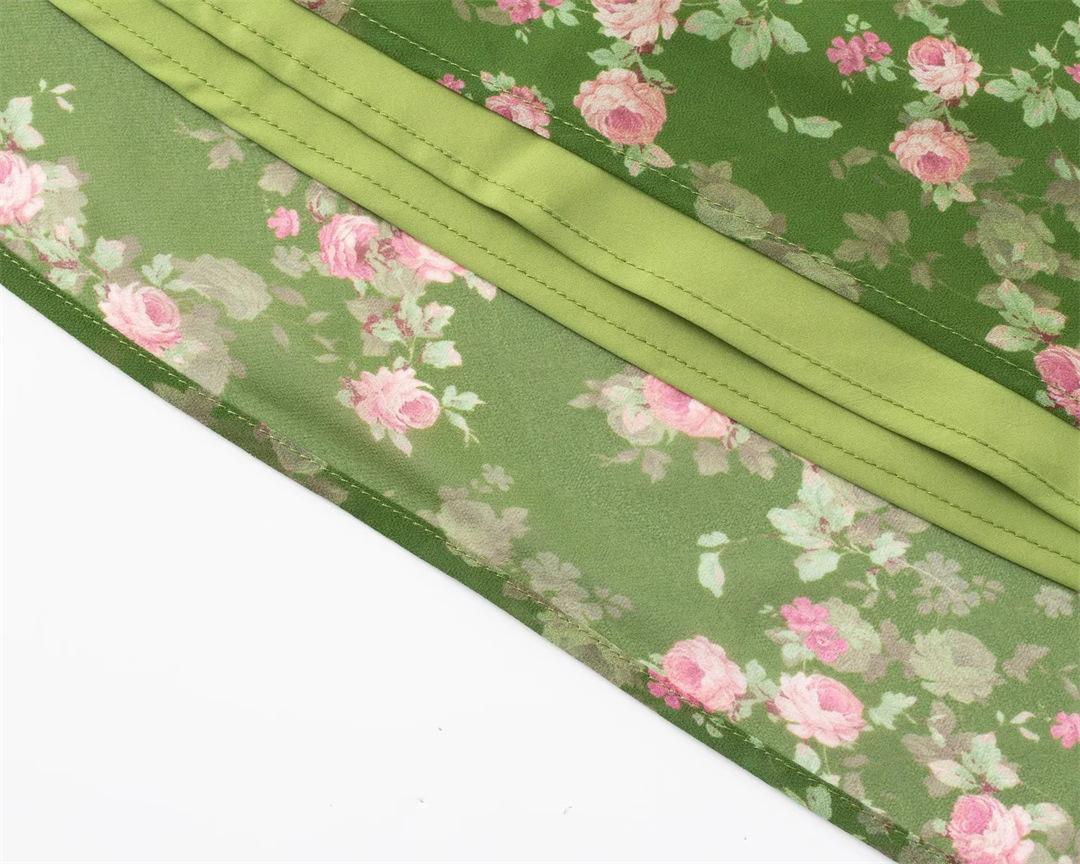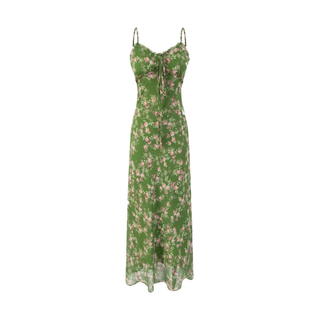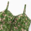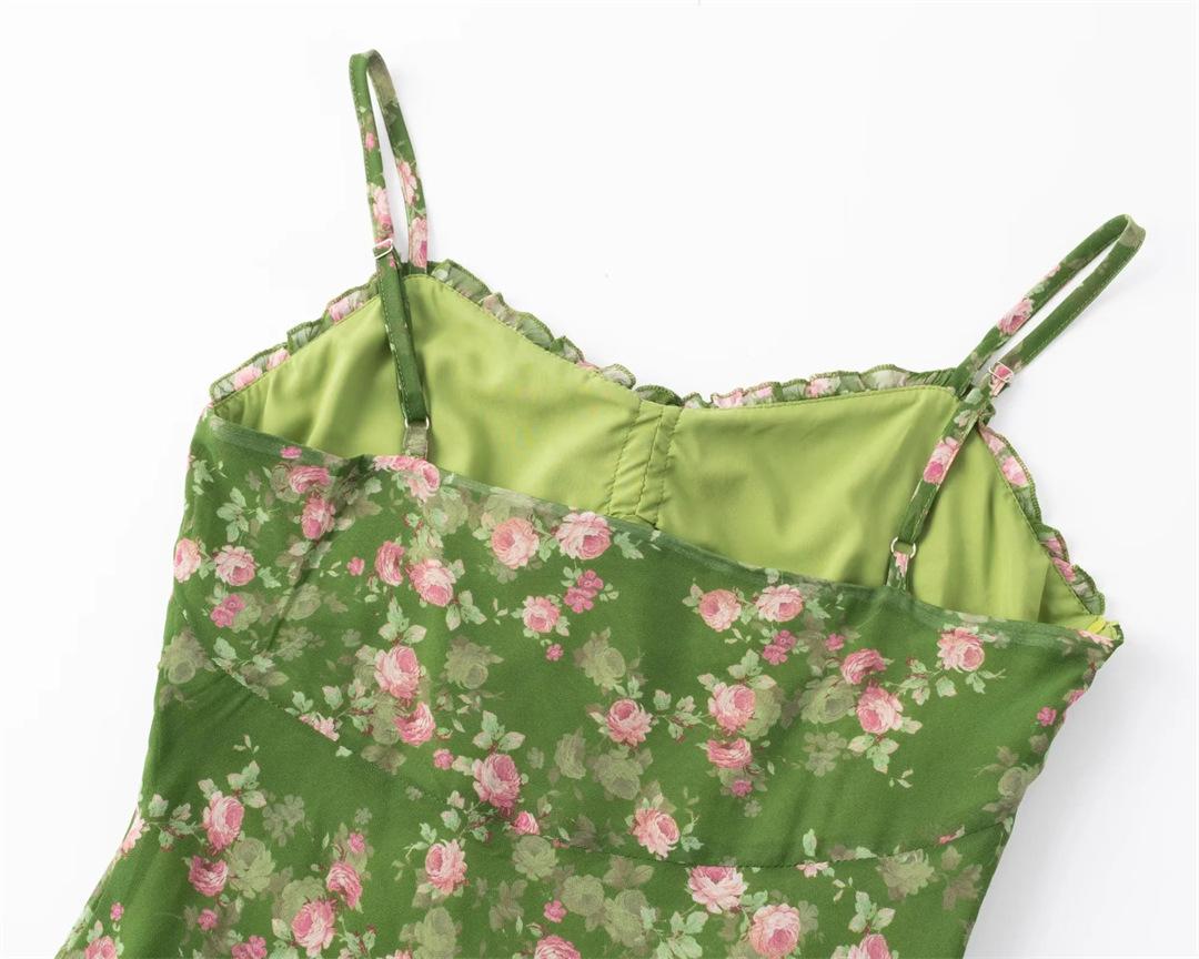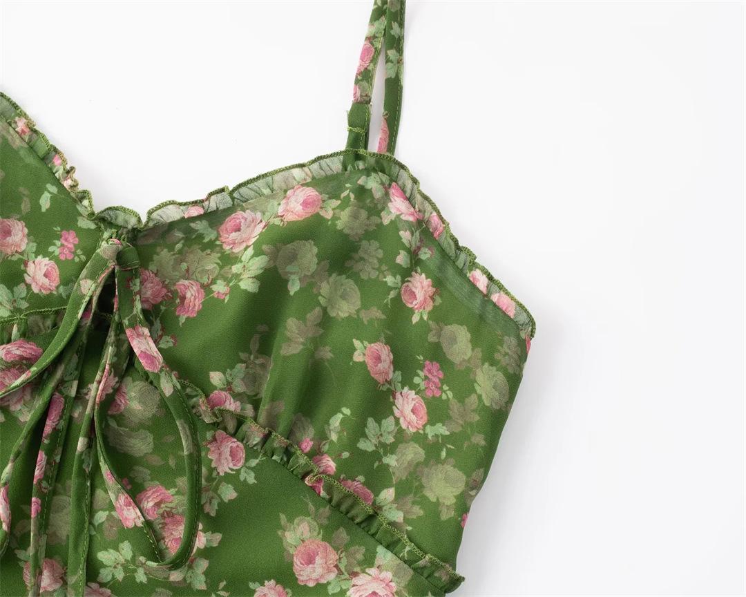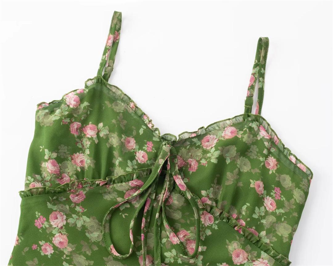 Vestido de Tirantes Estampado Verde de Verano Nicho Francés Vintage Vestido de Vacaciones Junto al Mar Ajustado con Cordones para Chica Hot