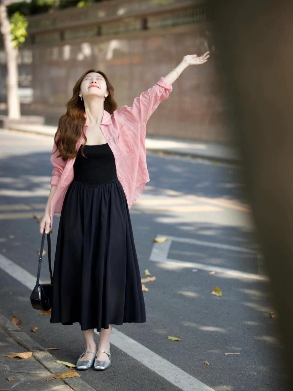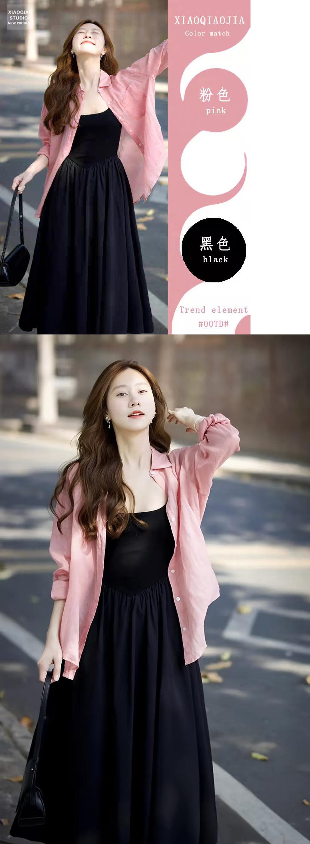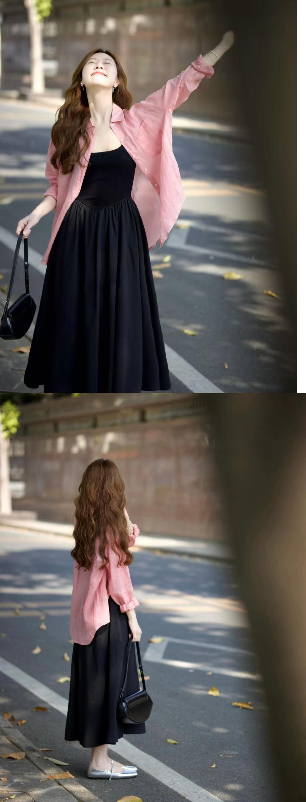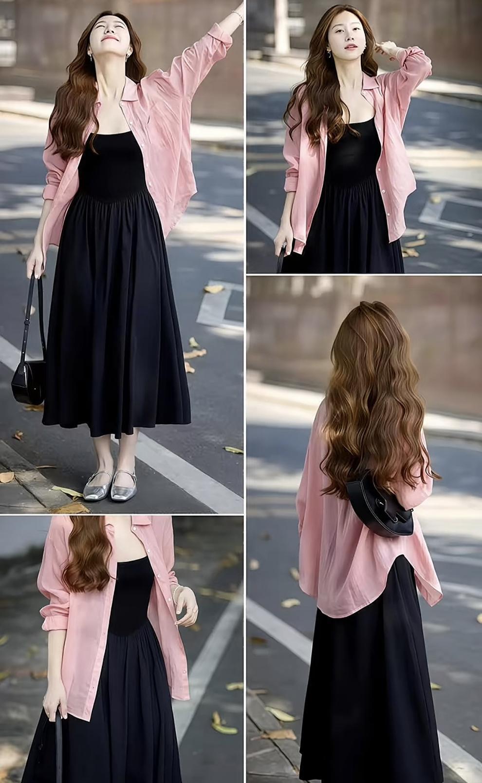 Pink shirt, Black sundress, Pink shirt + black sundress suit