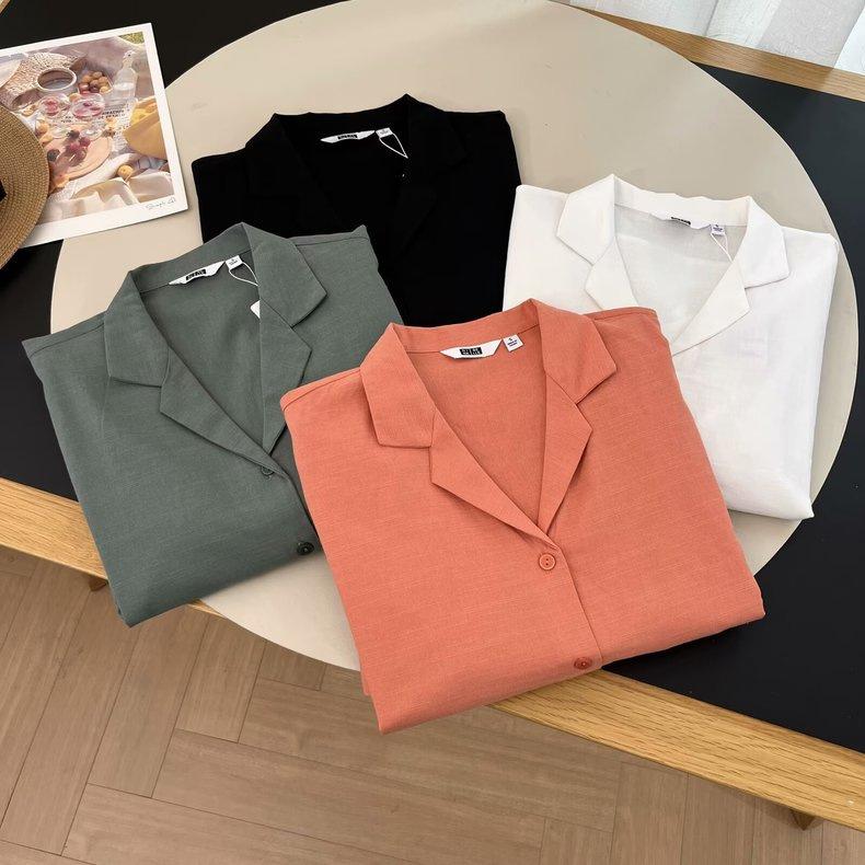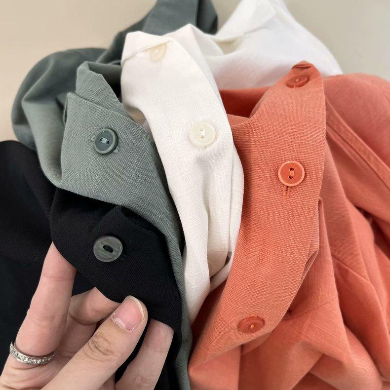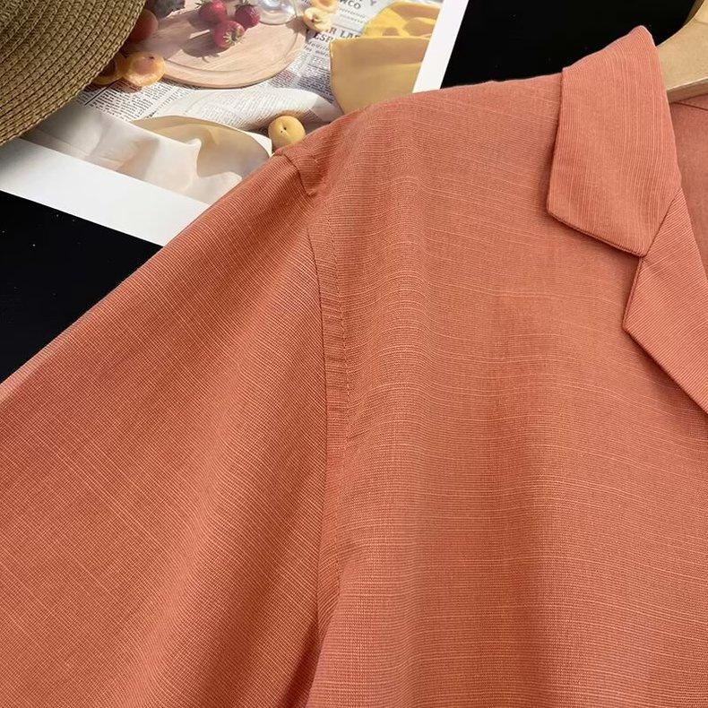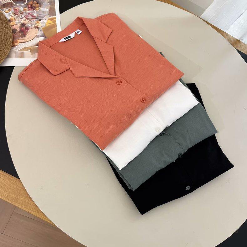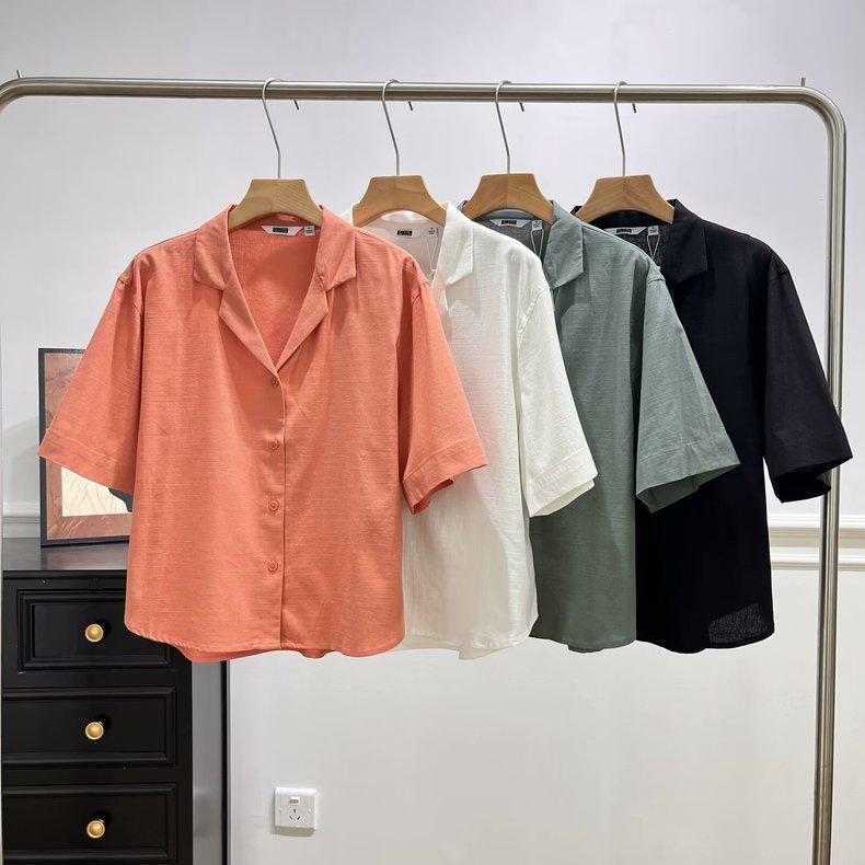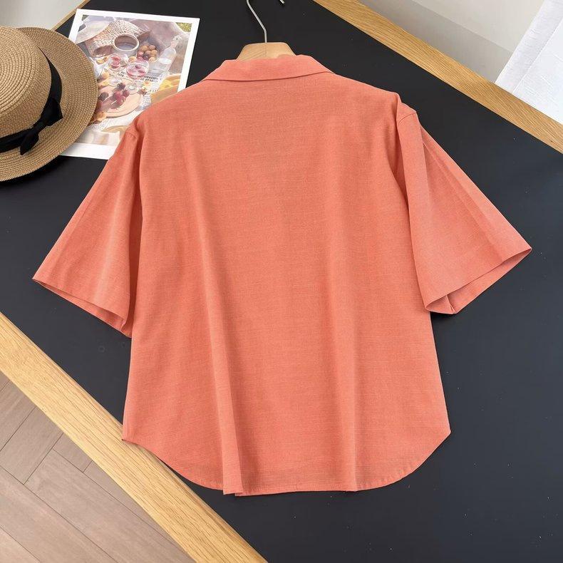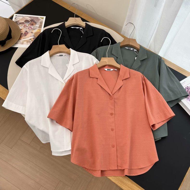 2025 Primavera y Verano Nueva Camisa de Color Sólido con Cuello Abierto para Mujer Casual para Ir al Trabajo Manga Corta Camisa de Lino para Mujer Y475651
