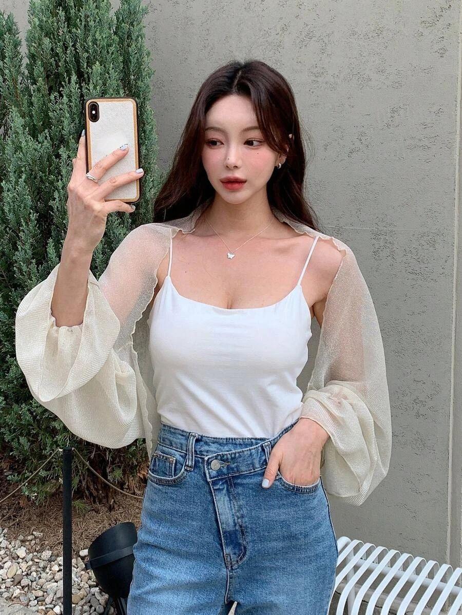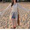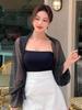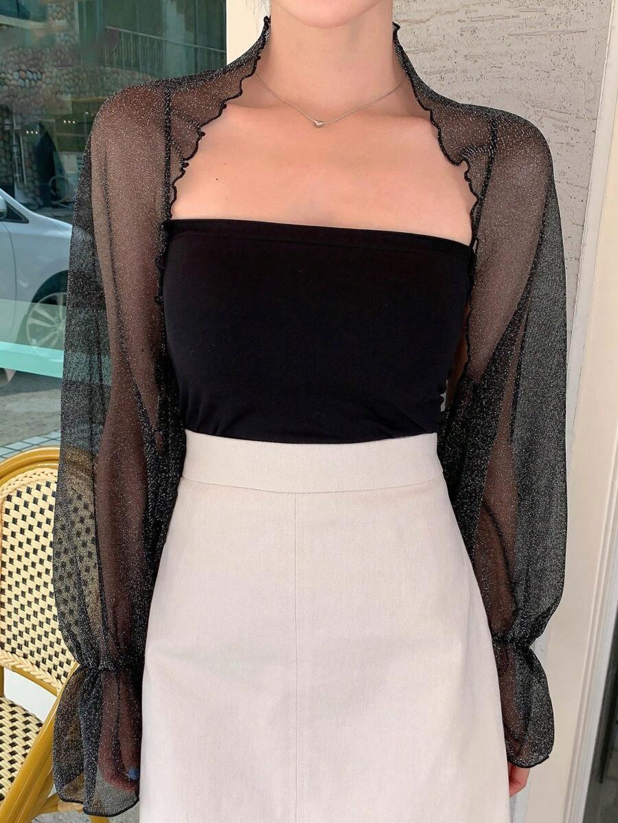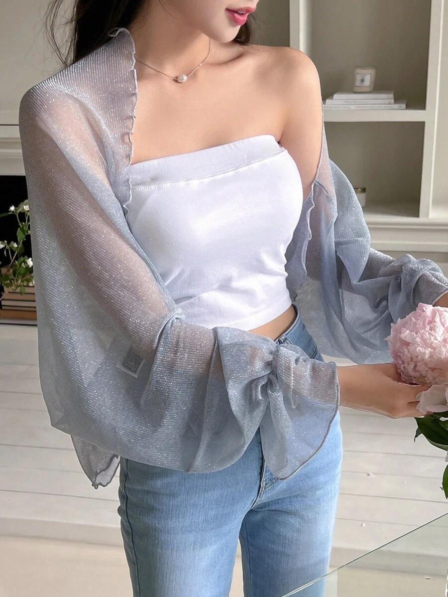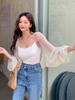Blusa tipo cárdigan con mangas abullonadas y cuello halter, estilo veraniego, con estampado de hojas de loto