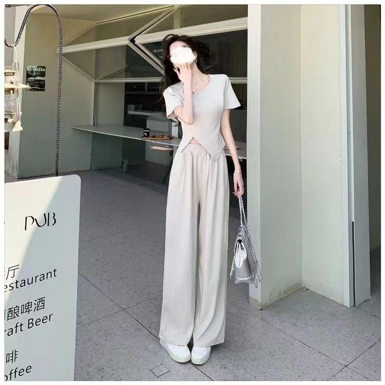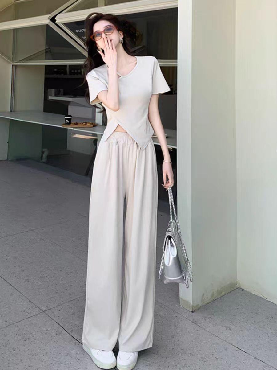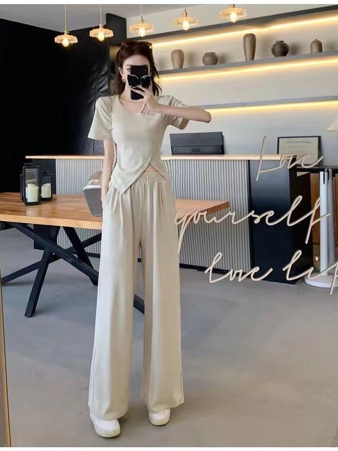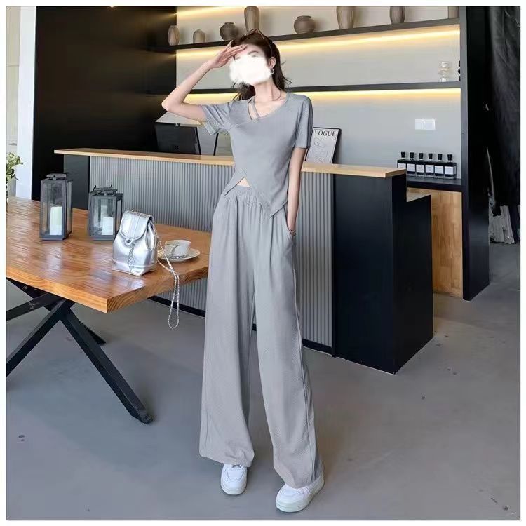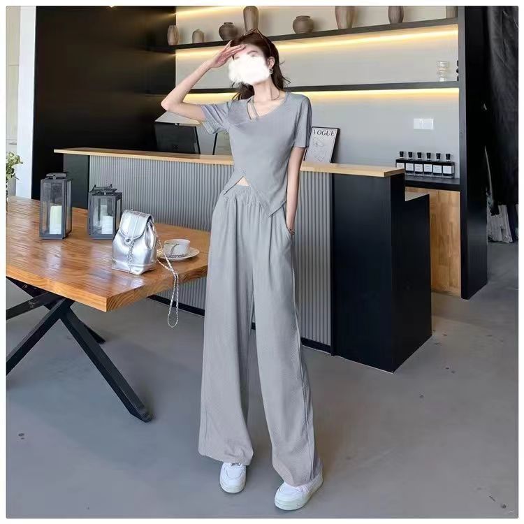 Moda de Verano Nuevo traje Top Nicho Irregular Slim de Alta Gama Suelto Combinable Pantalones de Pierna Ancha Conjunto de Dos Piezas