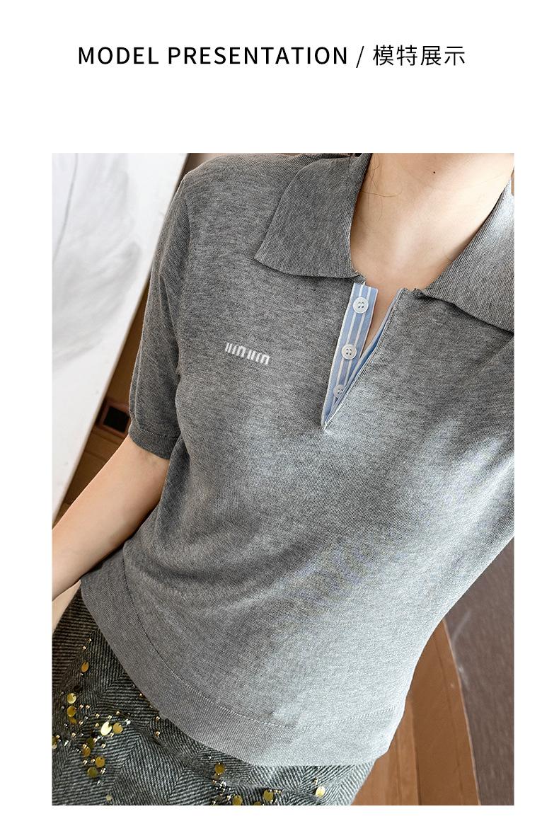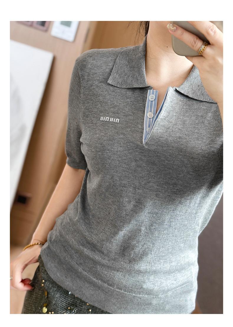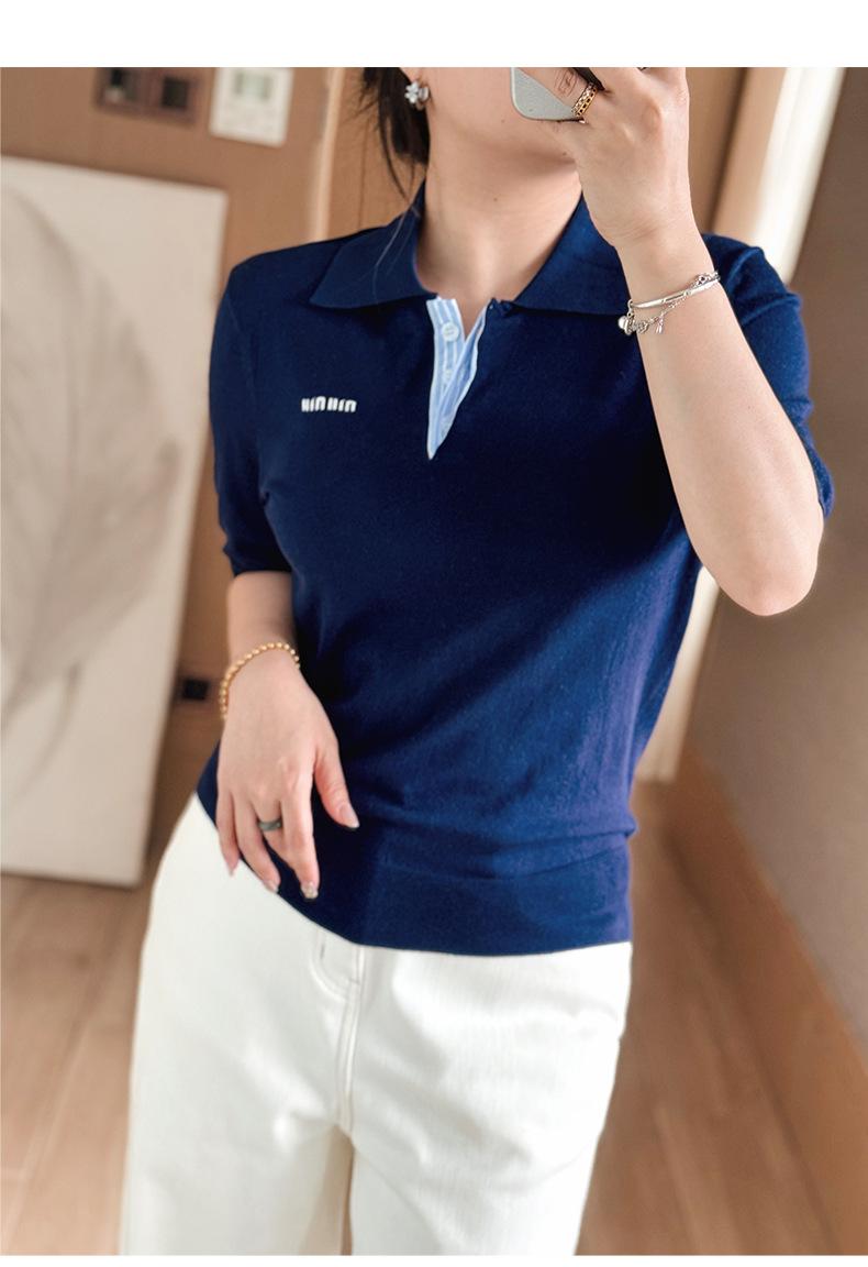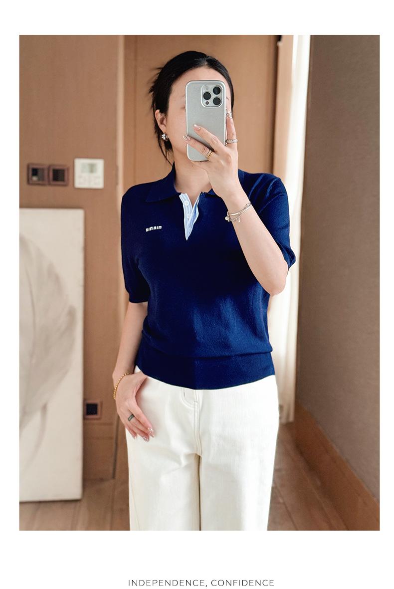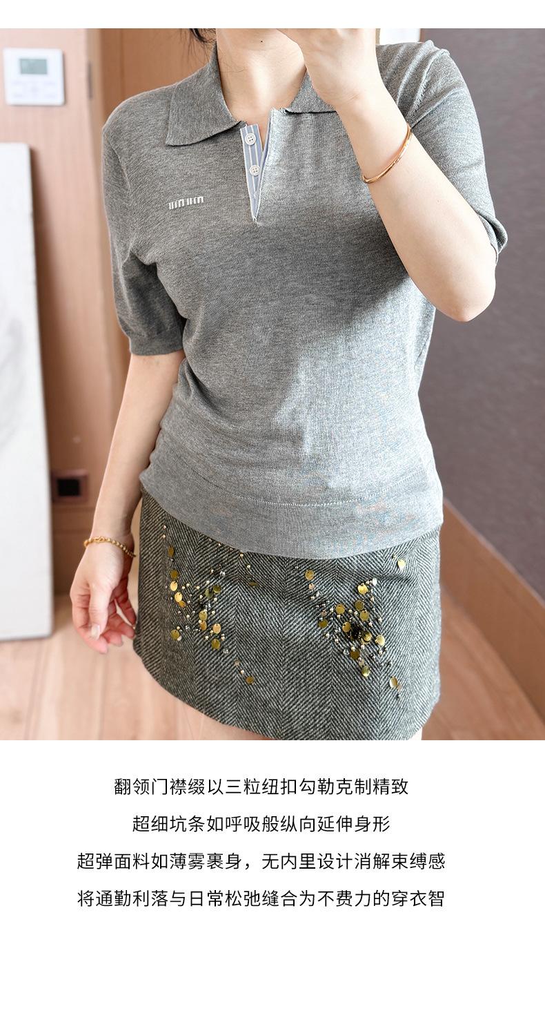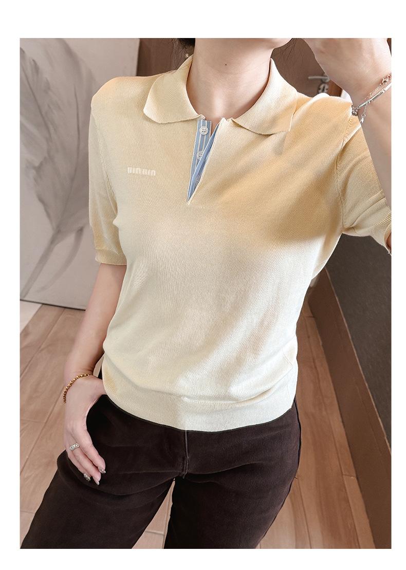 2503109- Casual Casual Ropa de Trabajo Solapa Tejido de Punto Fino de 16 Agujas Lenzing Tencel Logotipo de Letra Top de Punto para Mujer
