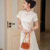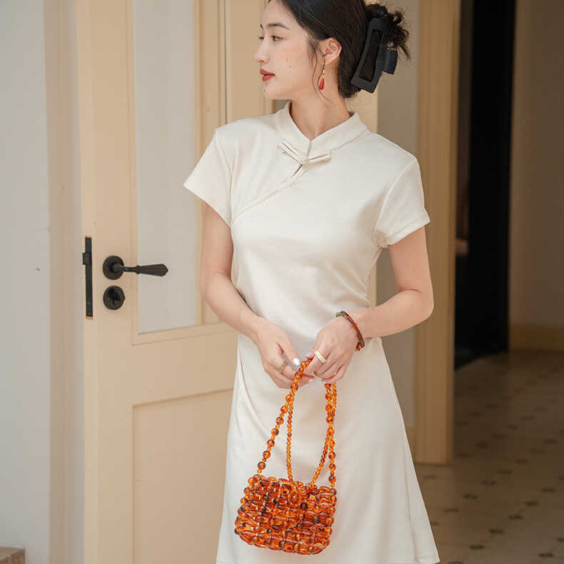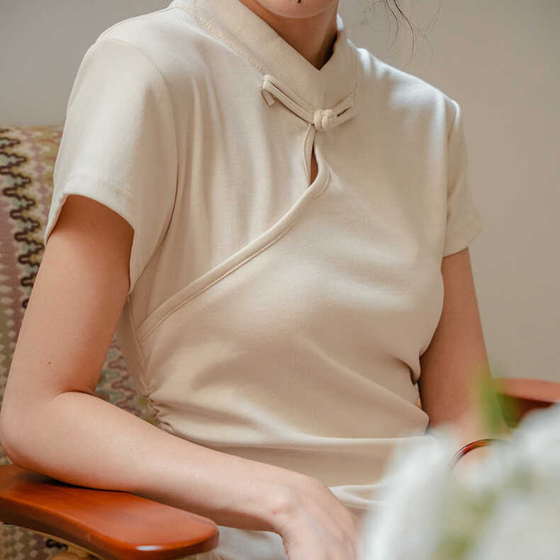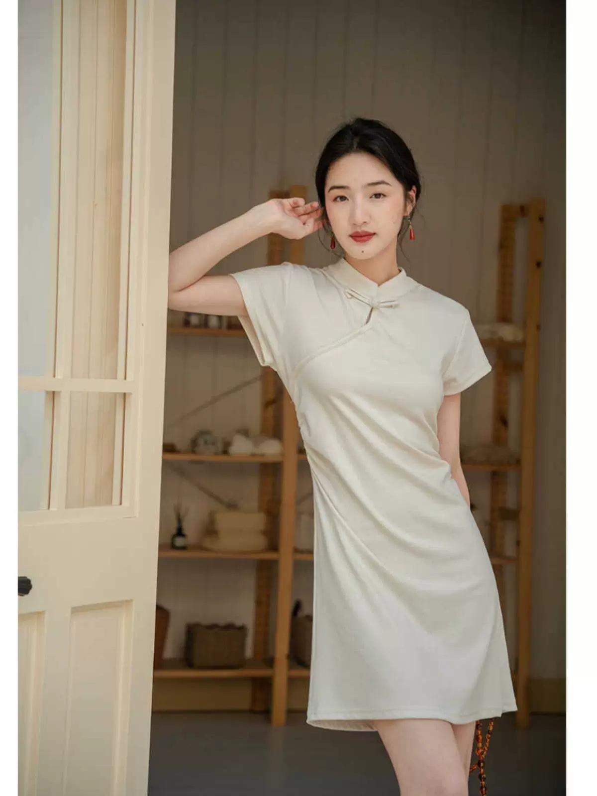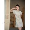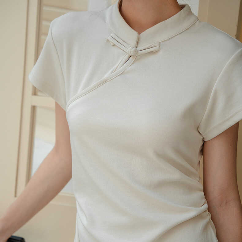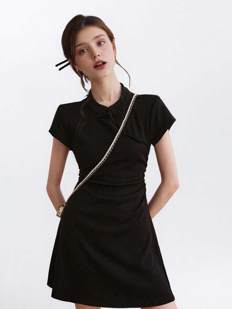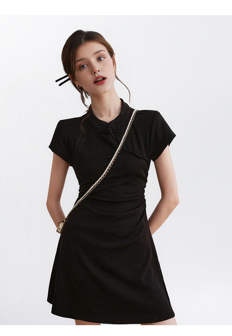 Pequeño Verano Nueva Llegada Hebilla Cheongsam Mejorado con Color Sólido Ahuecado Cintura Ajustado Vestido Ajustado Falda Corta Moderna