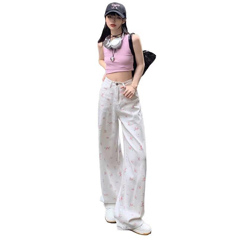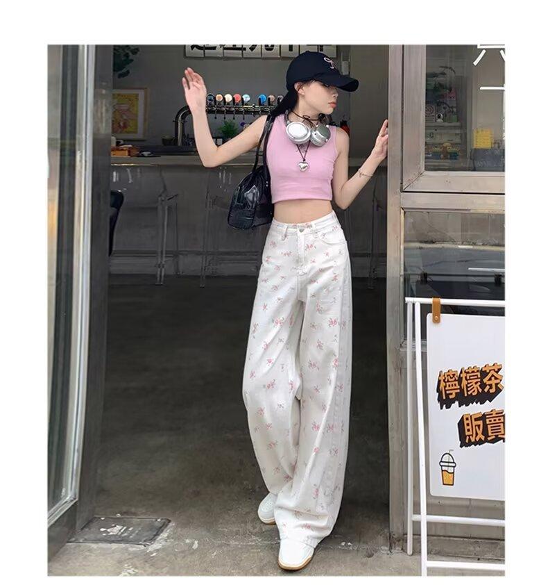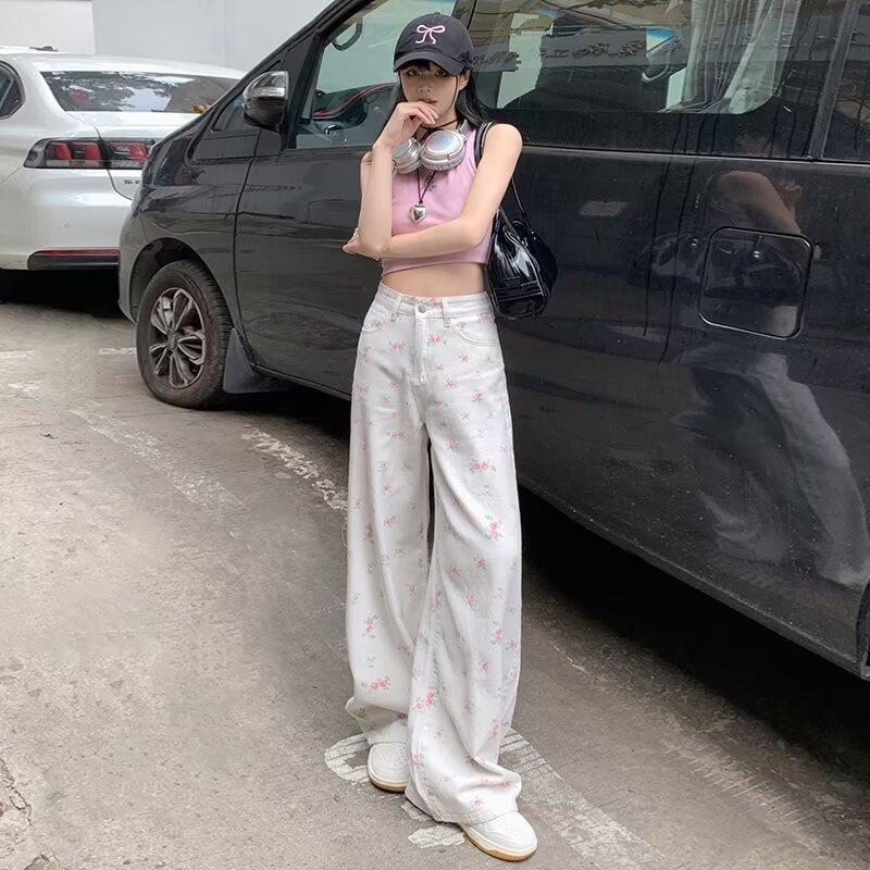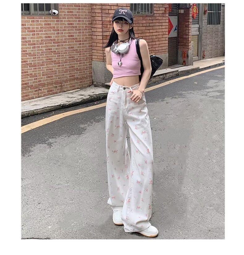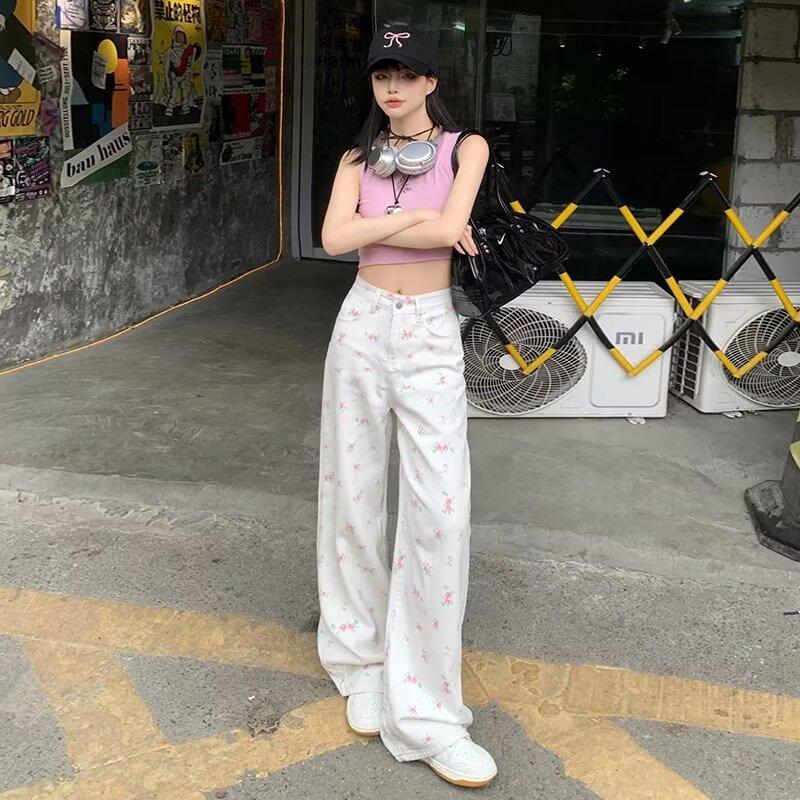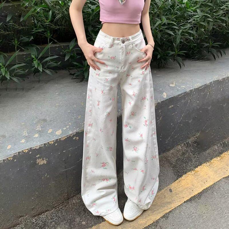 Pantalones rectos florales retro estilo americano para mujer Primavera y Otoño 2024 Primavera Temprana Nuevo Pantalones de pierna ancha de cintura alta Pantalones casuales holgados adelgazantes