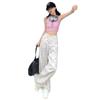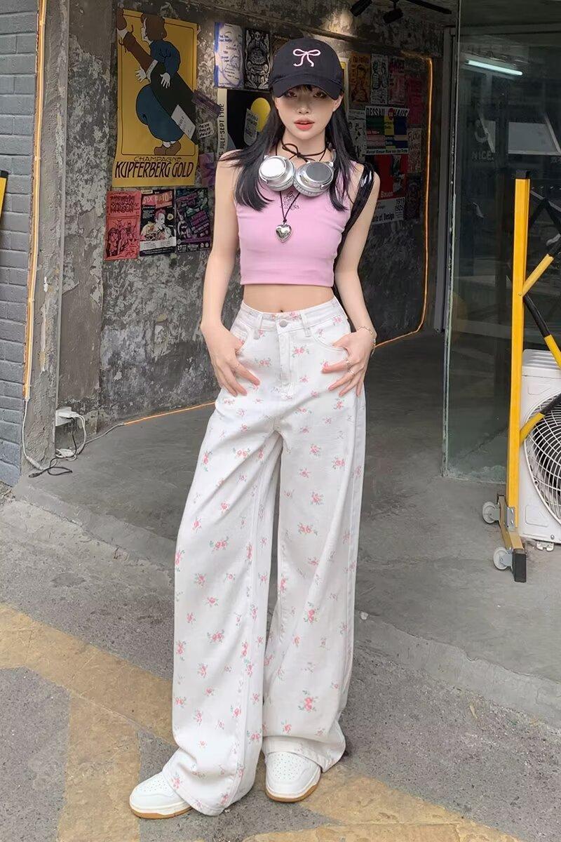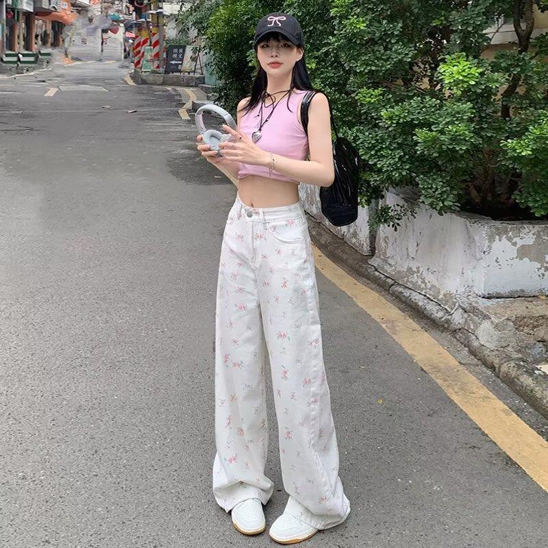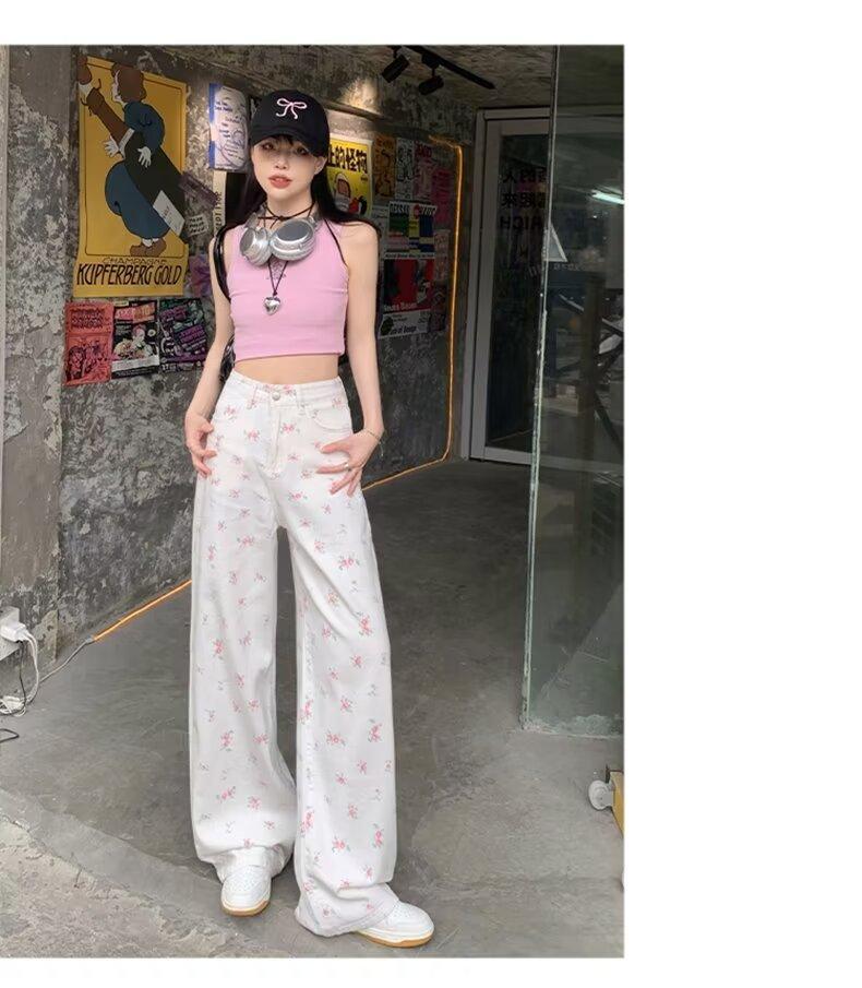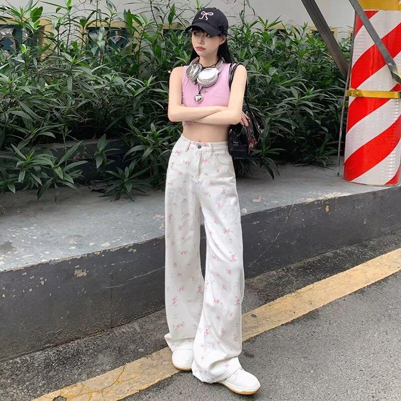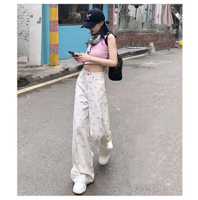 Pantalones rectos florales retro estilo americano para mujer Primavera y Otoño 2024 Primavera Temprana Nuevo Pantalones de pierna ancha de cintura alta Pantalones casuales holgados adelgazantes