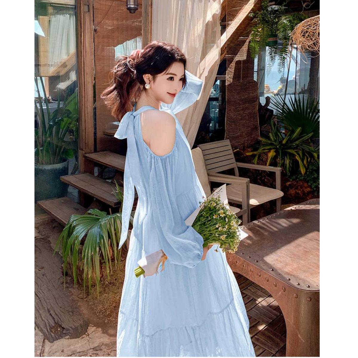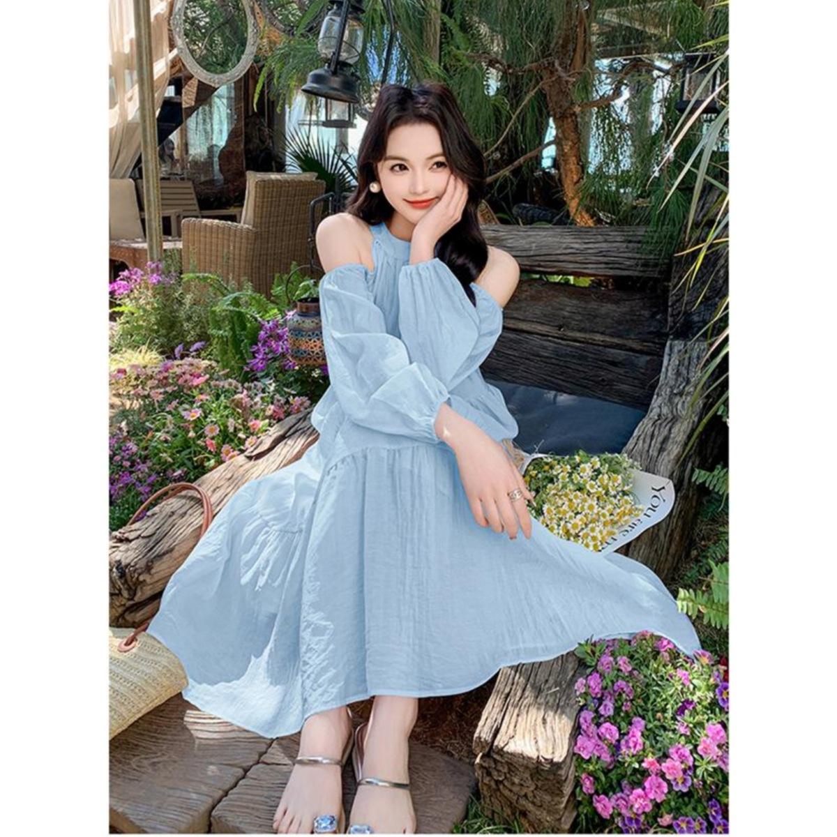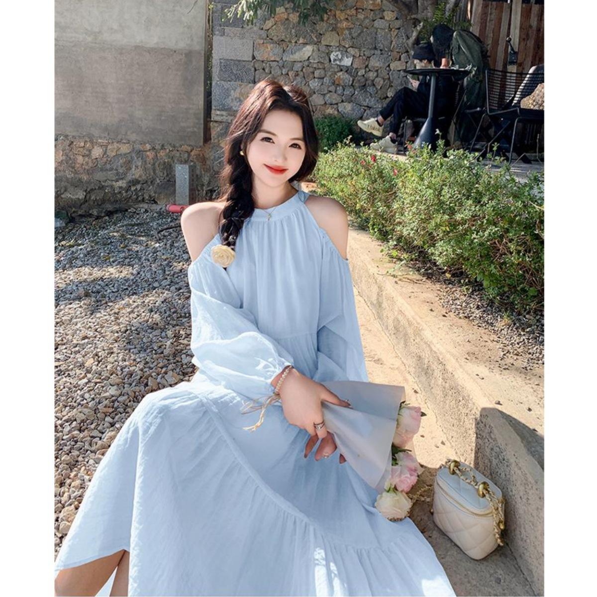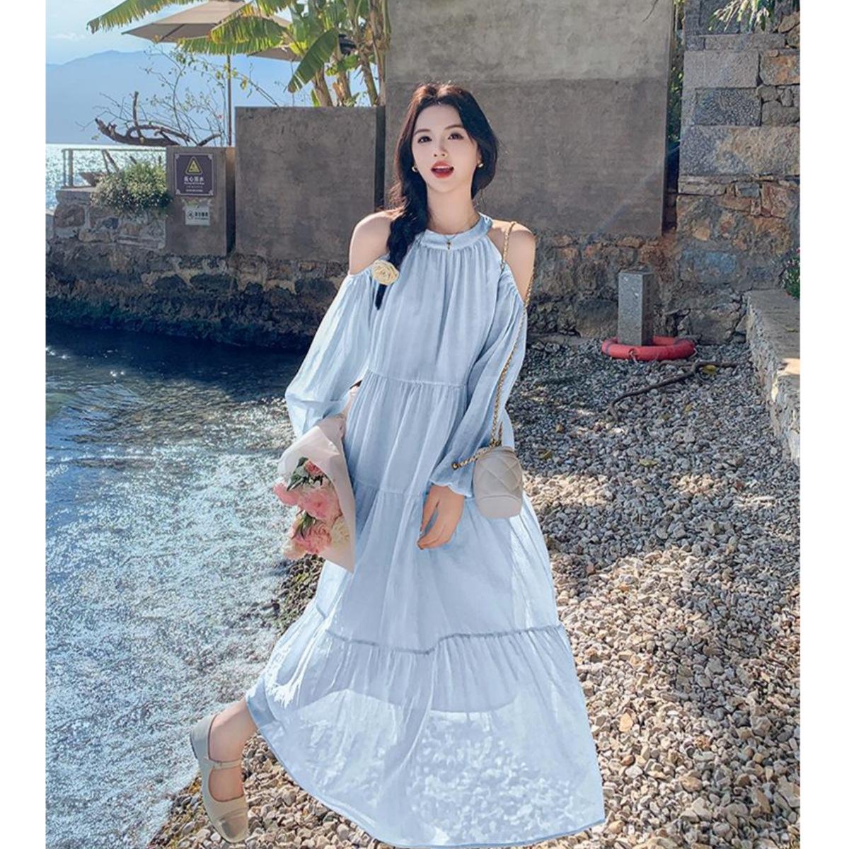 Vestido de vacaciones azul claro junto al mar para mujer Primavera y verano 2025 Nuevo popular de este año Hermosa falda de hada con hombros dulces
