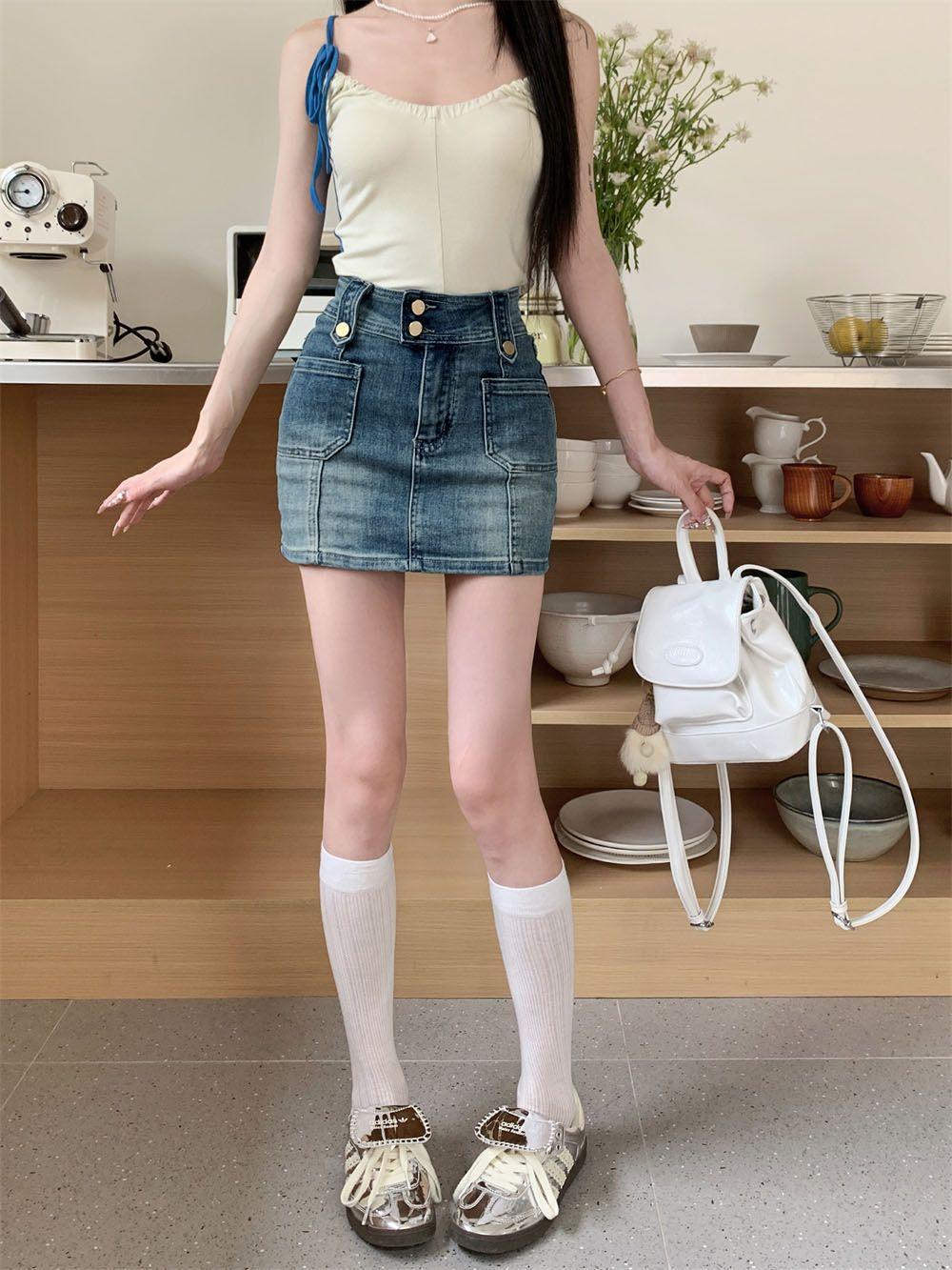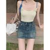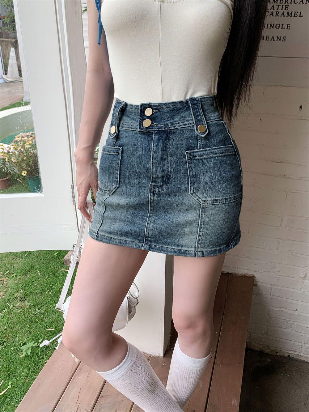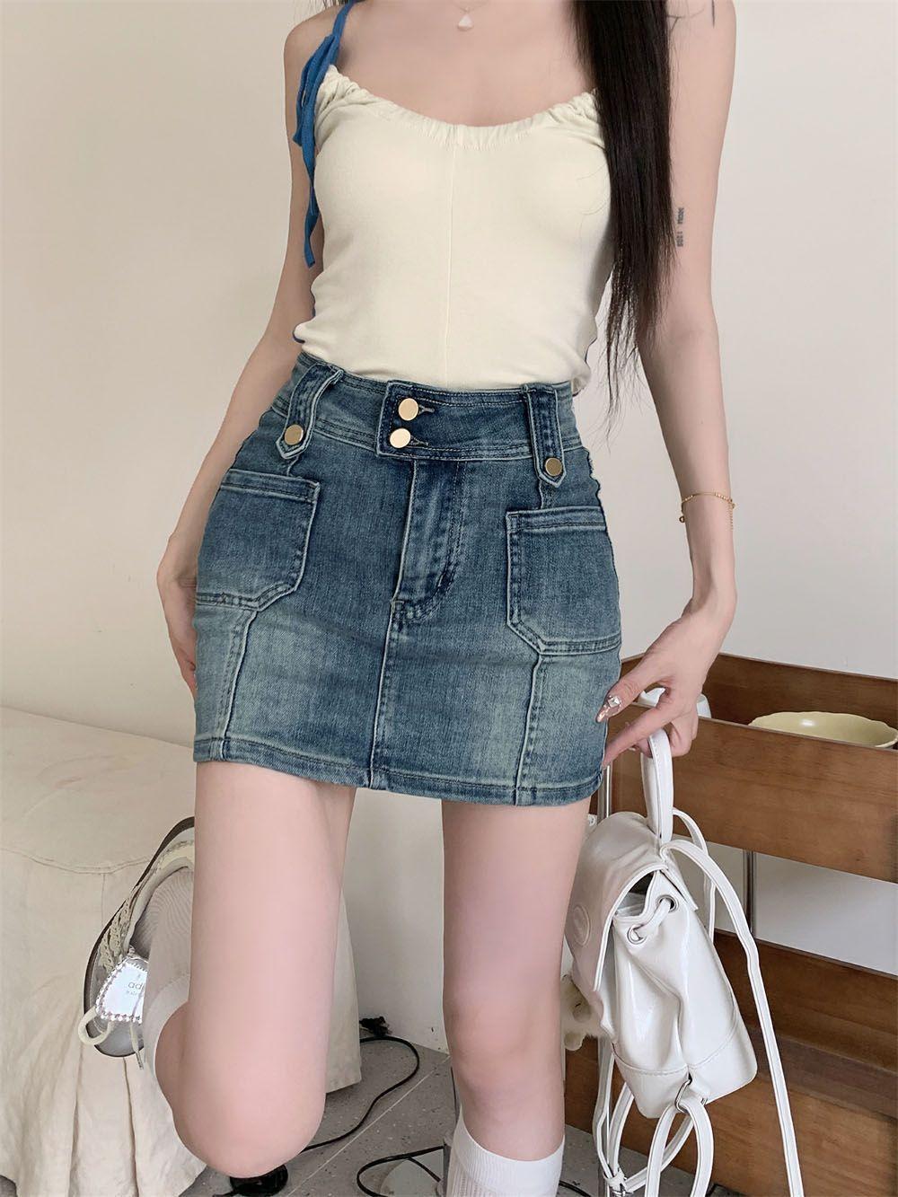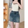 Falda Corta de Mezclilla Azul Vintage de Verano Anti-Exposición Moda Mujer 2025 Petite Cintura Alta Adelgazante Ajustada
