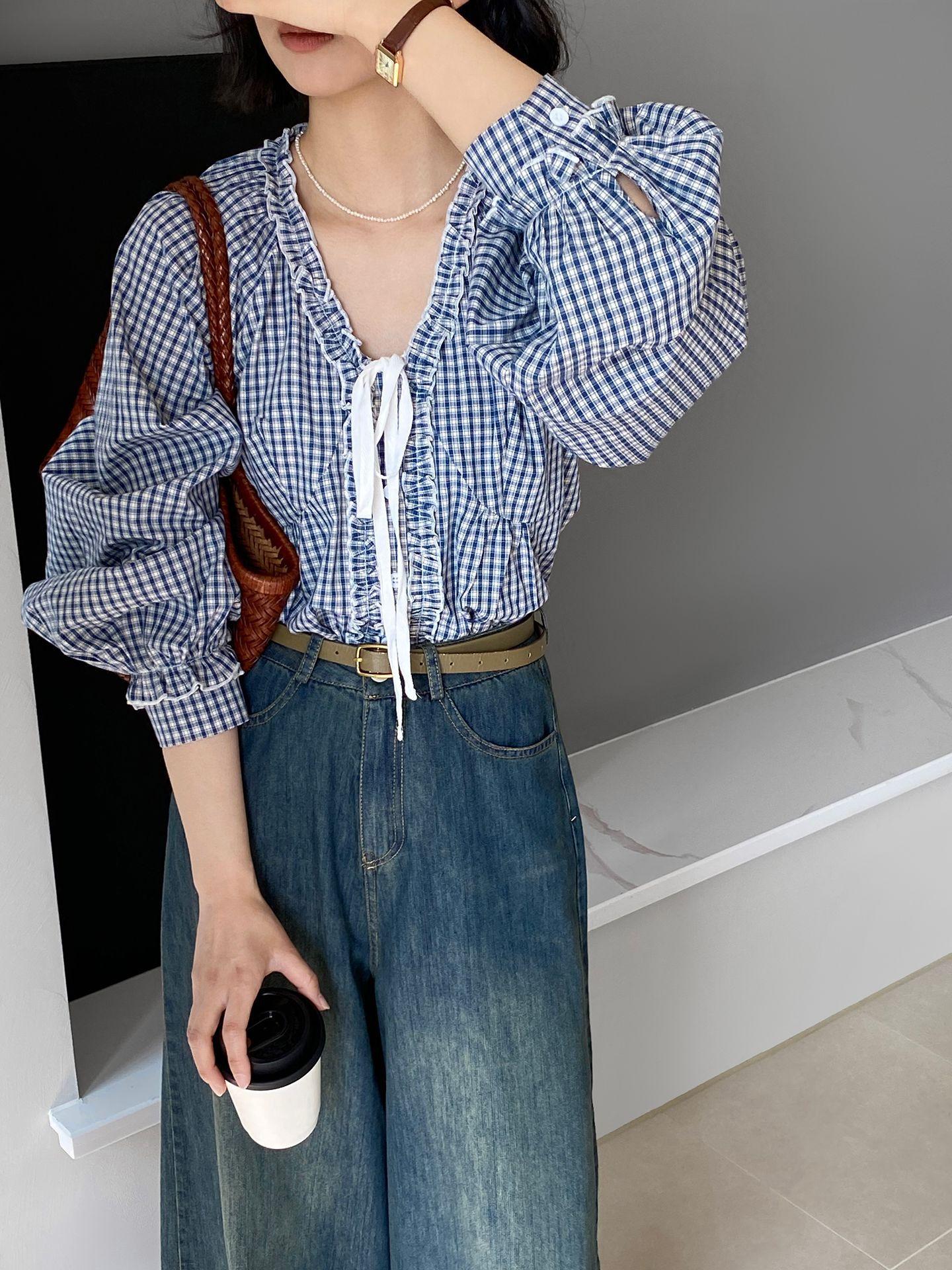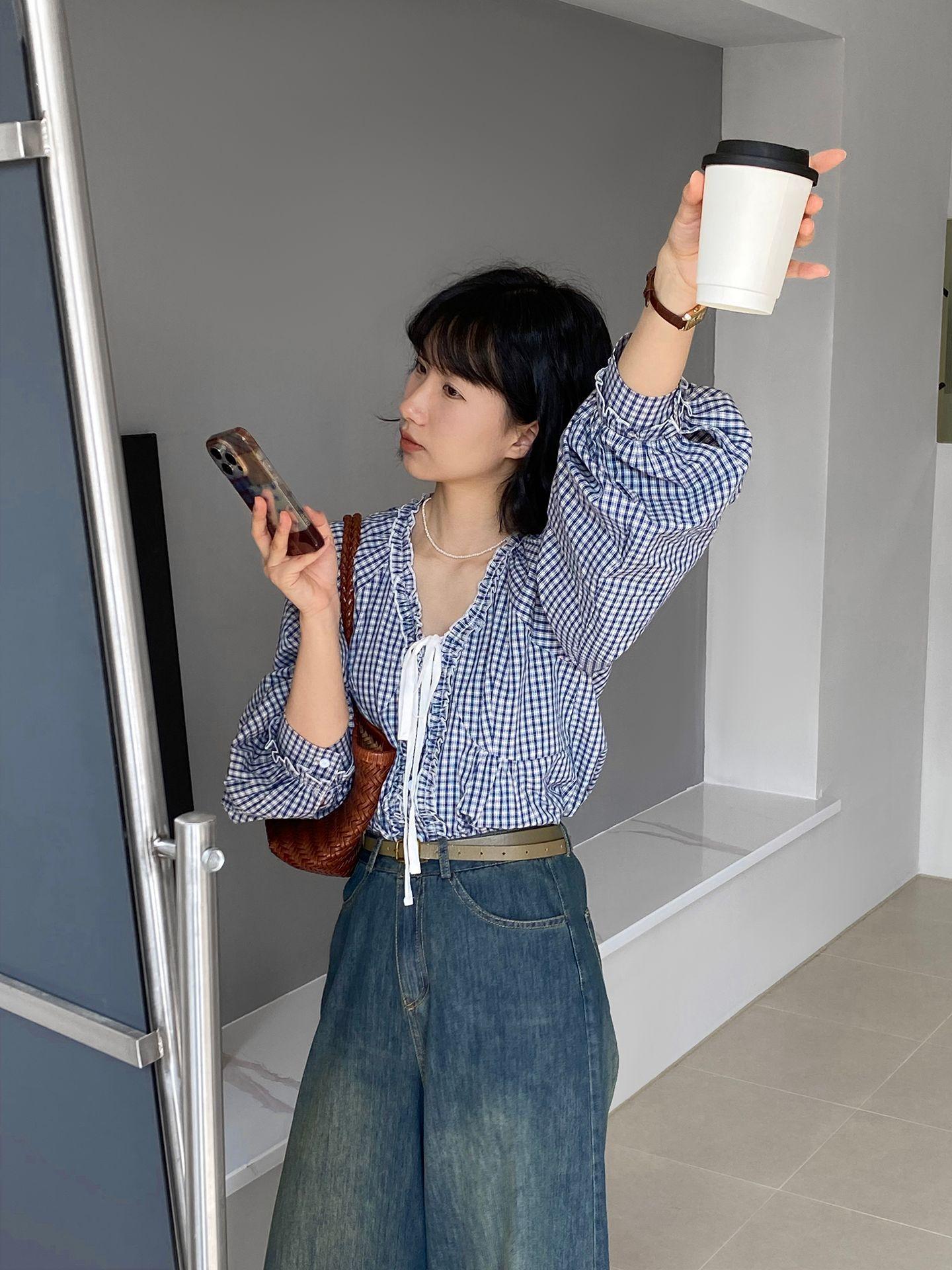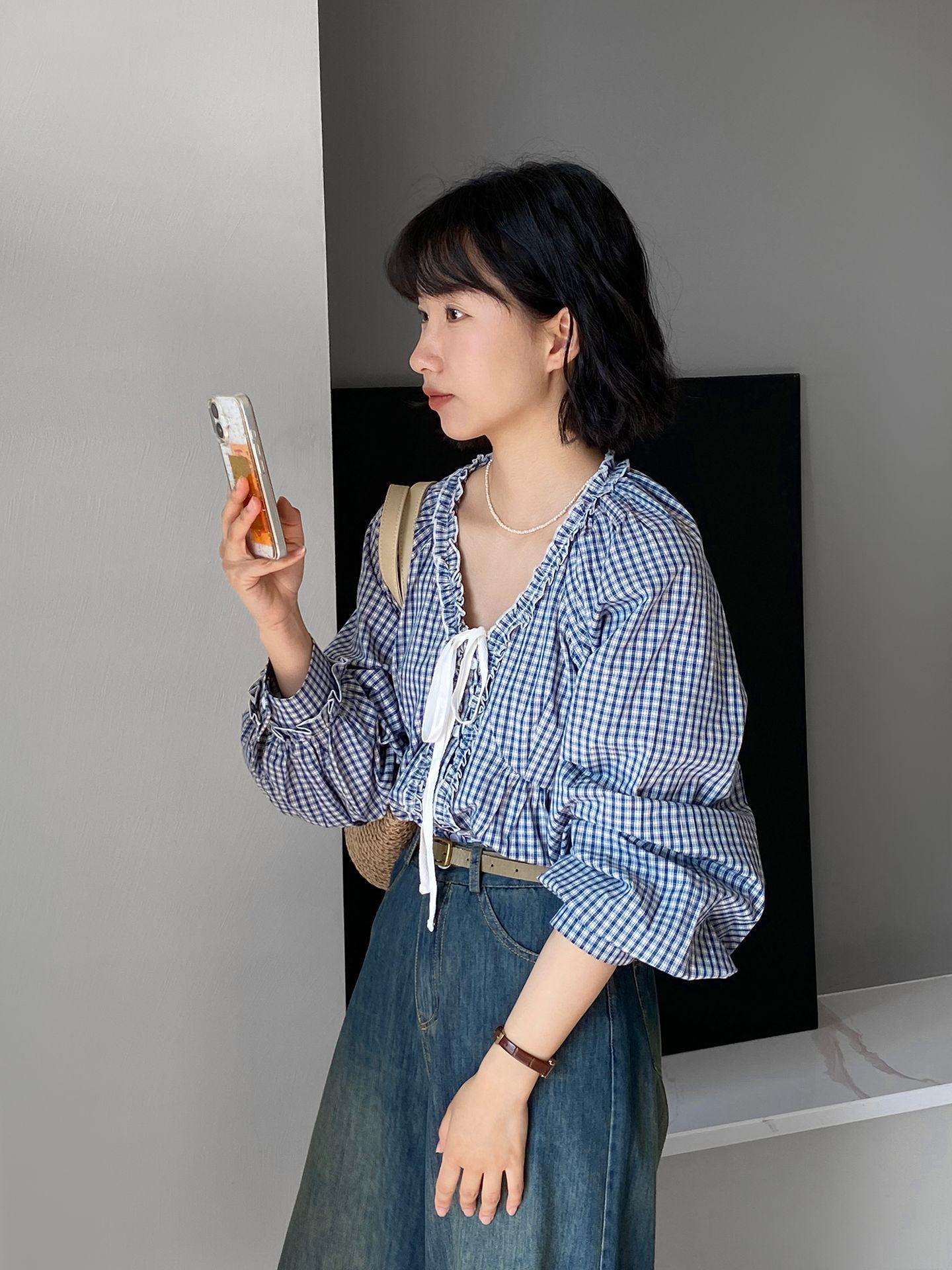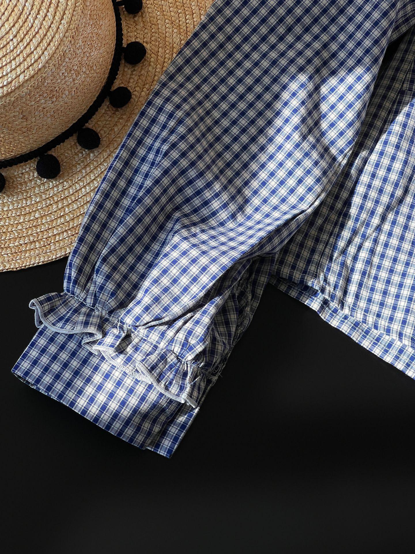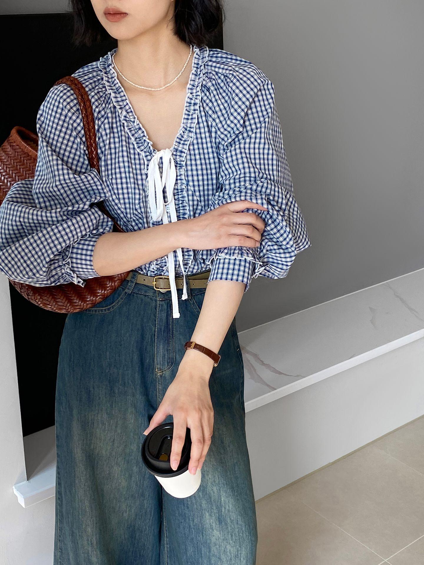Jiangzuo [Sicilia Romántica] Camisa azul a cuadros para mujer, cuello en V, mangas abullonadas, top corto 1320