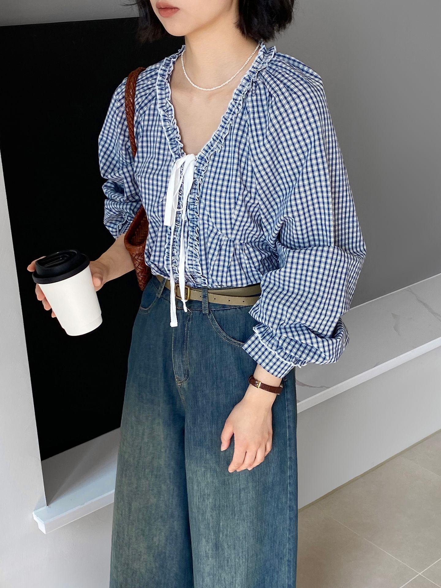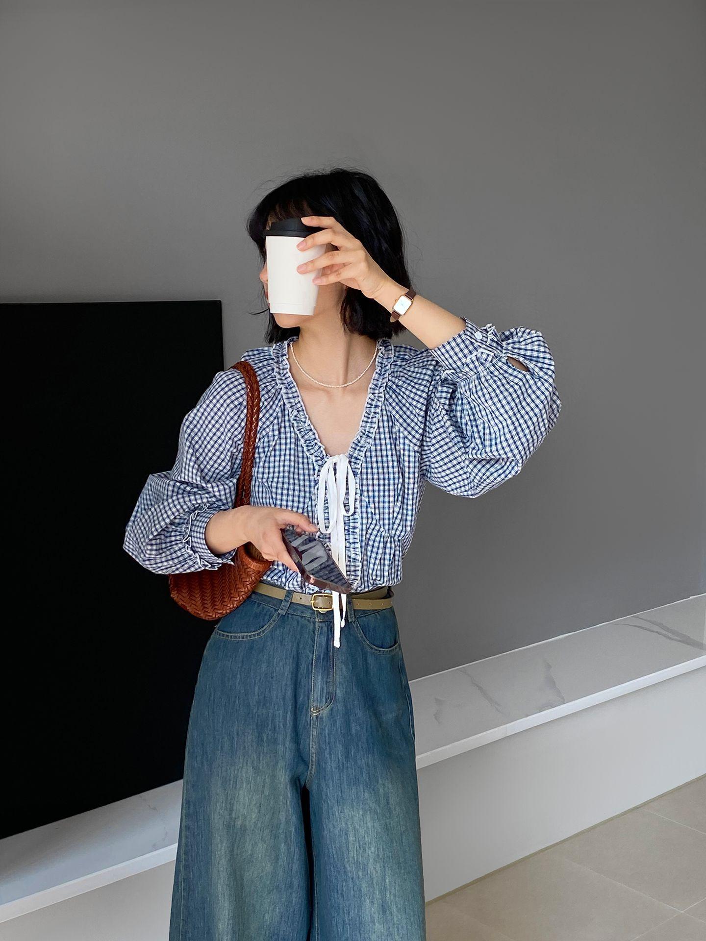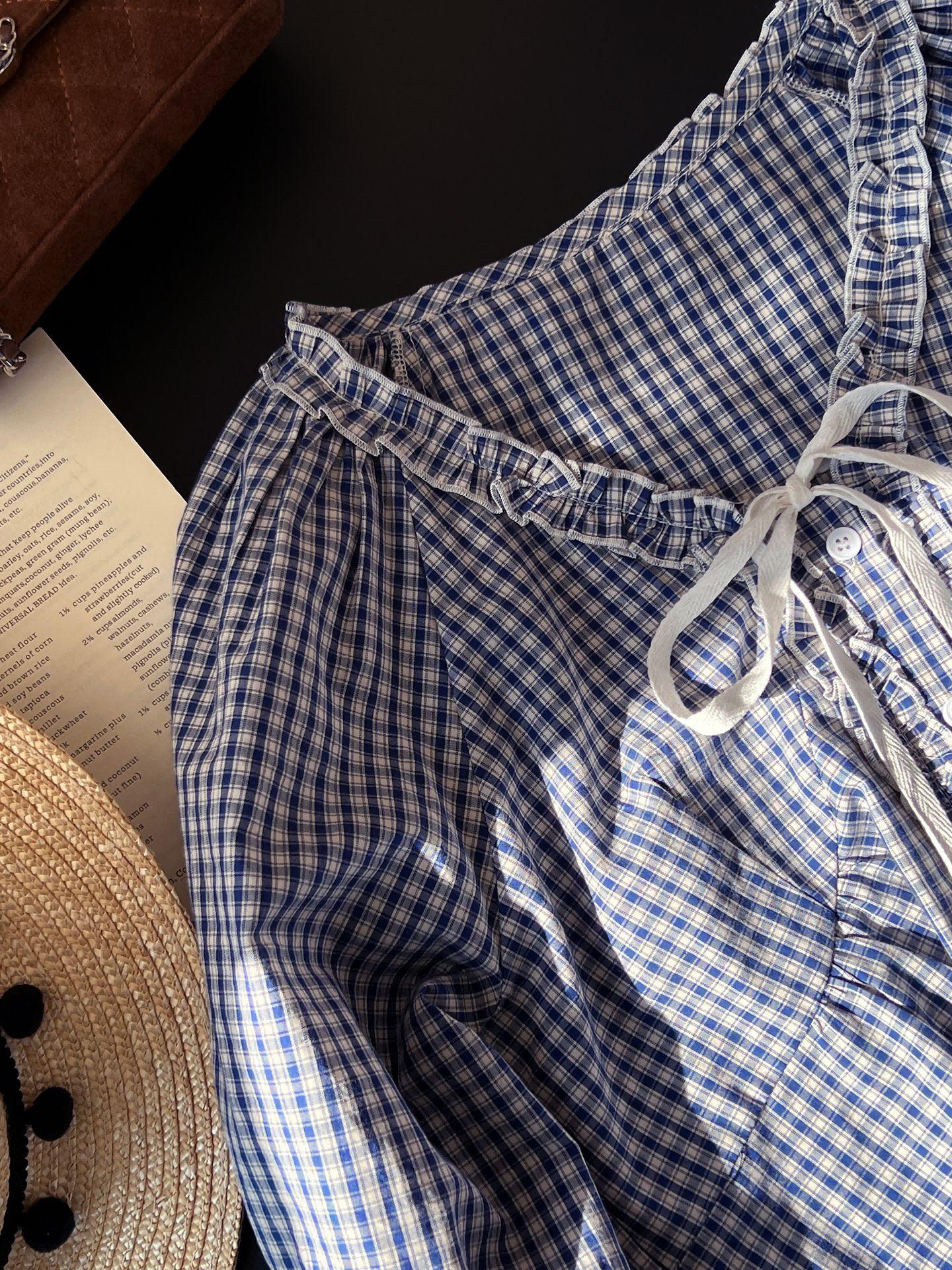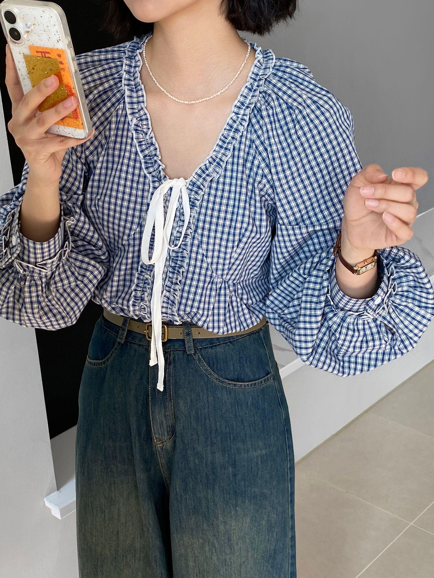 Jiangzuo [Sicilia Romántica] Camisa azul a cuadros para mujer, cuello en V, mangas abullonadas, top corto 1320