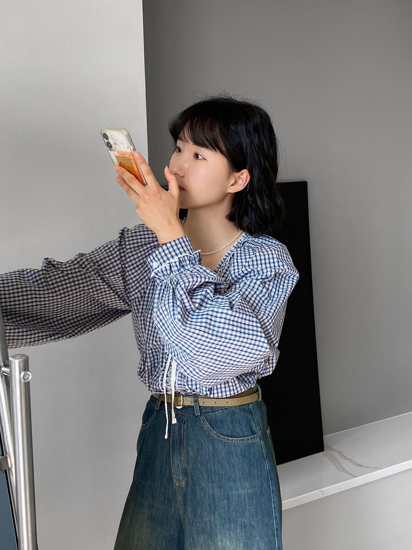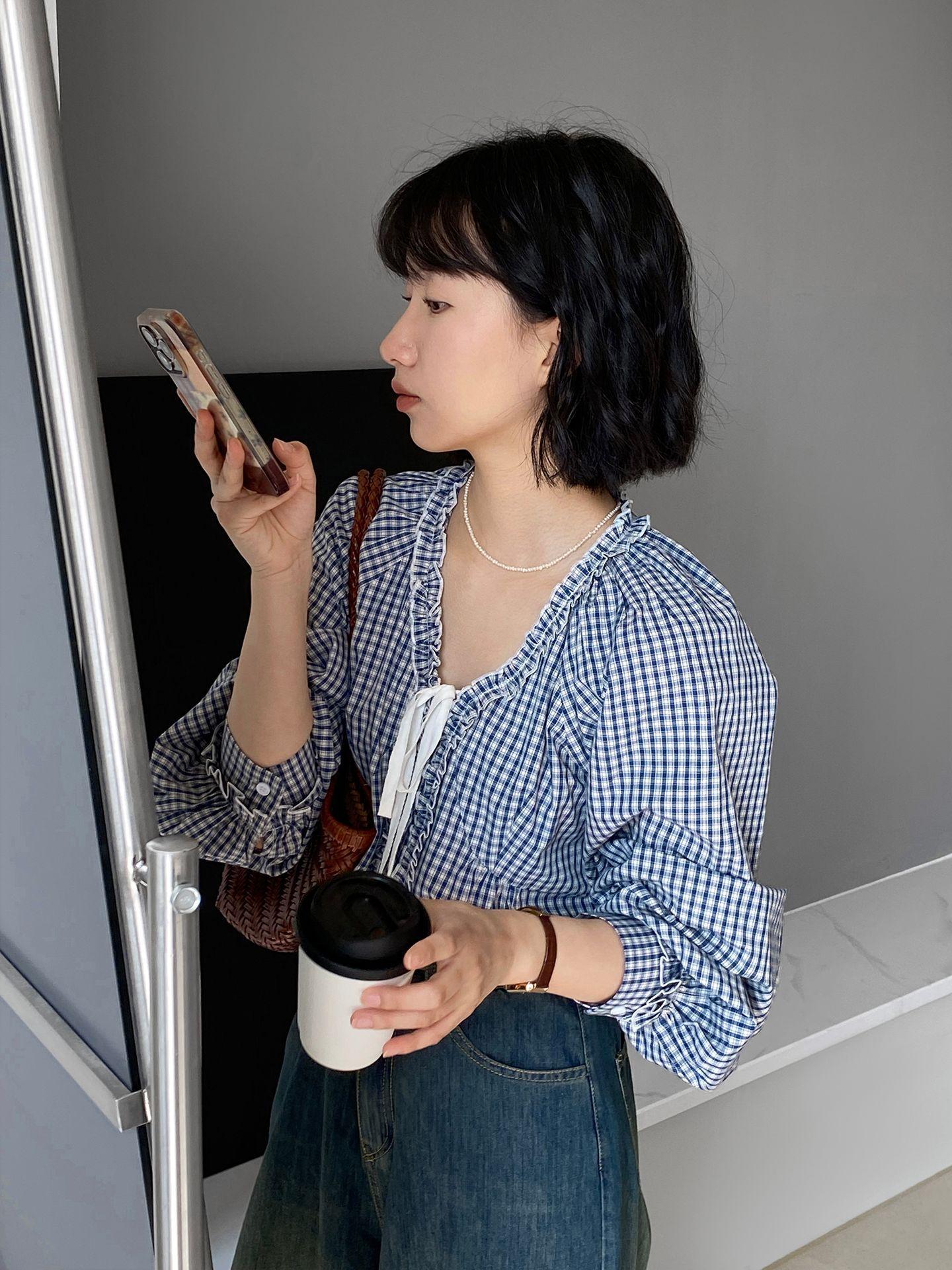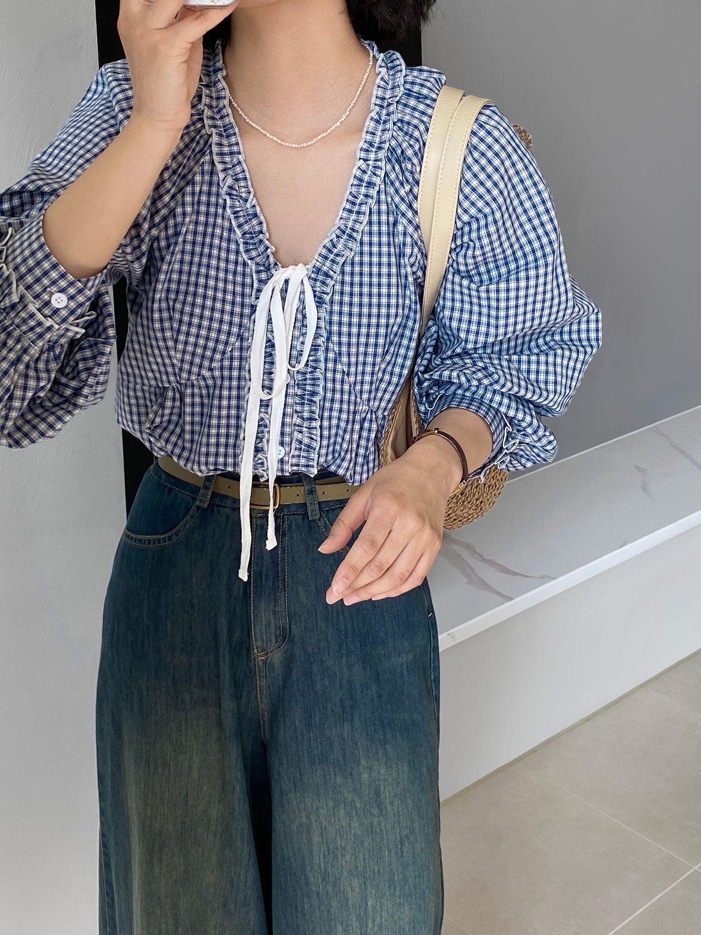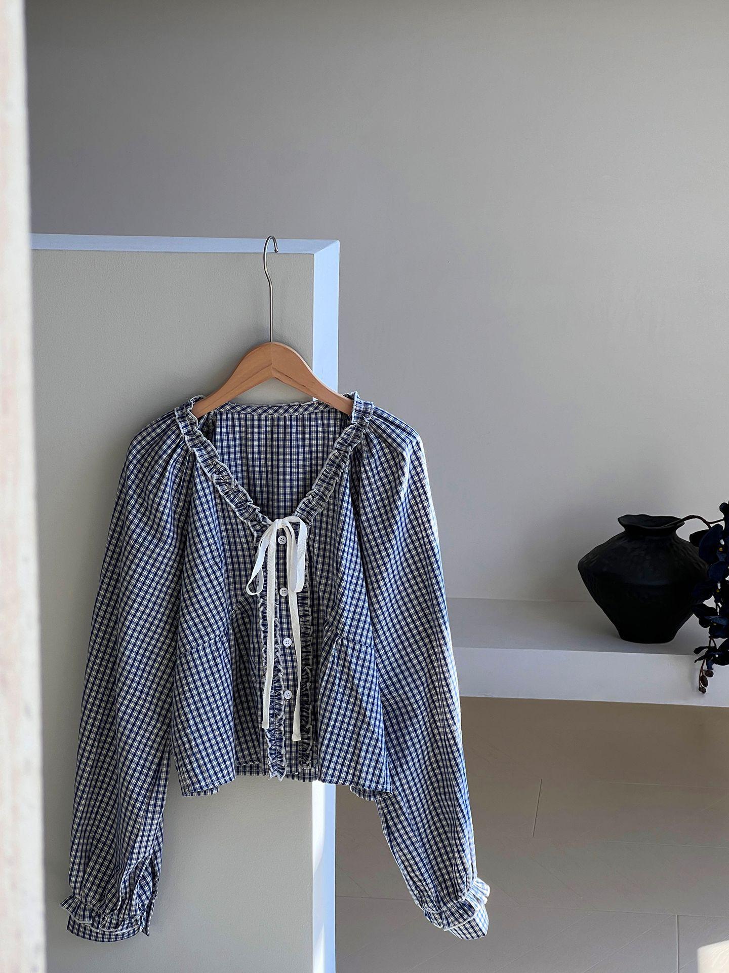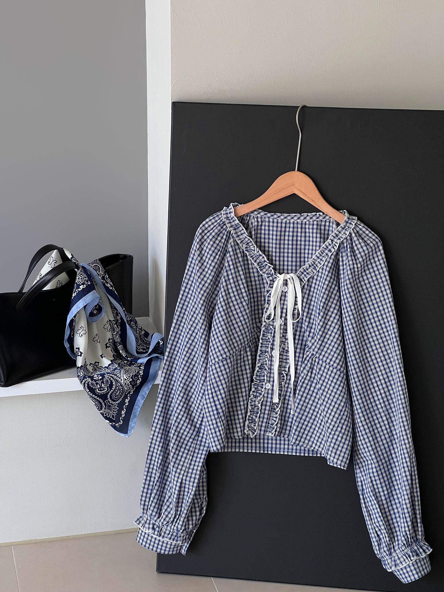 Jiangzuo [Sicilia Romántica] Camisa azul a cuadros para mujer, cuello en V, mangas abullonadas, top corto 1320