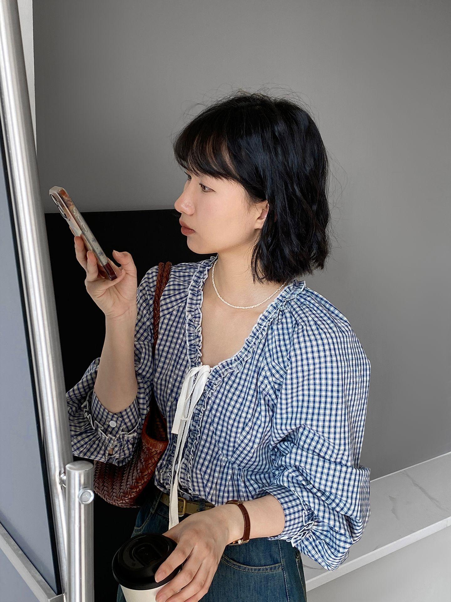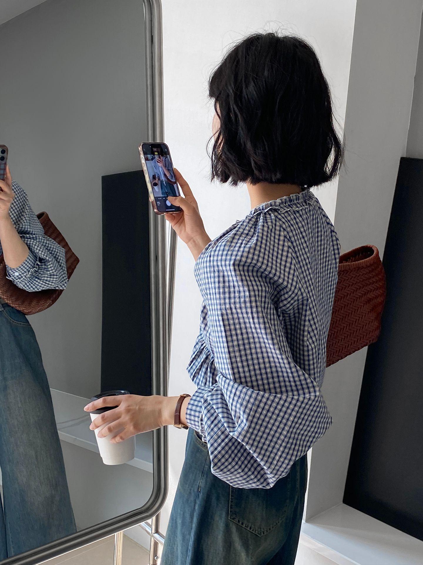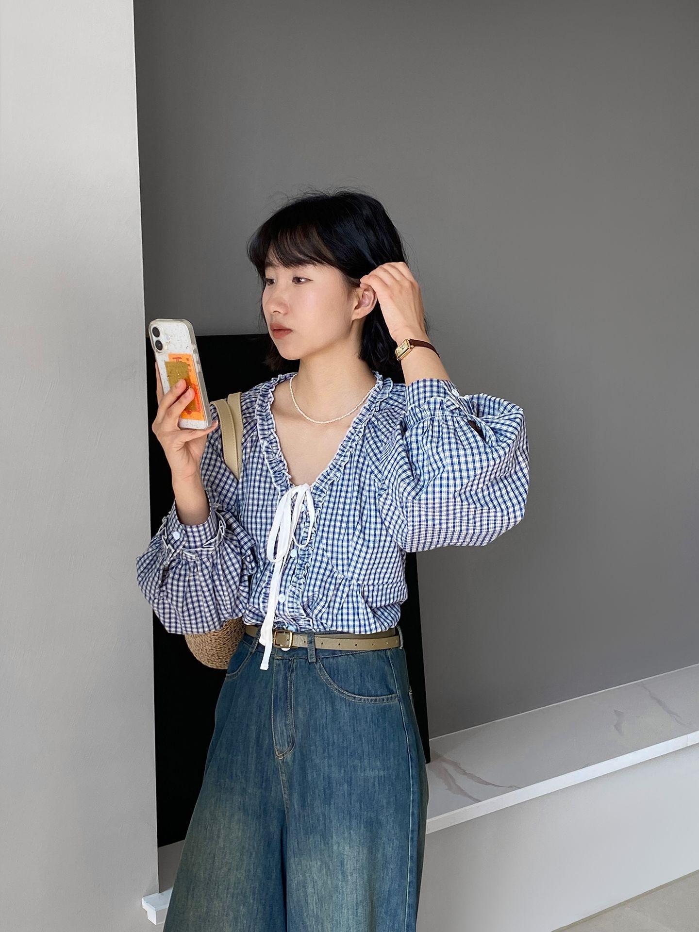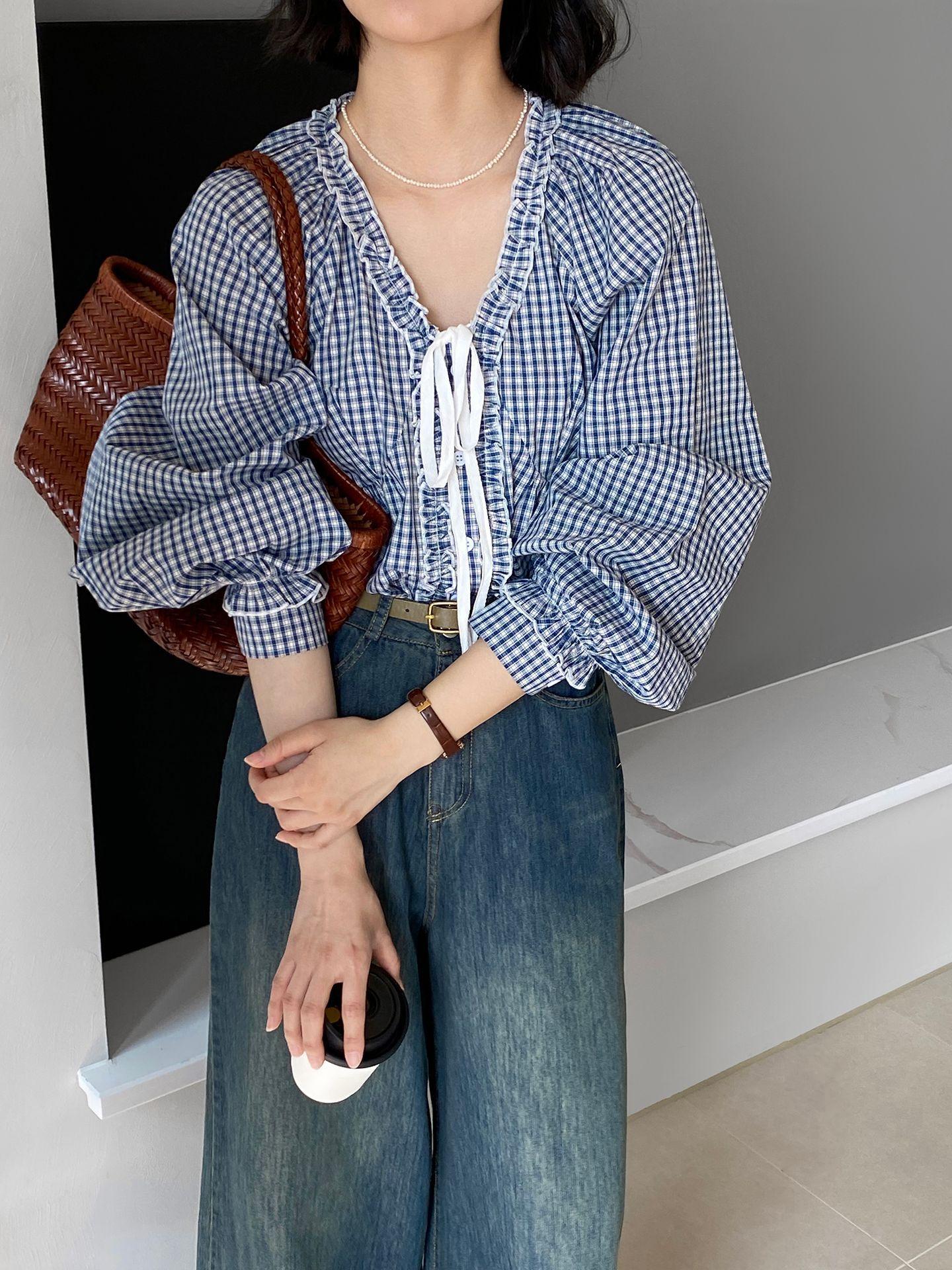 Jiangzuo [Sicilia Romántica] Camisa azul a cuadros para mujer, cuello en V, mangas abullonadas, top corto 1320