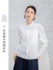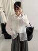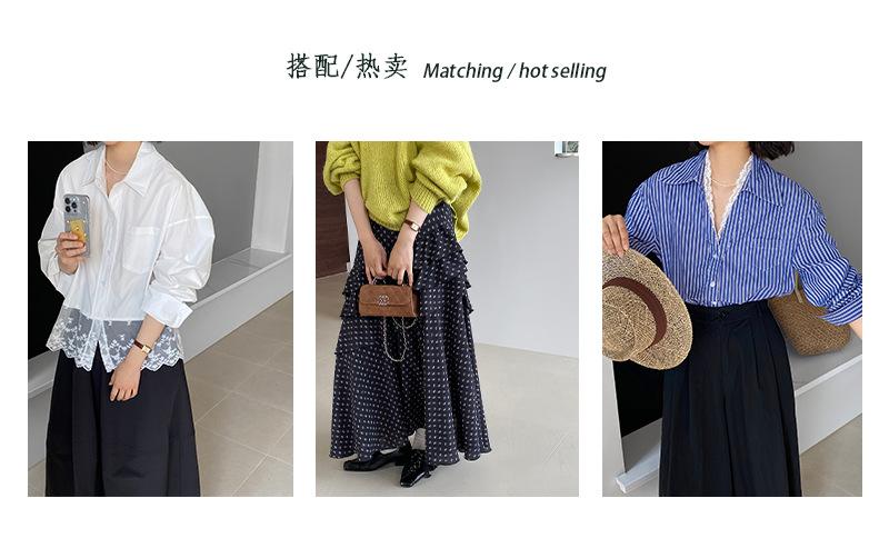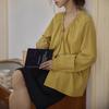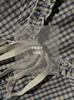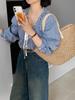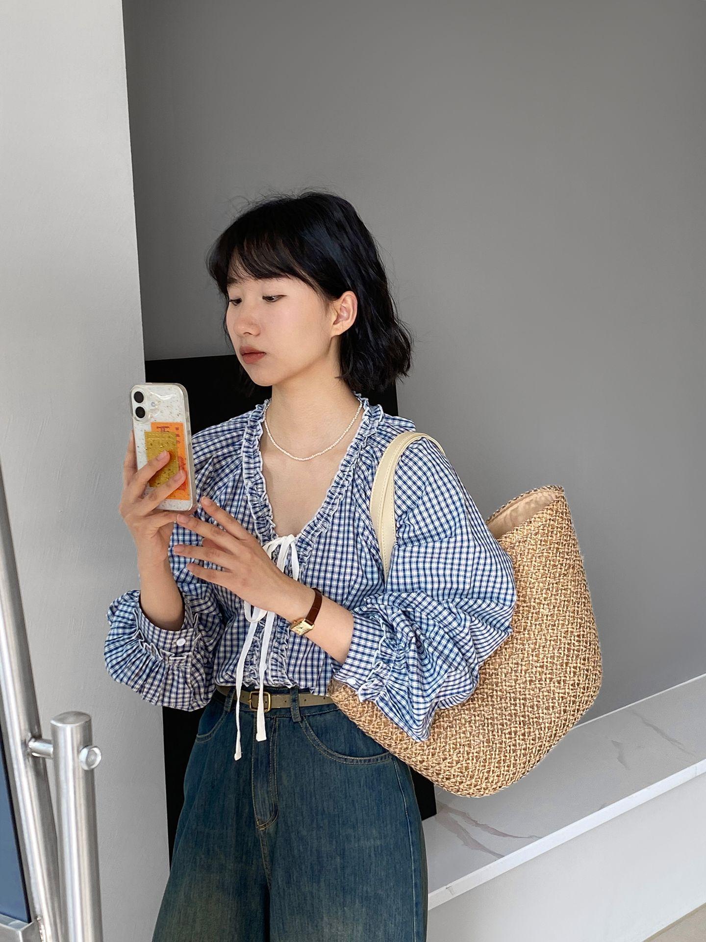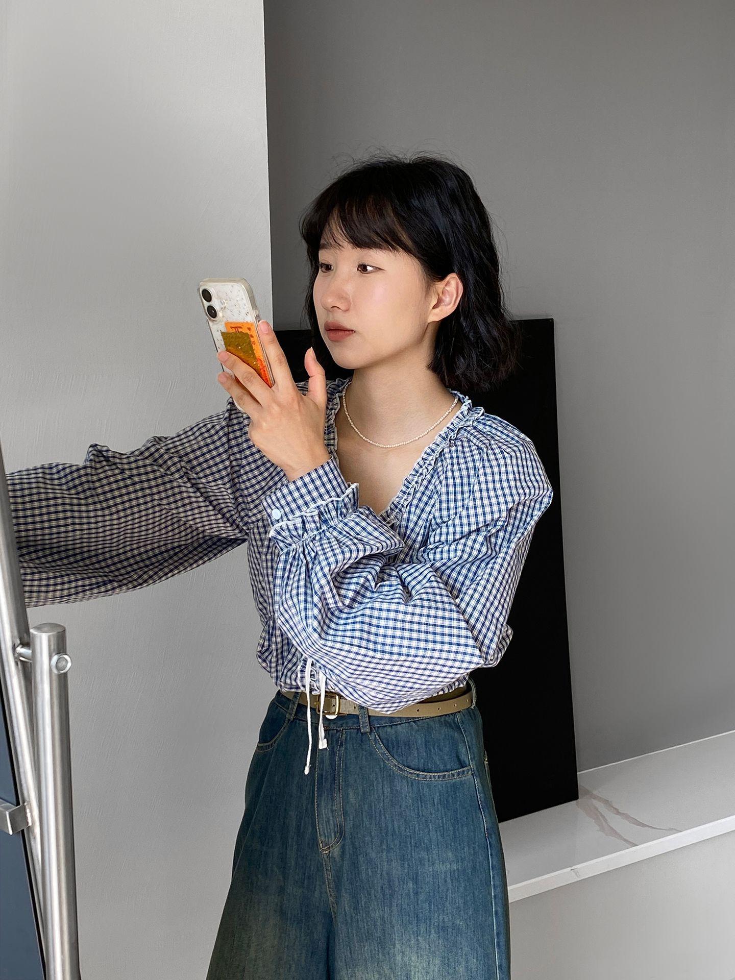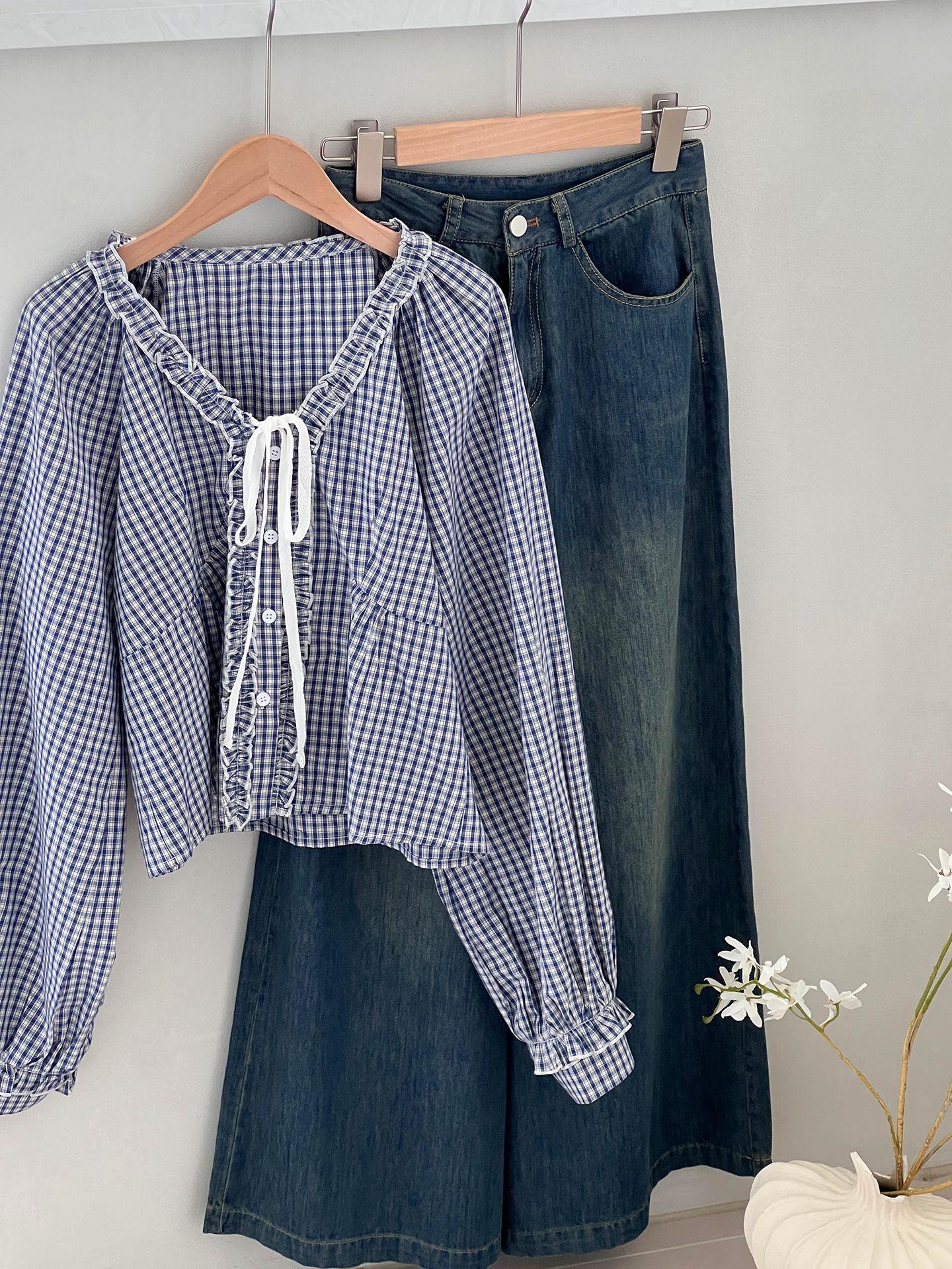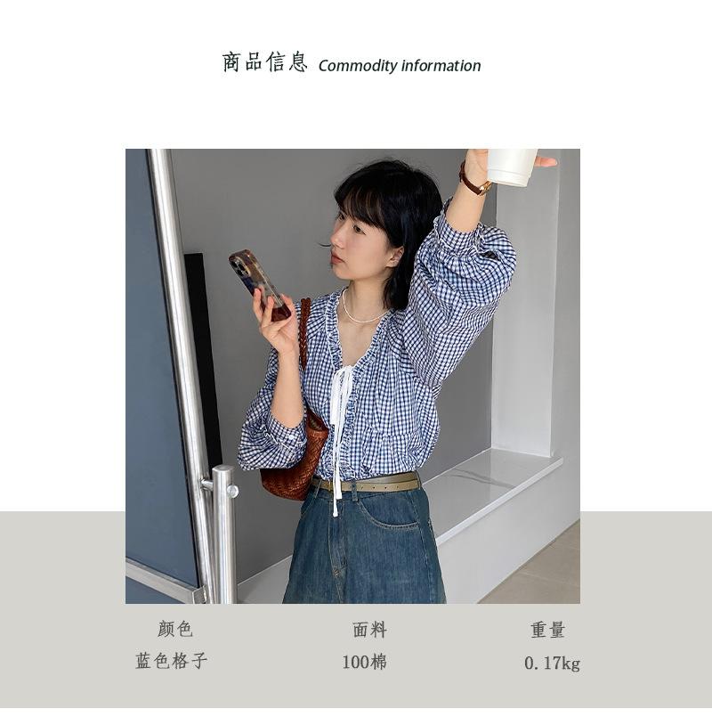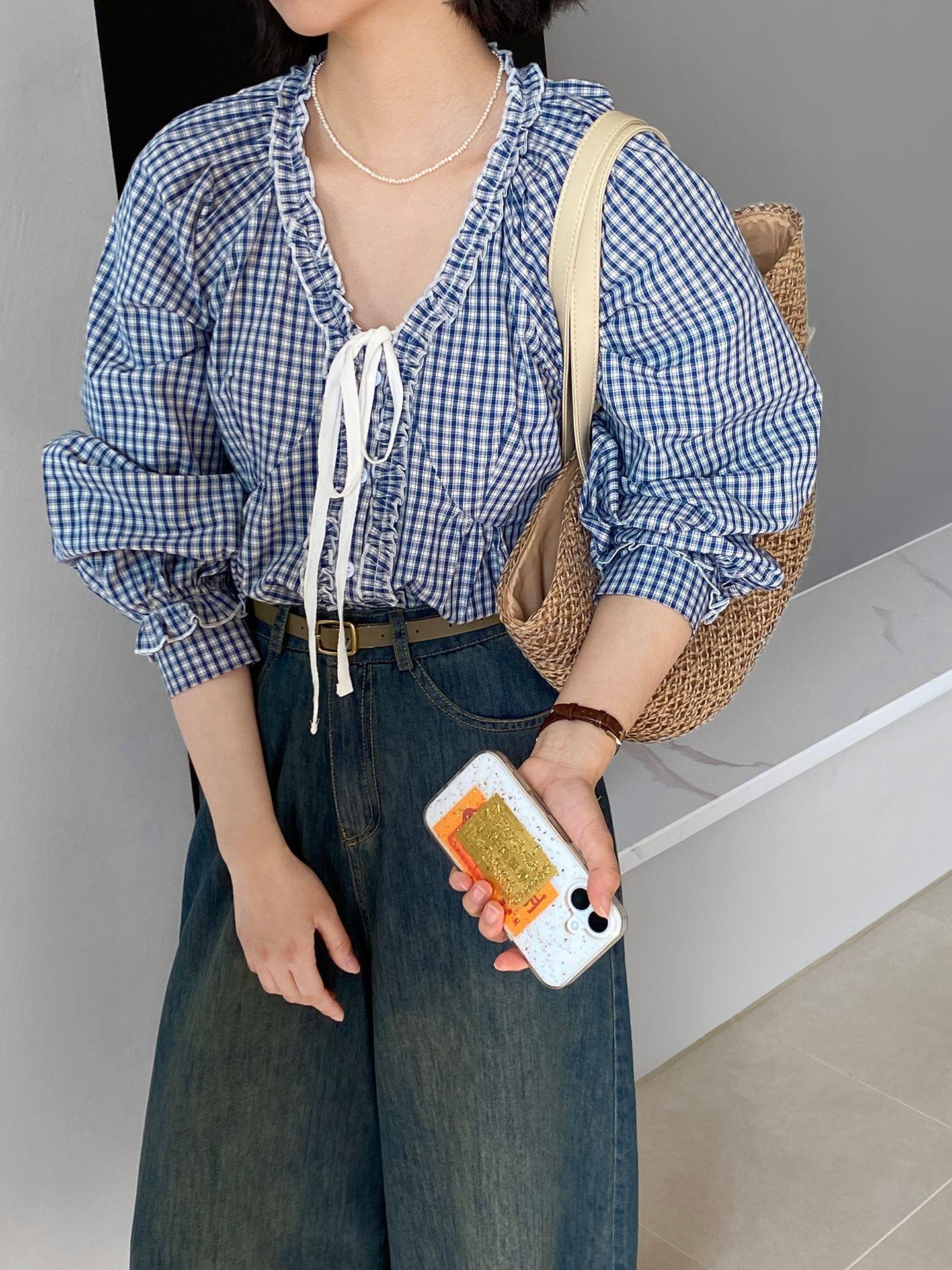 Jiangzuo [Sicilia Romántica] Camisa azul a cuadros para mujer, cuello en V, mangas abullonadas, top corto 1320
