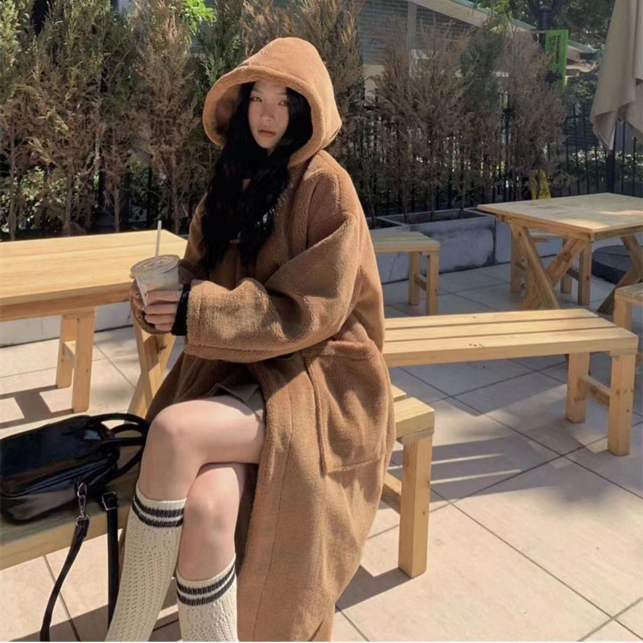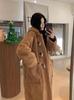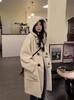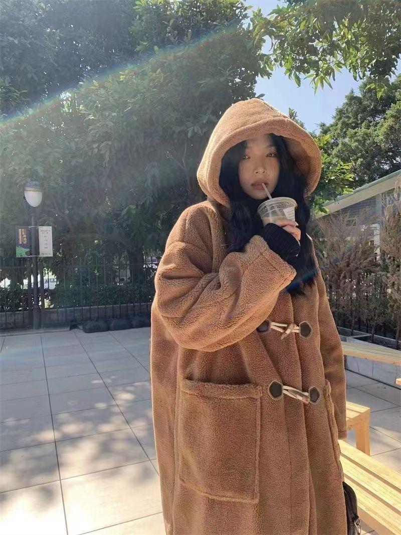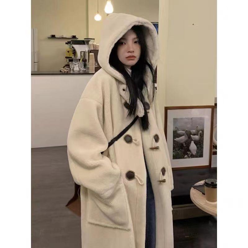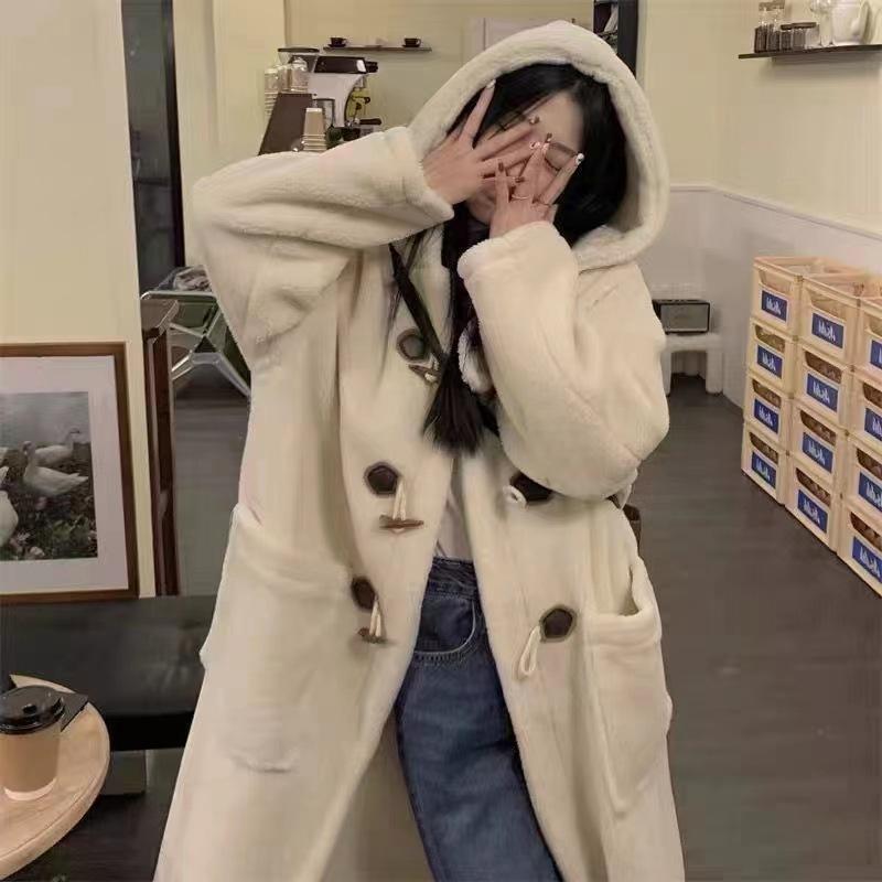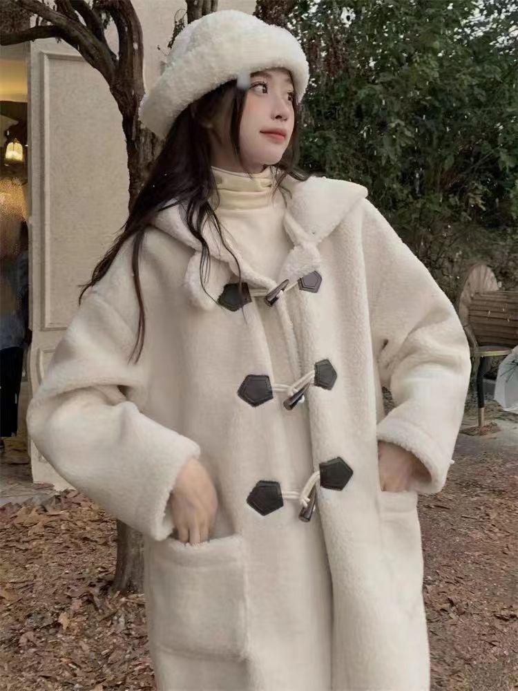 Abrigo de Lana de Cordero de Largo Medio con Botones de Cuerno para Mujer Otoño e Invierno 2025 Terciopelo de Cordero Estilo Preppy Cálido con Capucha