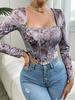 Top corto sexy de ombligo de manga larga con cuello cuadrado transfronterizo para mujer europea y americana, estampado floral, corte ajustado delgado, ropa de chica picante
