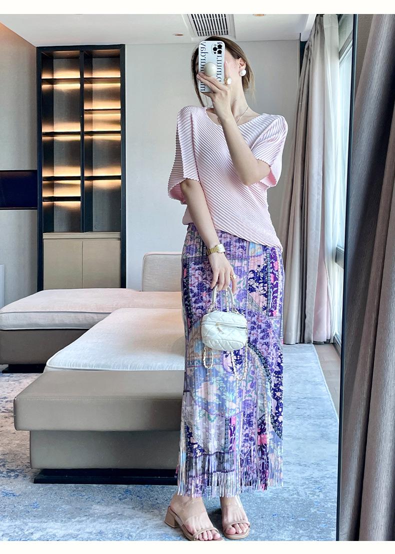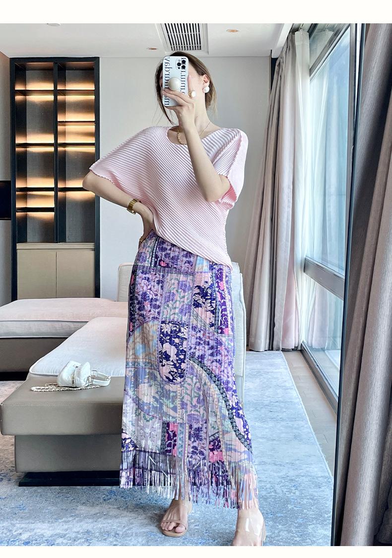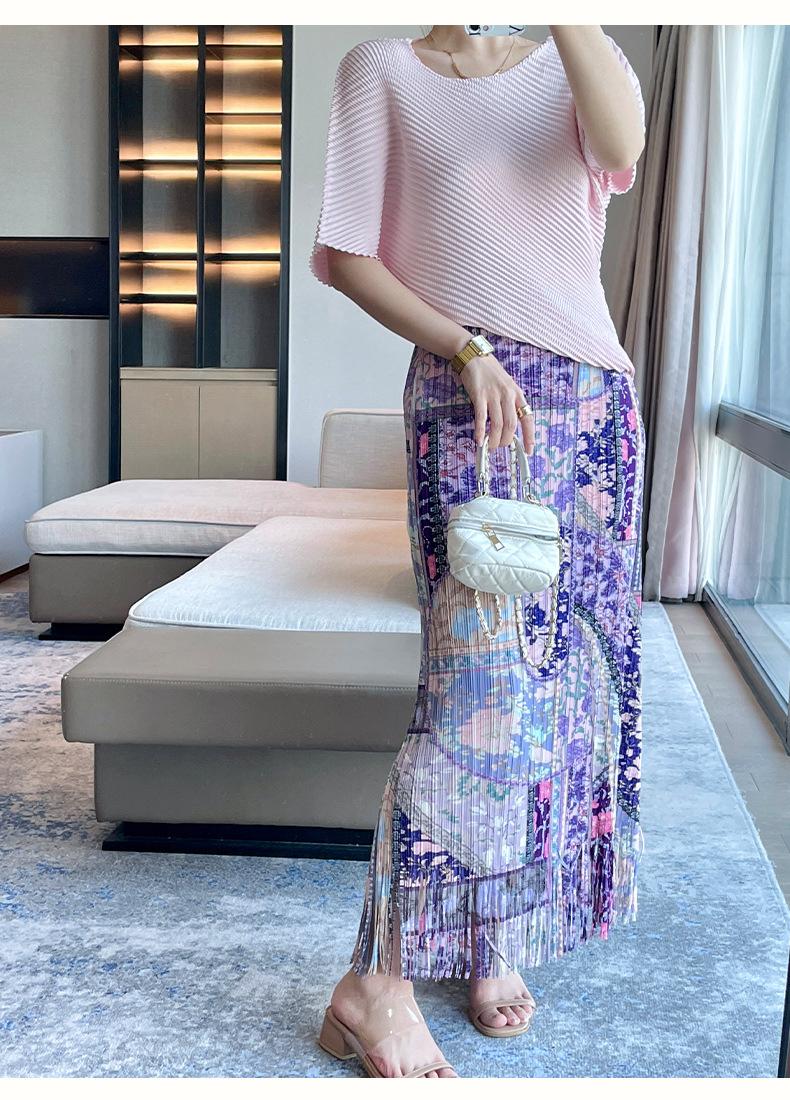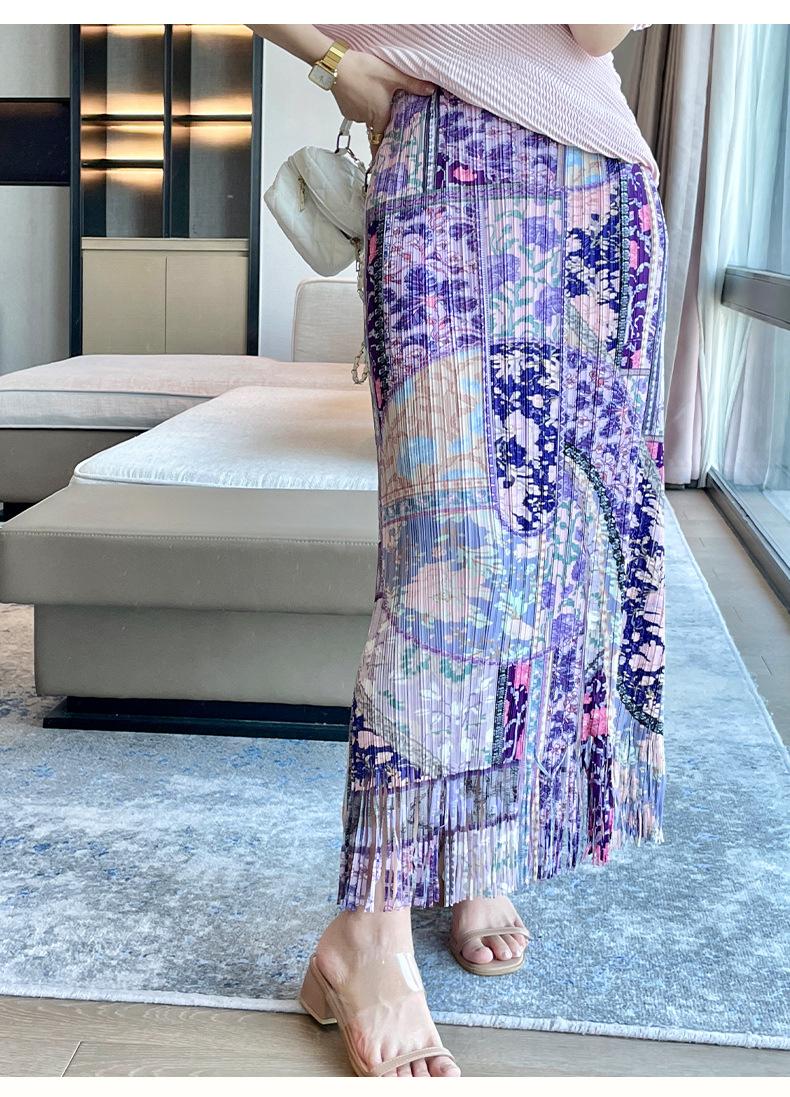 Falda Miyake Plisada Verano 2025 Nueva Morada Estampada Falda Suave de Cintura Alta Adelgazante a la Moda con Flecos